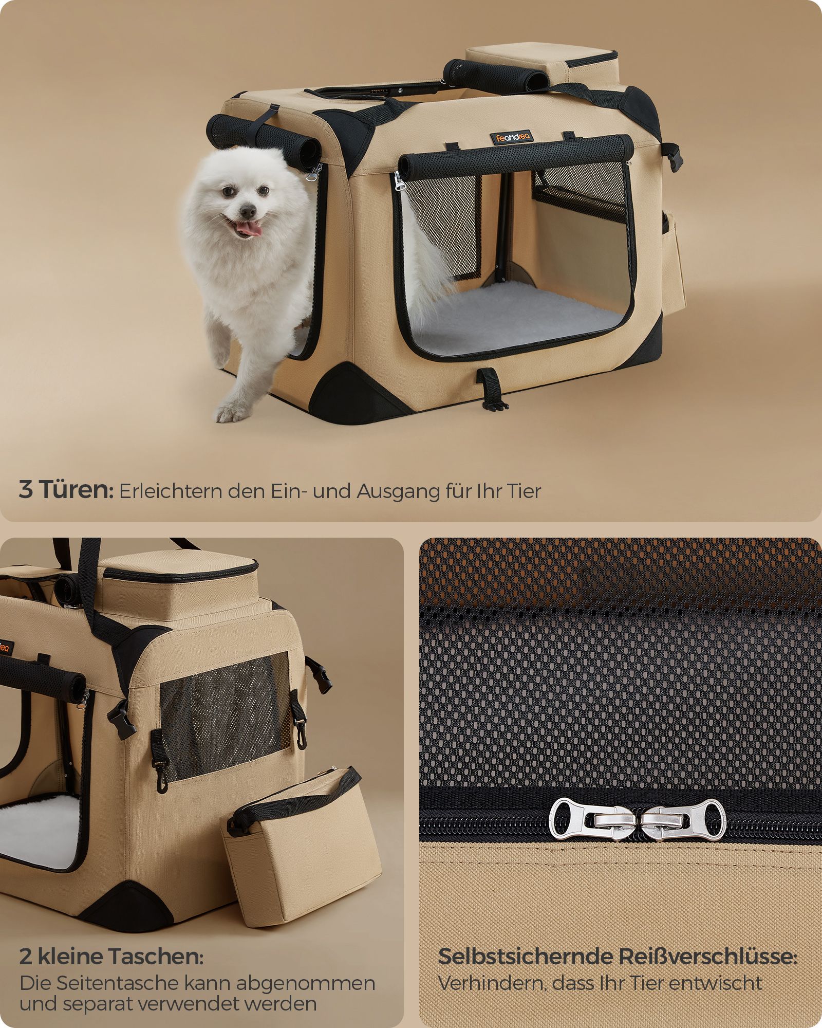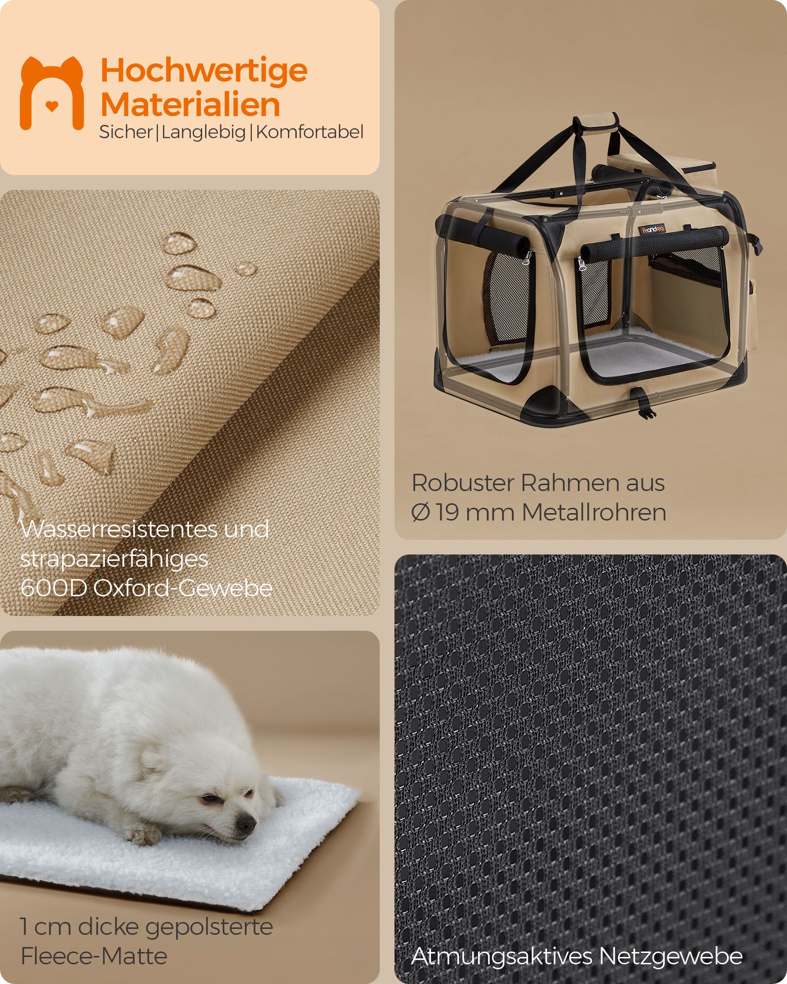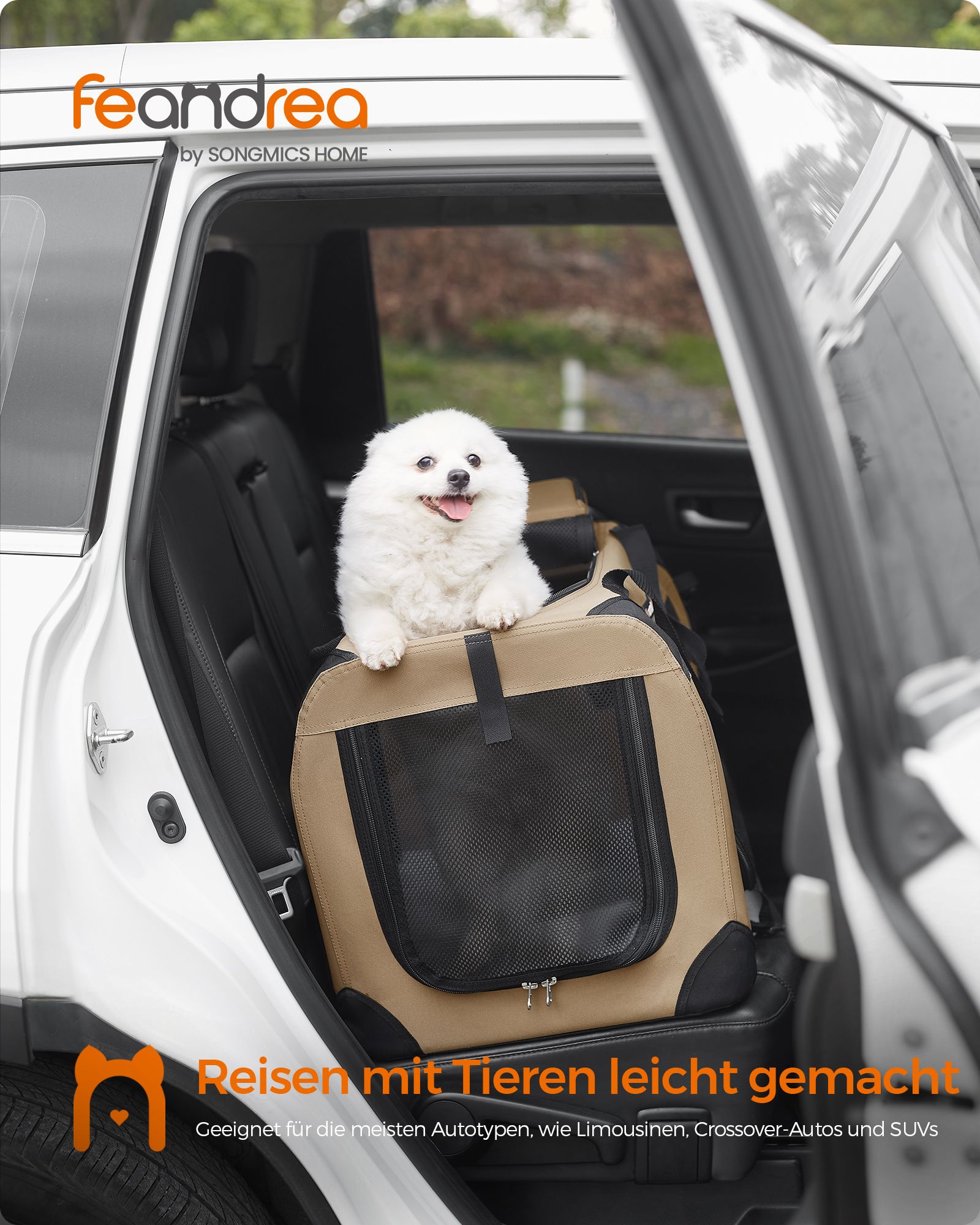 Feandrea foldbar hundeboks, transportboks til hunde, M, hundetaske, Oxford-stof, netstof, ?ndbar, b?rbar, transportabel, metalramme, med h?ndtag, lommer, 60 x 42 x 42 cm, r?ggr? PDC060G02
