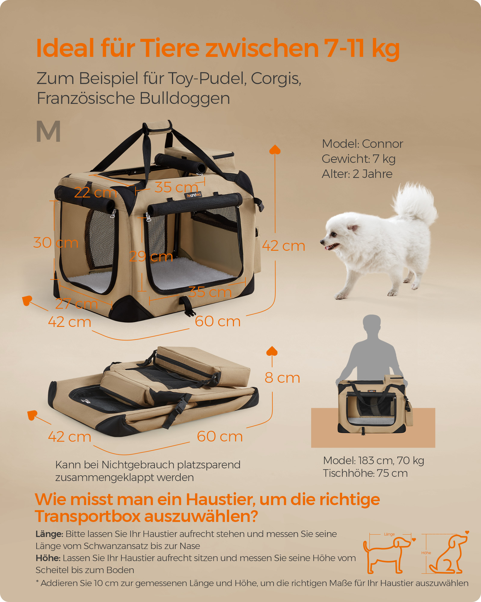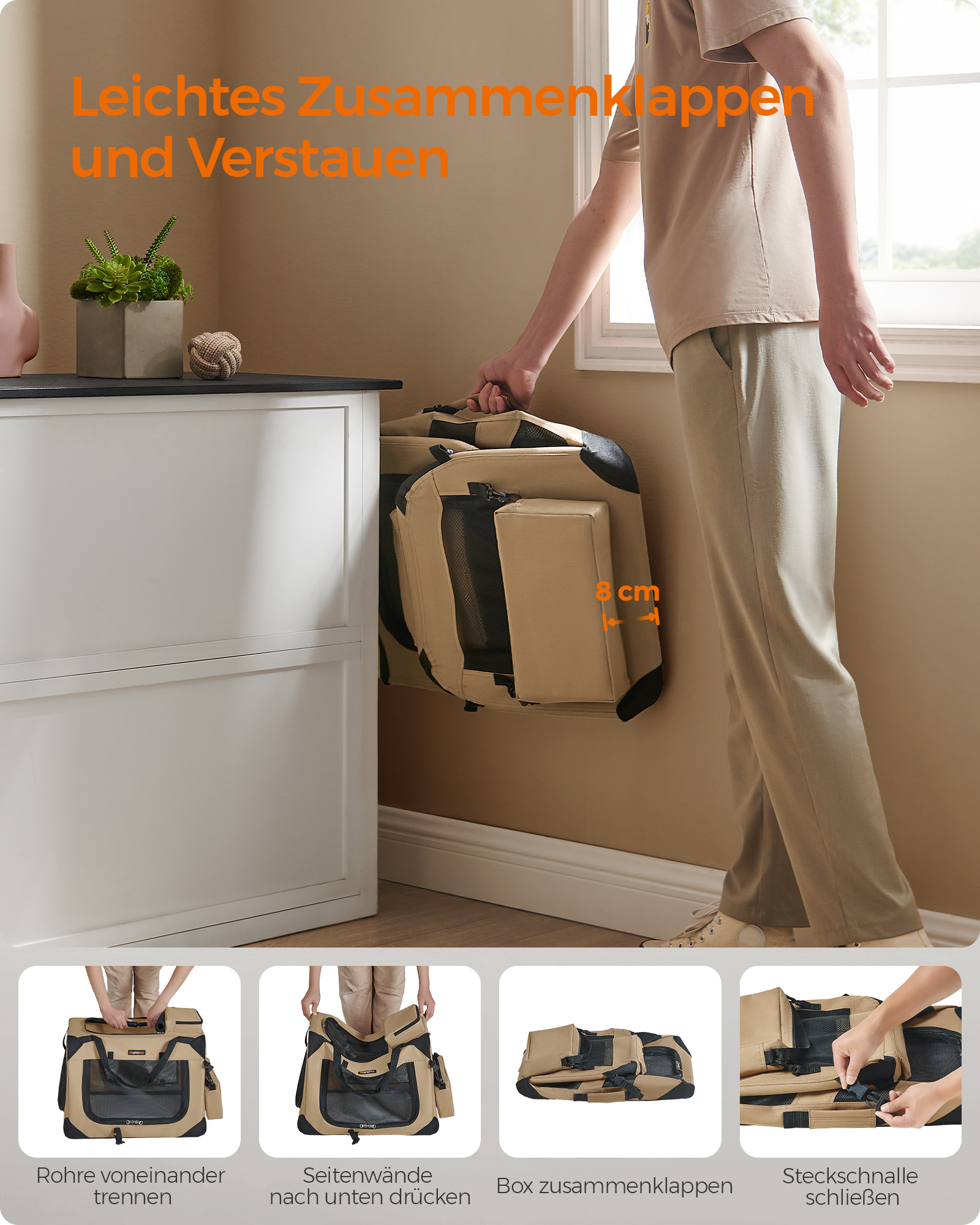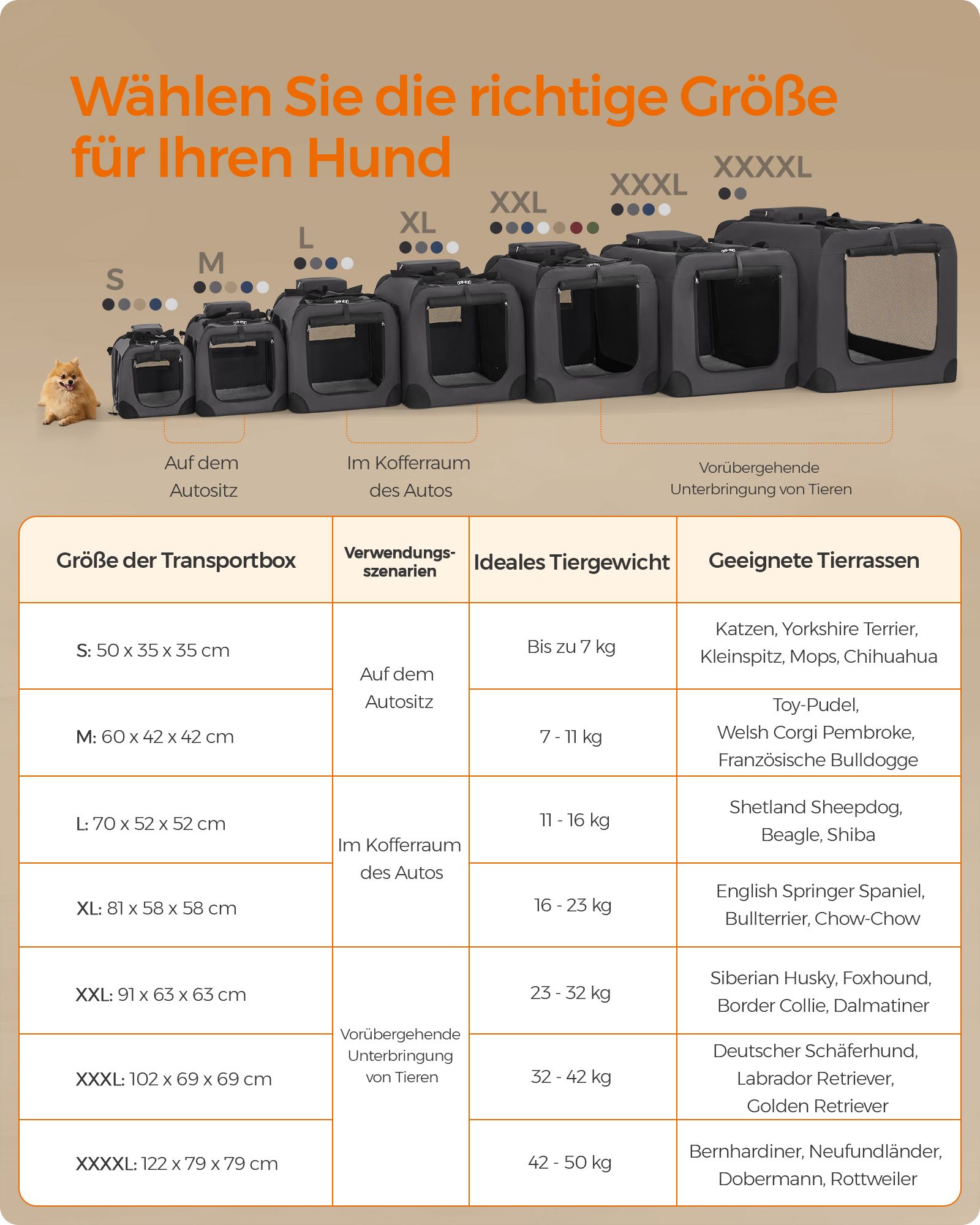 Feandrea foldbar hundeboks, transportboks til hunde, M, hundetaske, Oxford-stof, netstof, ?ndbar, b?rbar, transportabel, metalramme, med h?ndtag, lommer, 60 x 42 x 42 cm, r?ggr? PDC060G02