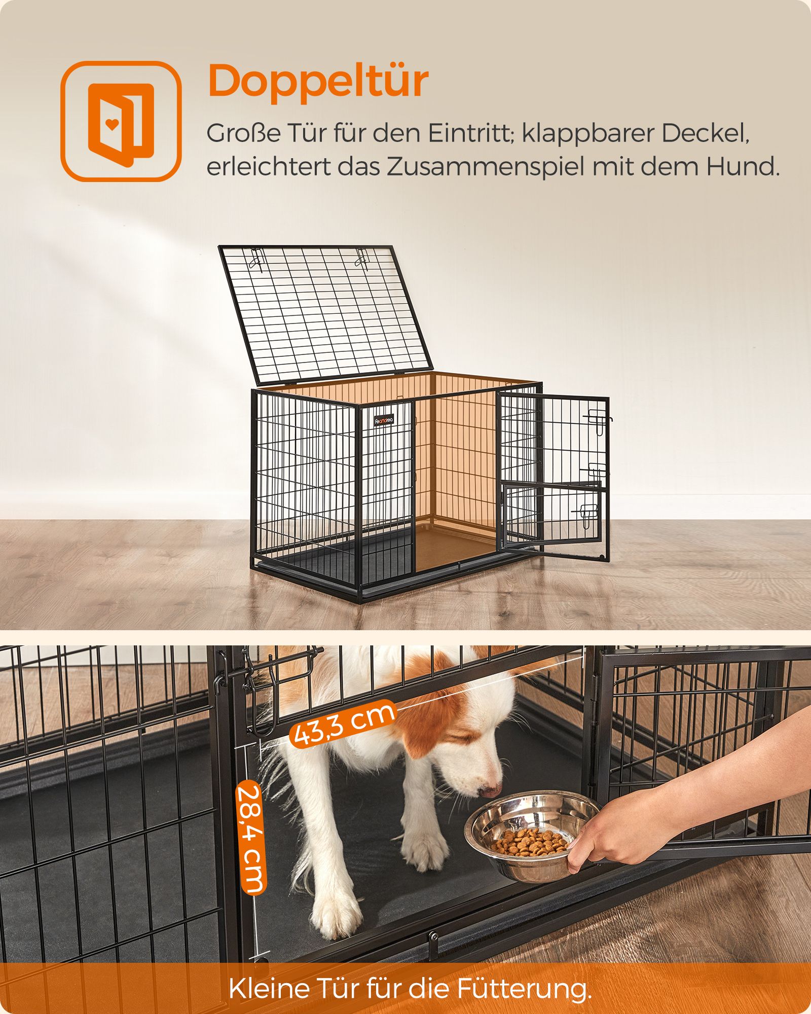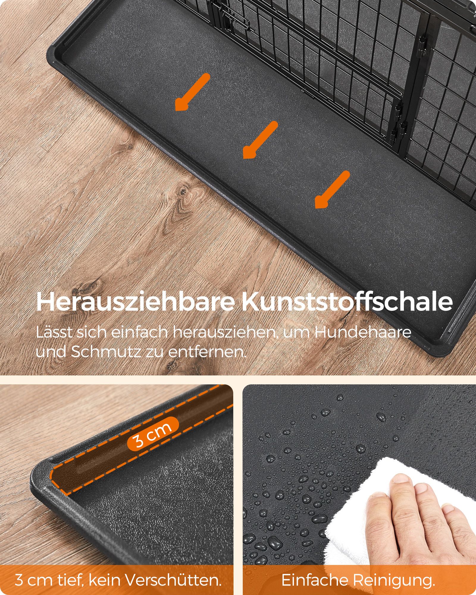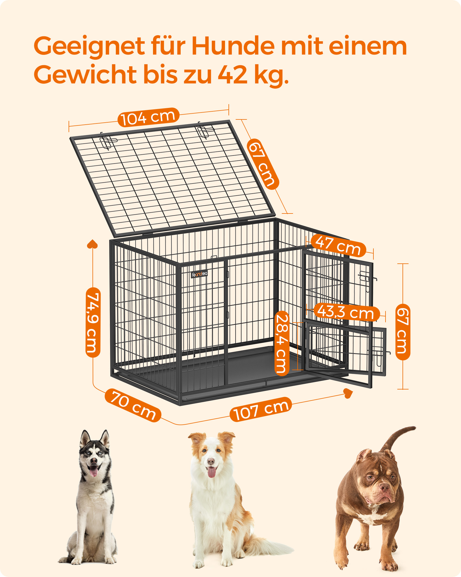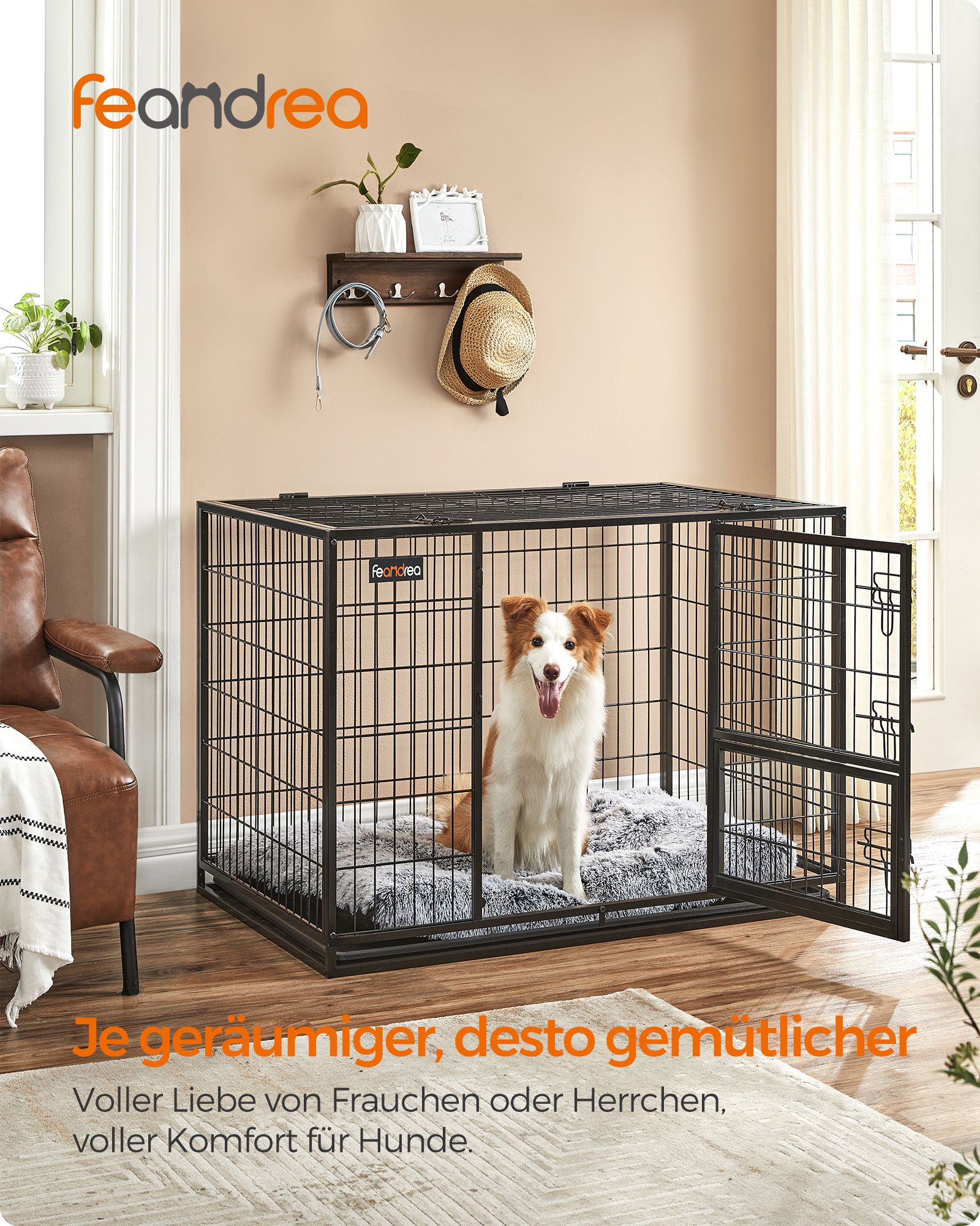 H?jdepunkterne ved denne FEANDREA hundebur p? et ?jeblik: – Holdbar: Fremstillet af forst?rket metaltr?d og er robust og rustbestandig. – Aftagelige dele: D?ren og den ?verste gitterplade kan tages af for at g?re det lettere for ejeren at interagere med sit k?ledyr. – Sikker: Dobbeltd?r med 5 L-formede l?se. – Nem montering: Stram de 8 medf?lgende skruer for at samle metalburet. – Ren: Hundeburet til hjemmet har en plastsk?l, der nemt kan tages ud og reng?res. – Luftigt: Takket v?re gitterkonstruktionen giver dette bur din hund et luftigt rum, og du kan altid holde ?je med din hund. Produktdetaljer: – Farve: Sort – Materiale: St?l – Produktst?rrelse: 107 x 70 x 74,9 cm (L x B x H) – St?rrelse p? den store d?r: 47 x 67 cm (L x B) – St?rrelse p? den lille d?r: 43,3 x 28,4 cm (L x B) – St?rrelse p? den ?verste gitterplade: 104 x 67 cm (L x B) – V?gt: 18,8 kg Leveringsomfang: – 1 x hundebur – 1 x plastsk?l FEANDREA Bem?rkninger: – Tip til valg af det rigtige hundebur: Lad din hund st? oprejst og m?l dens l?ngde fra haleroden til n?sen. Lad din hund sidde oprejst og m?l dens h?jde fra kronen til gulvet. Tilf?j derefter 10 cm til den m?lte l?ngde og h?jde for at v?lge de rigtige m?l til din hund. – Hundeburens m?l kan variere med 1-2 cm p? grund af forskellige m?lemetoder. – Lad ikke din hund g? ind i buret med halsb?nd eller snor.
