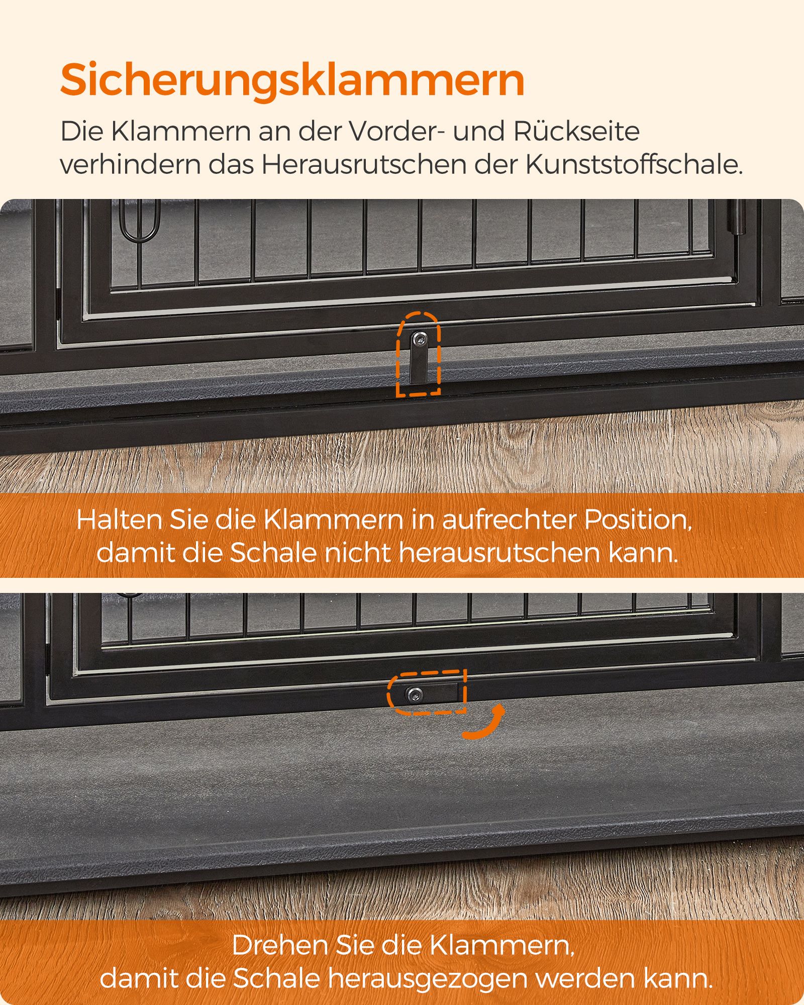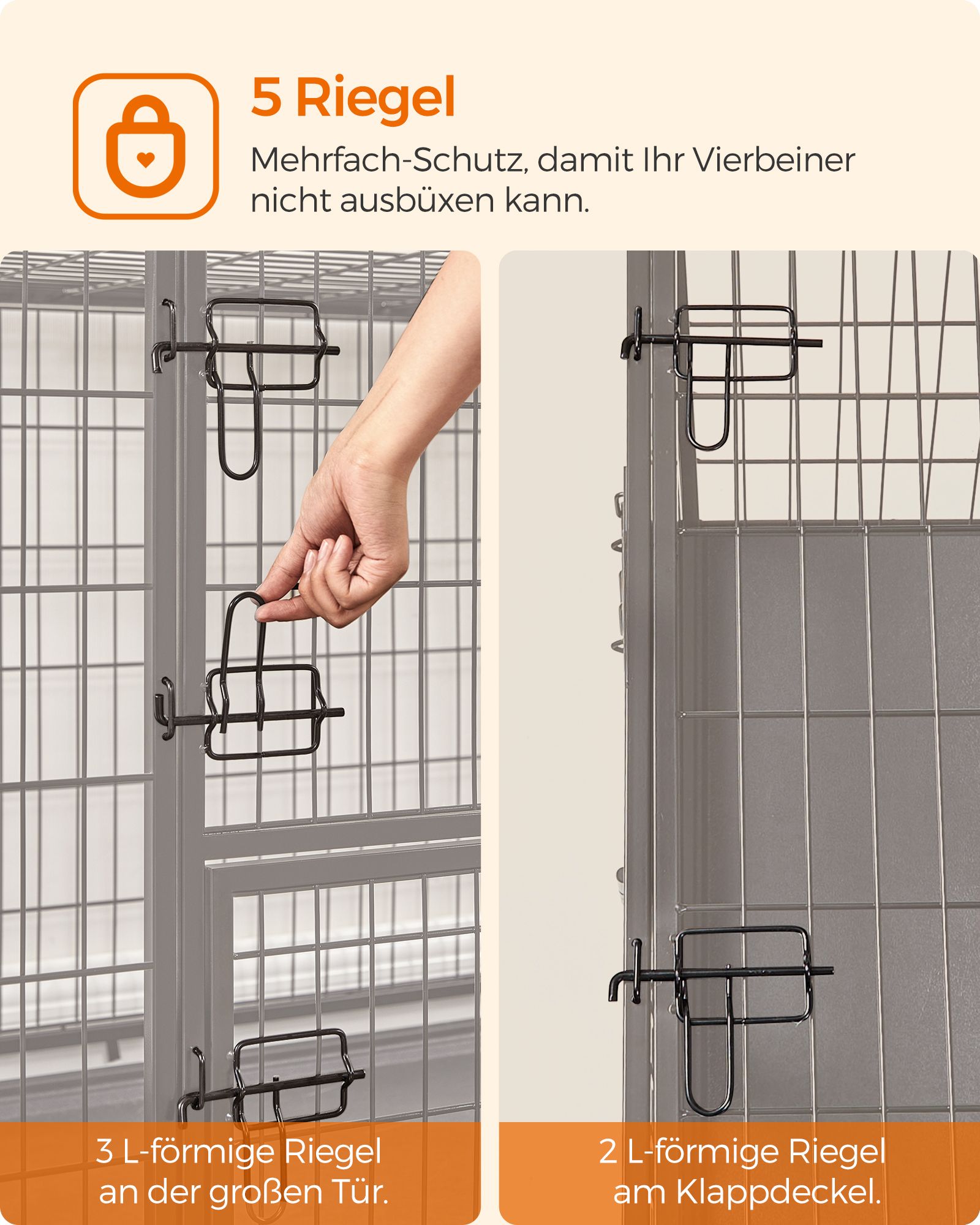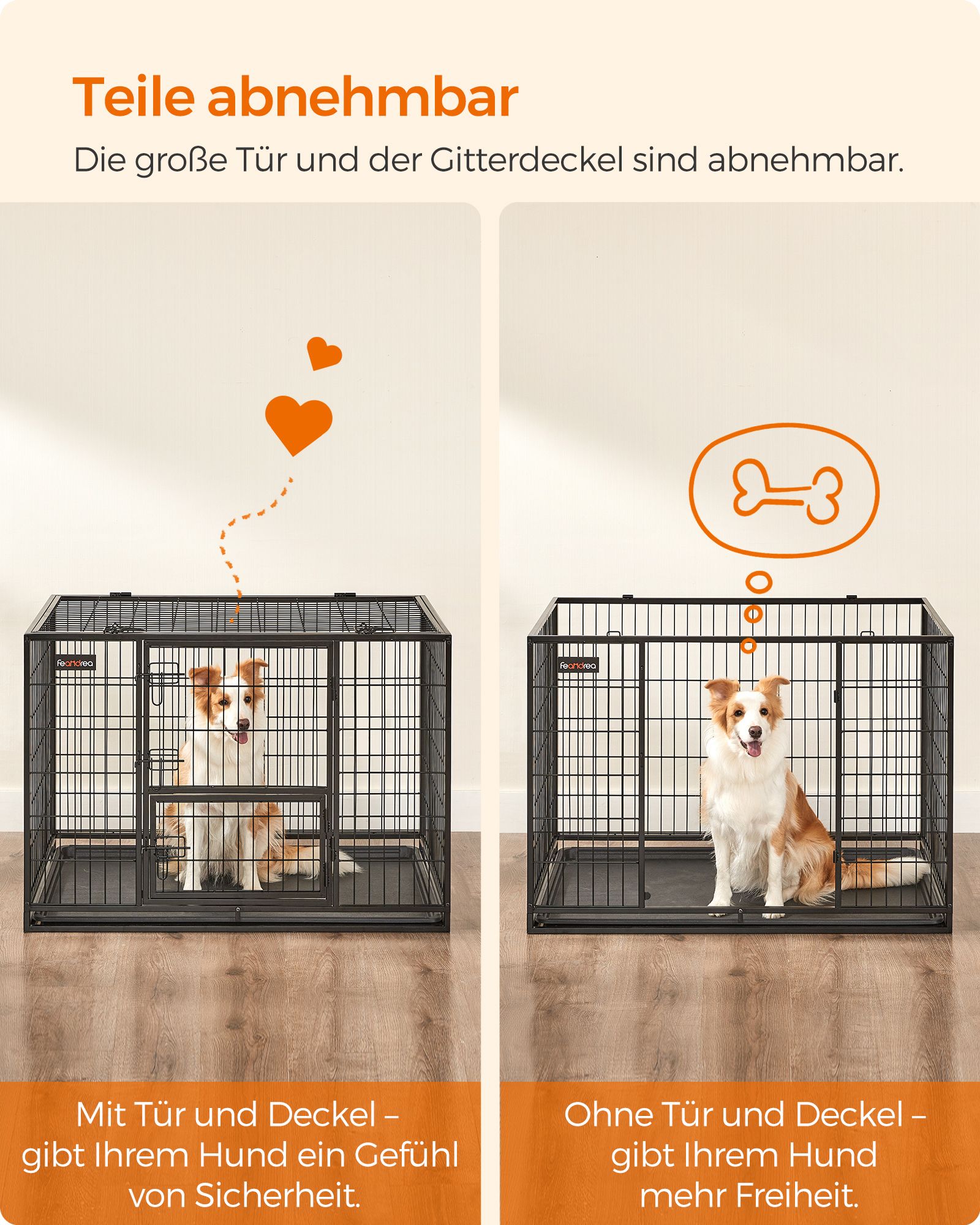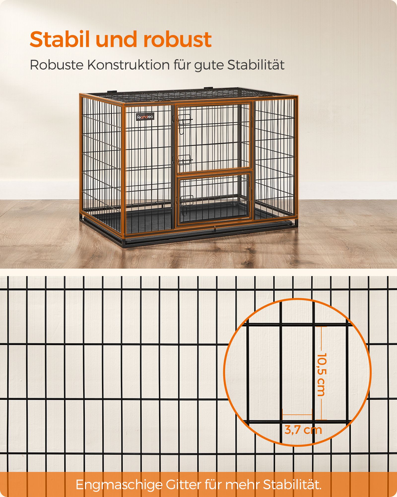 H?jdepunkterne ved denne FEANDREA hundebur p? et ?jeblik: – Holdbar: Fremstillet af forst?rket metaltr?d og er robust og rustbestandig. – Aftagelige dele: D?ren og den ?verste gitterplade kan tages af for at g?re det lettere for ejeren at interagere med sit k?ledyr. – Sikker: Dobbeltd?r med 5 L-formede l?se. – Nem montering: Stram de 8 medf?lgende skruer for at samle metalburet. – Ren: Hundeburet til hjemmet har en plastsk?l, der nemt kan tages ud og reng?res. – Luftigt: Takket v?re gitterkonstruktionen giver dette bur din hund et luftigt rum, og du kan altid holde ?je med din hund. Produktdetaljer: – Farve: Sort – Materiale: St?l – Produktst?rrelse: 107 x 70 x 74,9 cm (L x B x H) – St?rrelse p? den store d?r: 47 x 67 cm (L x B) – St?rrelse p? den lille d?r: 43,3 x 28,4 cm (L x B) – St?rrelse p? den ?verste gitterplade: 104 x 67 cm (L x B) – V?gt: 18,8 kg Leveringsomfang: – 1 x hundebur – 1 x plastsk?l FEANDREA Bem?rkninger: – Tip til valg af det rigtige hundebur: Lad din hund st? oprejst og m?l dens l?ngde fra haleroden til n?sen. Lad din hund sidde oprejst og m?l dens h?jde fra kronen til gulvet. Tilf?j derefter 10 cm til den m?lte l?ngde og h?jde for at v?lge de rigtige m?l til din hund. – Hundeburens m?l kan variere med 1-2 cm p? grund af forskellige m?lemetoder. – Lad ikke din hund g? ind i buret med halsb?nd eller snor.