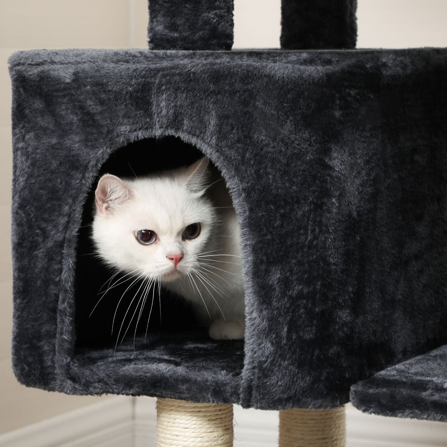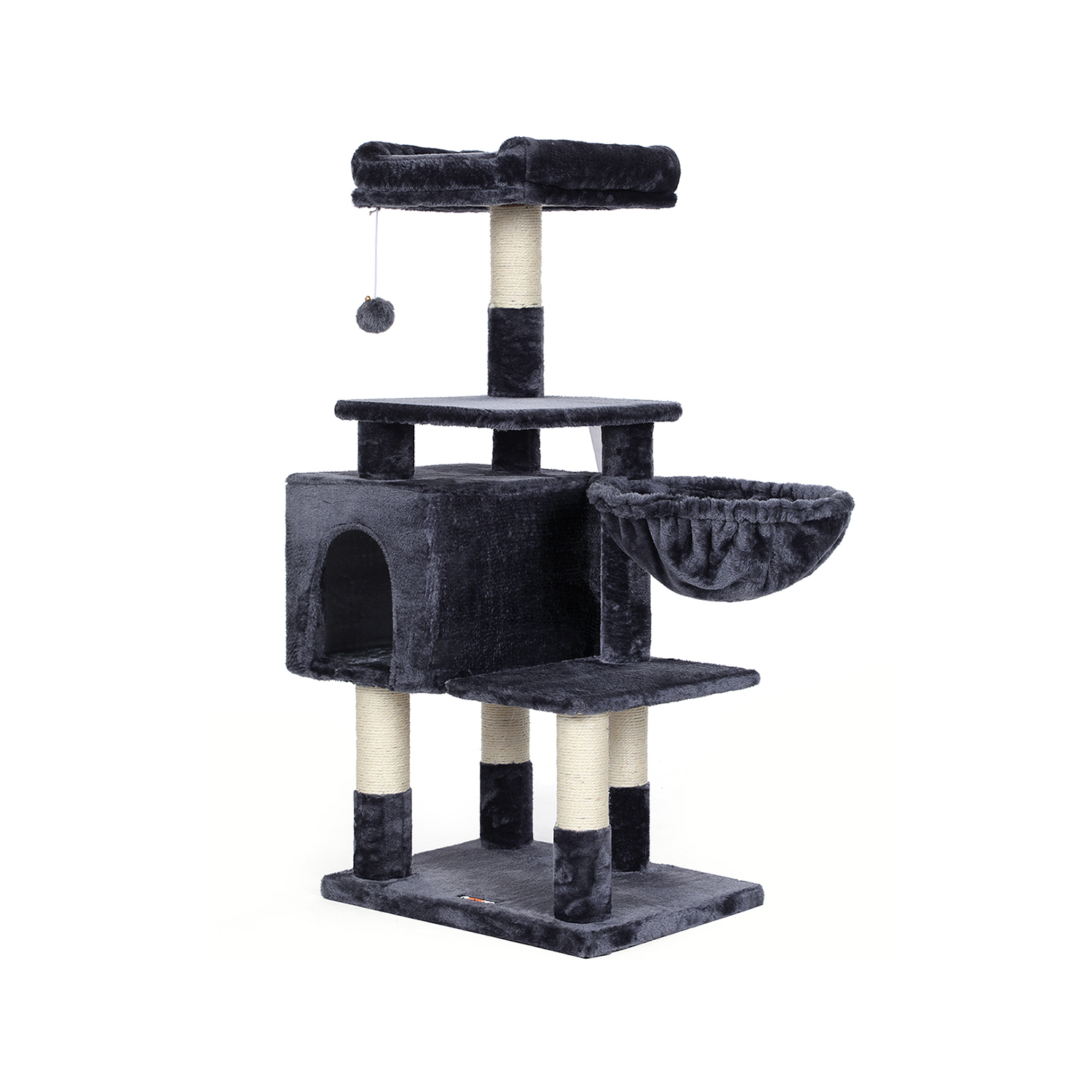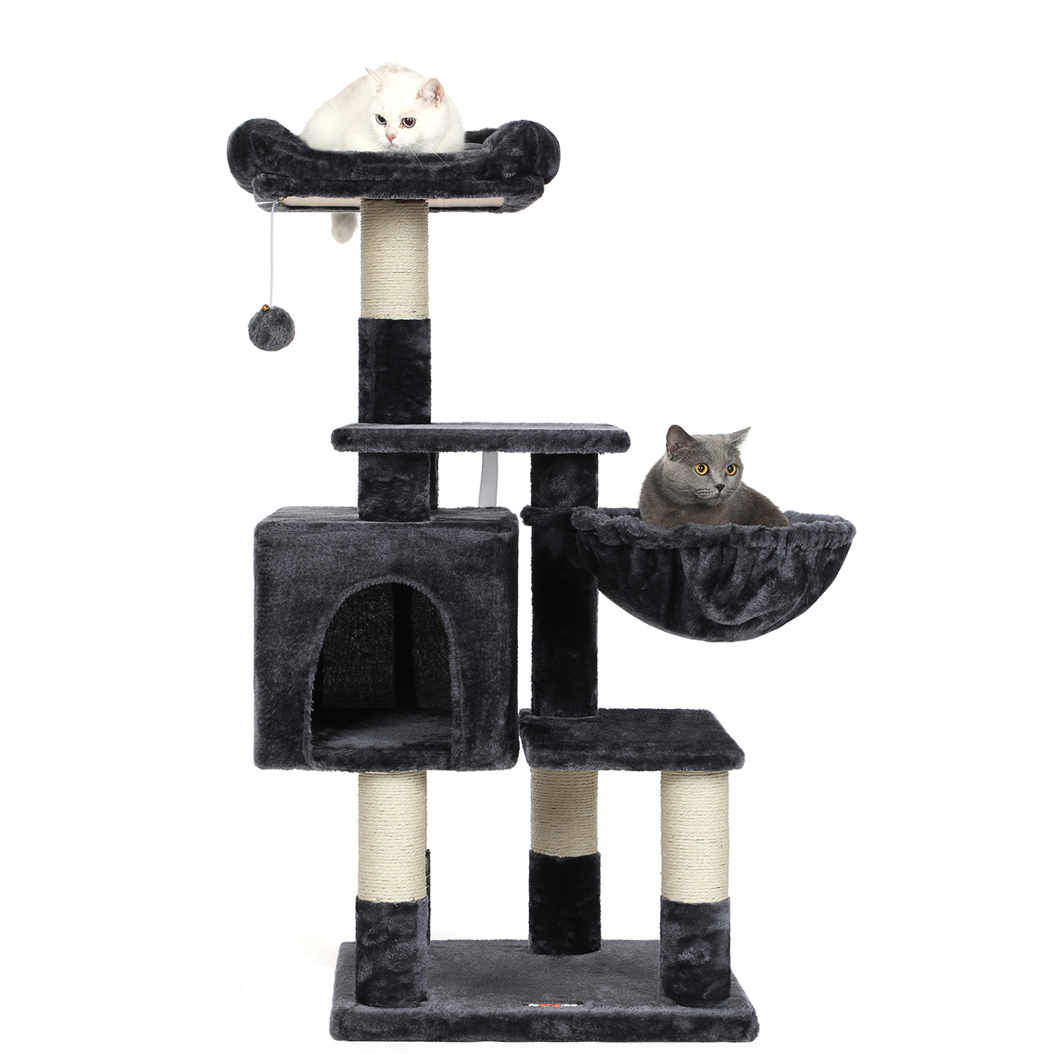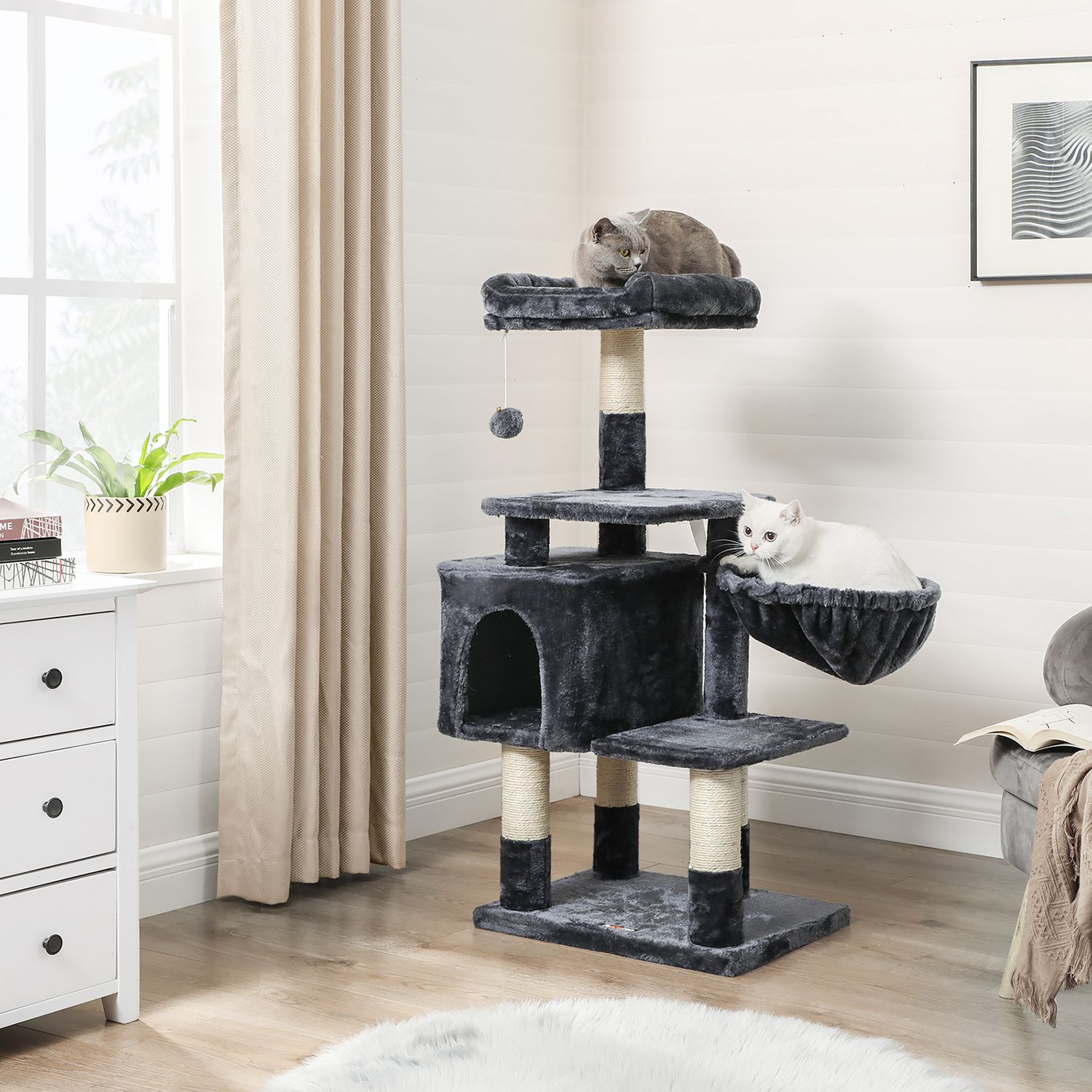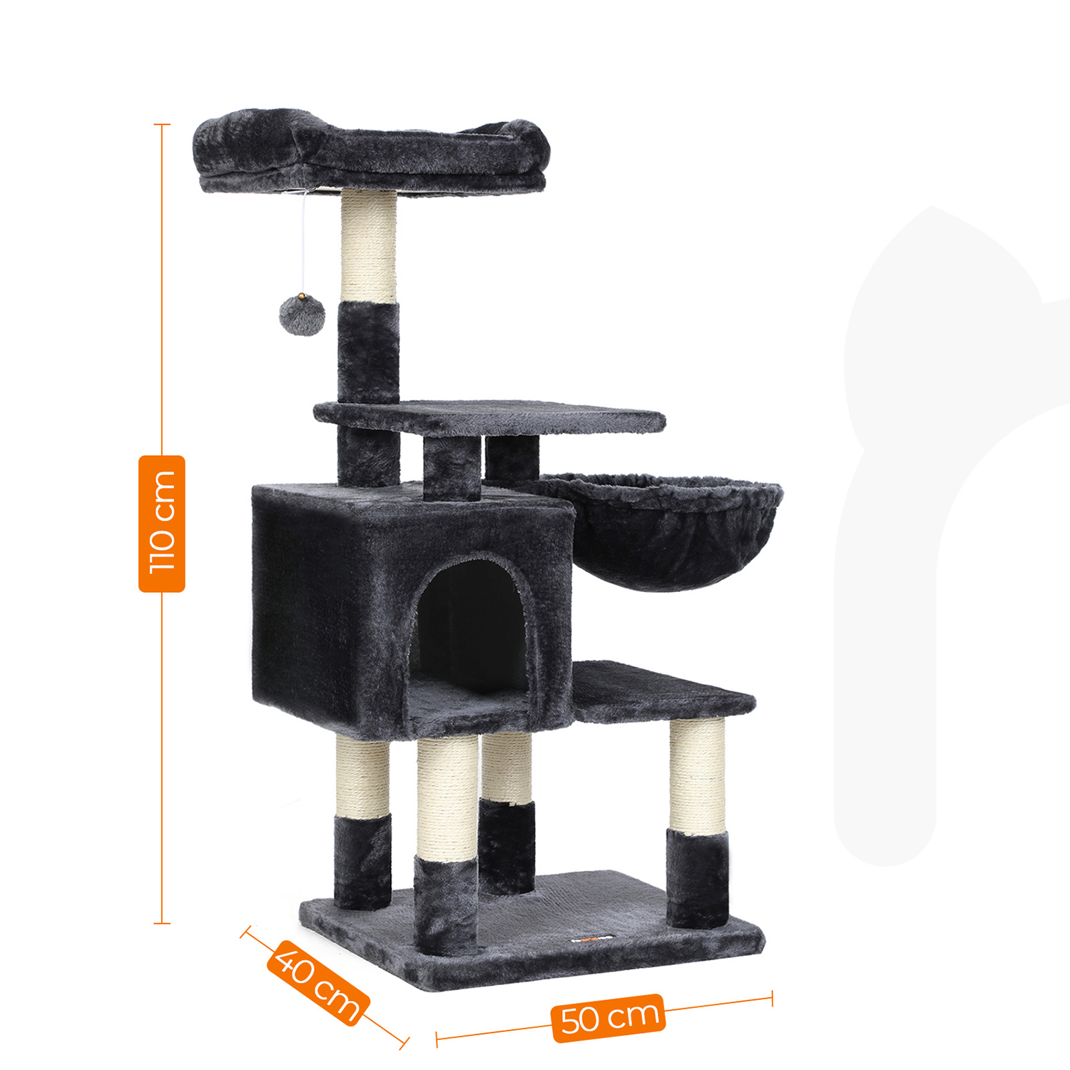 I FEANDREAs kreative v?rksteder springer to s?de killinger rundt, som personligt unders?ger alle kradsetr?er og giver deres dyriske feedback. P? den m?de f?r FEANDREAs designere f?rsteh?nds- eller rettere sagt f?rste-pote-information om, hvorvidt produkterne lever op til de fork?lede snorh?rede dyrs krav. H?jdepunkterne ved dette kradsetr? i oversigt: – Udstyret med adskillige klatreelementer; velegnet til katte i alle aldre – Rummelig, godt polstret udsigtsplatform – Gener?s hyggekurv og behagelig liggeplads – H?j stabilitet; har en bundplade forst?rket med tr?materiale – Vipbeskyttelse for ekstra sikkerhed Produktdetaljer:- Farve: R?ggr? – Materiale: Sp?nplade, plys, sisal – St?rrelse: 50 x 40 x 110 cm (L x B x H) – V?gt: 10,4 kg Leveringsomfang: – 1 x kradsetr? – 1 x vejledning (DE, EN, FR, ES, IT) FEANDREA Bem?rkninger:- Hvis din kat tygger p? pelsbolden eller elastikken, skal du straks fjerne dette tilbeh?r og opbevare det uden for dit k?ledyrs r?kkevidde. – Hvis den hyggelige hule er beskadiget, skal du straks kontakte os, s? dette element af kradsetr?et kan udskiftes, eller der kan findes en anden l?sning. Beskadigede dele kan for?rsage skader, s? udskift dem straks.