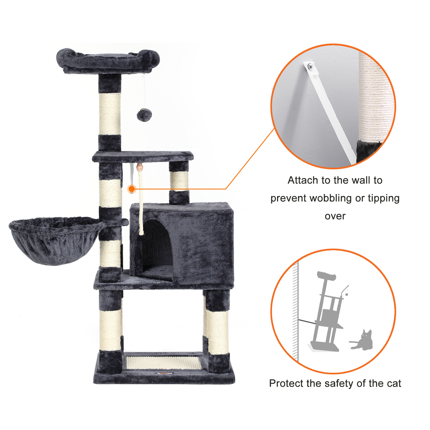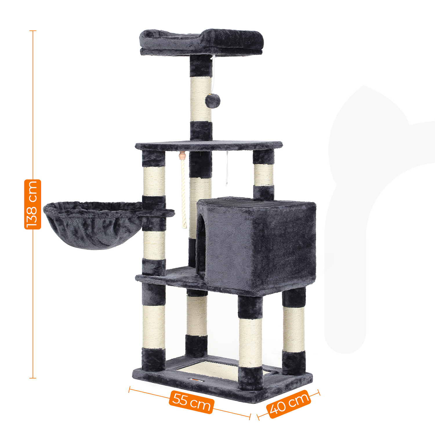 I FEANDREAs kreative v?rksteder springer to s?de killinger rundt, som personligt unders?ger alle kradsetr?er og giver deres dyriske feedback. P? den m?de f?r FEANDREAs designere f?rsteh?nds- eller rettere sagt f?rste-pote-information om, hvorvidt produkterne lever op til de fork?lede snorh?rede dyrs krav. Denne kradsetr?ets h?jdepunkter p? et blik: – Dejligt stort; g?r en eller flere katte glade – Sokkel forst?rket med tr?materiale og v?ltesikring for mere stabilitet og sikkerhed – Kradsebr?t til at slibe kl?erne- Godt polstret udsigtsplatform til afslapning – Behagelig hyggekurv til at gemme sig i – Stabil liggeplads til en lur – Pelsbolde og sisalreb for mere sjov – Betr?k af slidst?rkt, bl?dt plys Produktdetaljer: – Farve: R?ggr? – Materiale: Sp?nplade, plys, sisal, stolper af forst?rket pap – St?rrelse: 55 x 40 x 138 cm (L x B x H) – V?gt: 13,5 kg Leveringsomfang: – 1 x kradsetr? – 1 x v?ltesikring – 1 x vejledning (DE, EN, FR, ES, IT) FEANDREA Bem?rkninger:- Placer kradsetr?et t?t p? en v?g og brug det p? et plant underlag. – Brug ikke kradsetr?et i fugtige omgivelser. – B?rn m? ikke klatre p? eller lege med produktet. – Vi anbefaler, at produktet fastg?res til v?ggen med den medf?lgende v?gbeskyttelse.