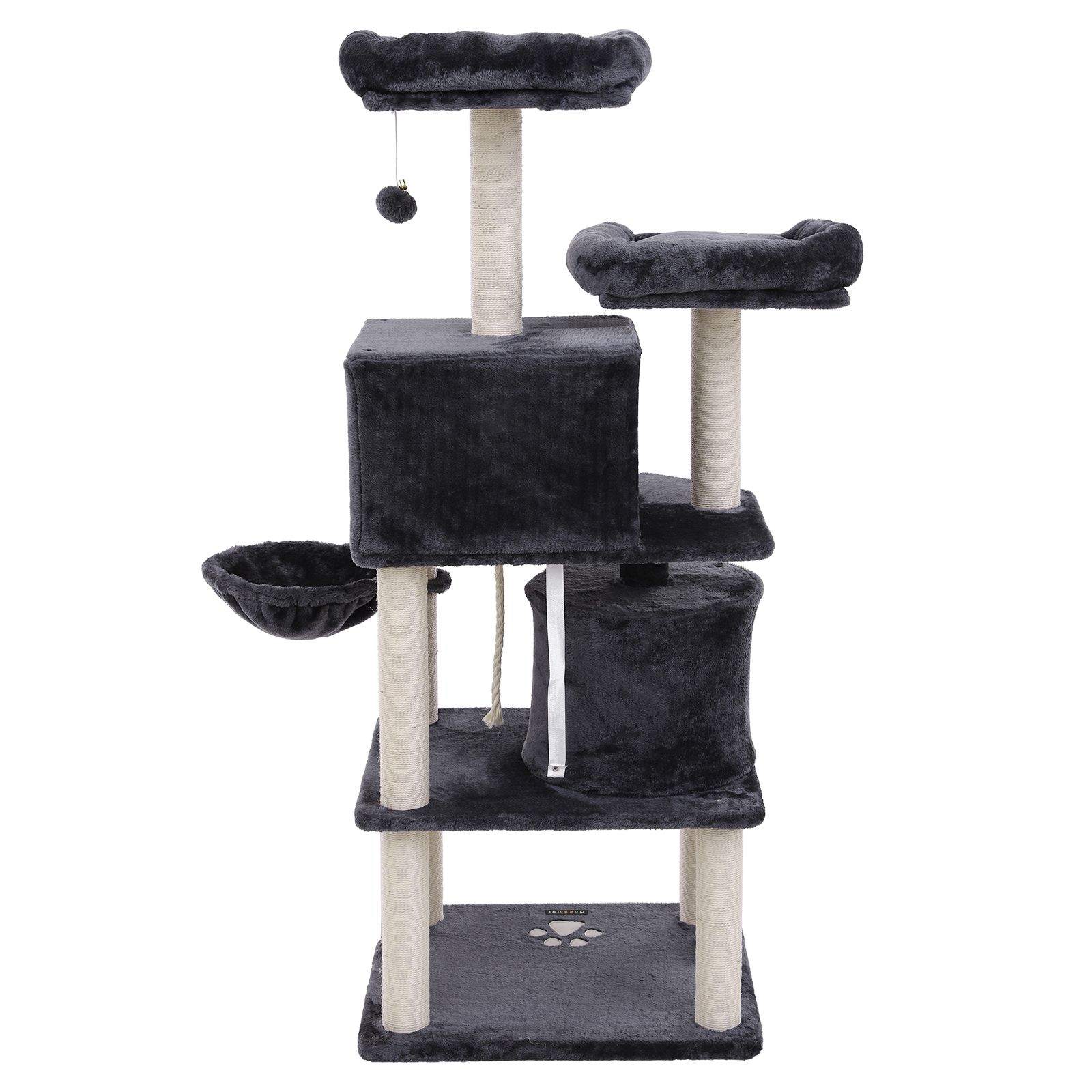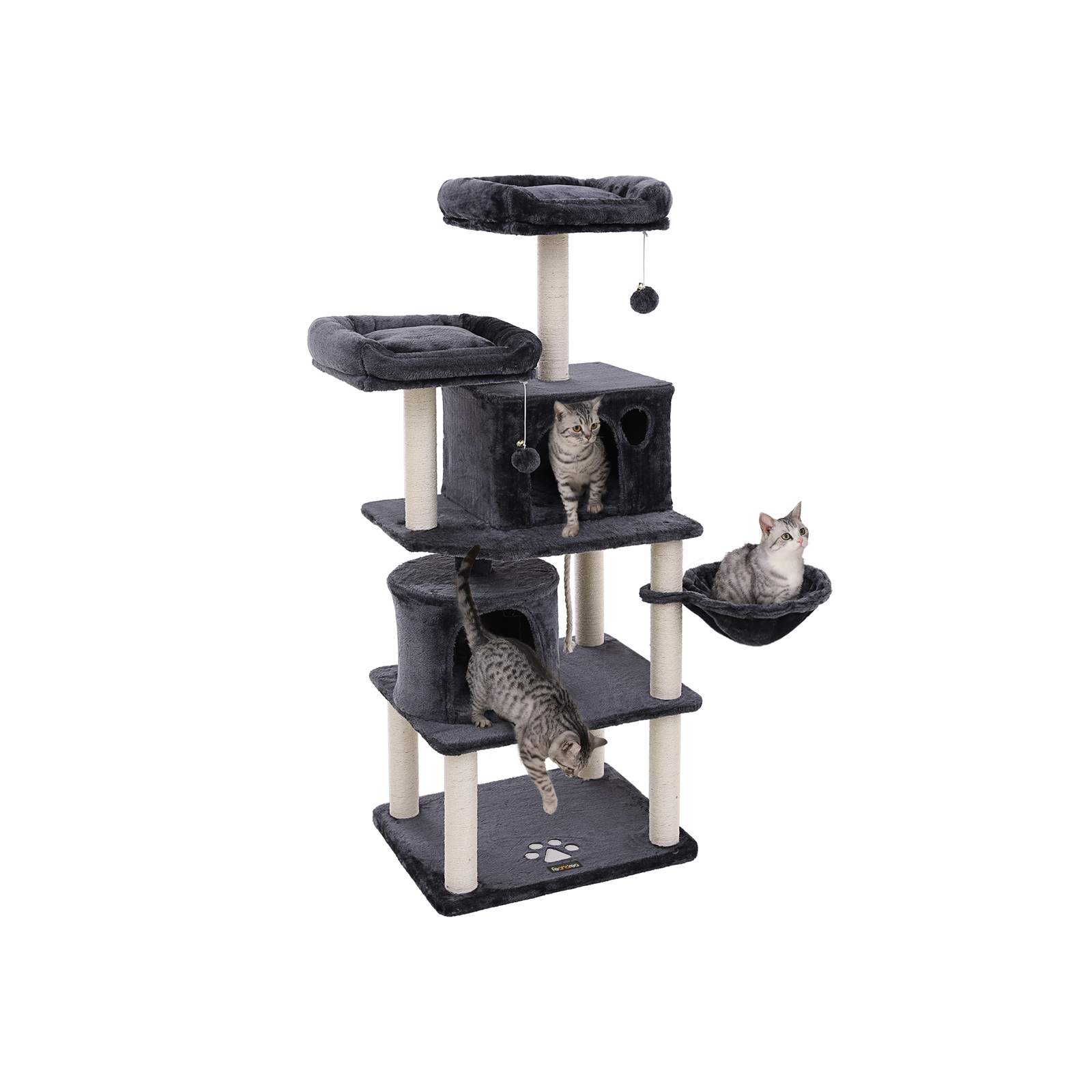 Dette klatrestativ fra FEANDREA er fremstillet af h?jkvalitets sp?nplader og udstyret med forskellige sjove tilbeh?rsdele. Det er den perfekte kombination af fremragende kvalitet og multifunktionalitet. Takket v?re klatrestativets st?nger, der er omviklet med naturlige sisal-snor, vil dine rastl?se stuekatte ikke l?ngere kradse p? dine m?bler for at sk?rpe deres kl?er. Desuden s?rger det h?ngende leget?j for ekstra sjov. Produktdetaljer: – Farve: R?ggr? – Materiale: Sp?nplade, plys, sisal-snor, r?r af fast pap – St?rrelse: 55 x 45 x 152 cm (B x D x H) – V?gt: 21,3 kg Leveringsomfang:- 1 x kradsetr? – 1 x monteringsvejledning (DE, EN, FR, ES, IT) FEANDREA Bem?rkninger: – Placer kradsetr?et p? et plant underlag i et hj?rne af din bolig. – Kontroller regelm?ssigt, at alle skruer er strammet, og stram dem om n?dvendigt.- Maks. belastning: 3 katte (hver kat m? ikke veje mere end 7 kg) – Hvis din kat tygger p? pelsbolde eller det medf?lgende elastiske b?nd eller ?nsker at spise dette leget?j, skal du straks fjerne det og opbevare det uden for din kats r?kkevidde.
