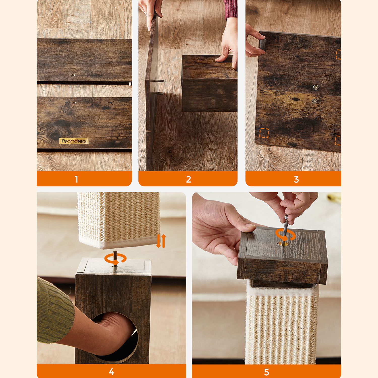 I FEANDREAs kreative v?rksted hopper to sm? killinger rundt, som personligt unders?ger vores kradsetr?er og giver ?gte dyrefacitback. S?ledes ved FEANDREAs designere fra f?rste h?nd, hvilke produkter der opfylder vores elskede killingeres behov. Fordelene ved kradsetr?et i et overblik: – Den vintagebrune finish passer til dine m?bler. – En bred base og 4 skridsikre puder holder kattekl?etr?et stabilt. – H?jden p? 73 cm er ideel for katte, s? de kan str?kke sig, n?r de kl?r. – Slidst?rkt materiale til langvarig brug. – Den enkle struktur g?r monteringen nem. – En bold, der h?nger i hullet, giver ekstra legegl?de. Produktdetaljer: – Farve: Vintagebrun – Materiale: Tr?sp?nplade, sisalreb (8 mm tykt) – St?rrelse: 38 x 38 x 73 cm (L x B x H) – V?gt: 3,8 kg Leveringsomfang: – 1 x kradsetr? – 1 x vejledning