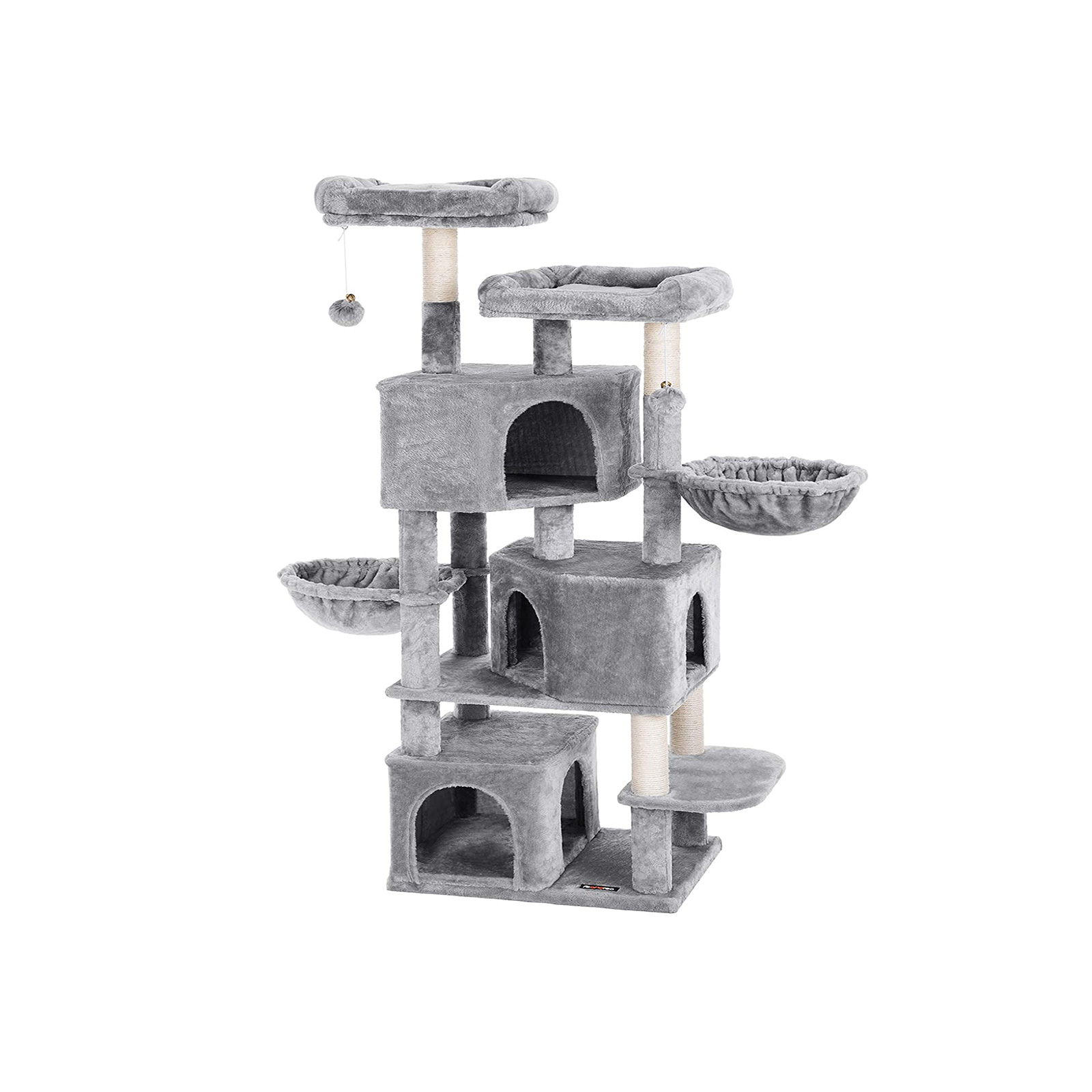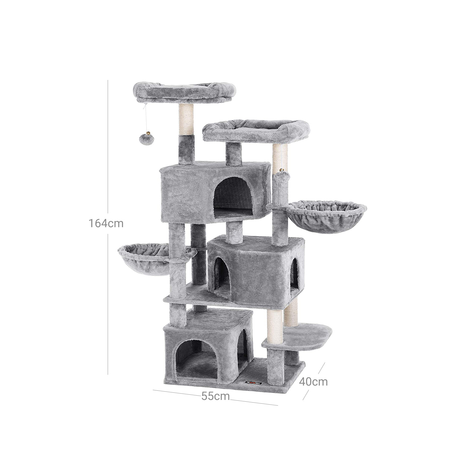 I FEANDREAs kreative v?rksteder springer to s?de killinger rundt, som personligt unders?ger alle kradsetr?er og giver deres dyriske feedback. P? den m?de f?r FEANDREAs designere f?rsteh?nds- eller rettere sagt f?rste-pote-information om, hvorvidt produkterne lever op til de fork?lede snorh?rede dyrs krav.Kradsetr?ets h?jdepunkter i oversigt: – H?j stabilitet; har en tr?forst?rket bundplade og en vippesikring – Robuste sisalstammer – Betrukket med bl?dt, ekstra slidst?rkt plys – 3 kattehuse, 2 liggepladser, 2 udsigtsplatforme – Ekstra stort; egnet til flere katte – Trappeformet opstilling af de enkelte elementer; forenklet opstigning – Sjove pelsbolde med klokkerProduktdetaljer:- Farve: Lysegr?- Materiale: MDF (medium densitetsfiberplade), plys, sisal- St?rrelse: 55 x 40 x 164 cm (L x B x H)- V?gt: 21 kgLeveringsomfang:- 1 x kradsetr? – 1 x vejledning (DE, EN, FR, ES, IT) FEANDREA BEM?RKNINGER: – Hvis kradsetr?et er beskadiget, bedes du straks kontakte vores kundeservice for at f? reservedele eller finde en anden tilfredsstillende l?sning. V?r opm?rksom p?, at et beskadiget produkt kan medf?re, at dine katte kommer til skade. – Hvis dine katte tygger p? pelsbolden eller elastikken, skal du straks fjerne leget?jet og opbevare det et sted, hvor din kat ikke kan komme til det.