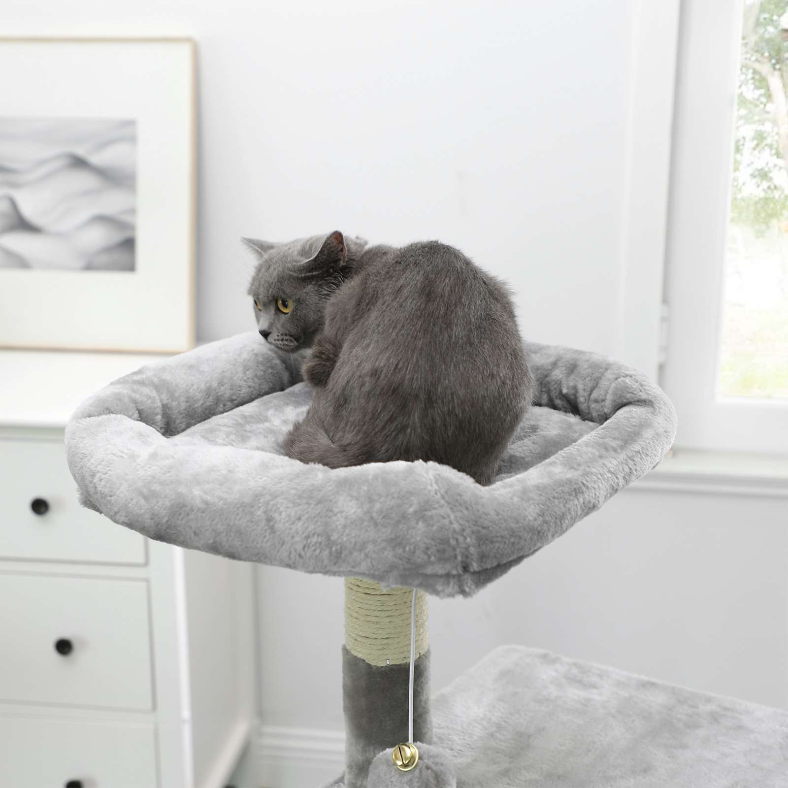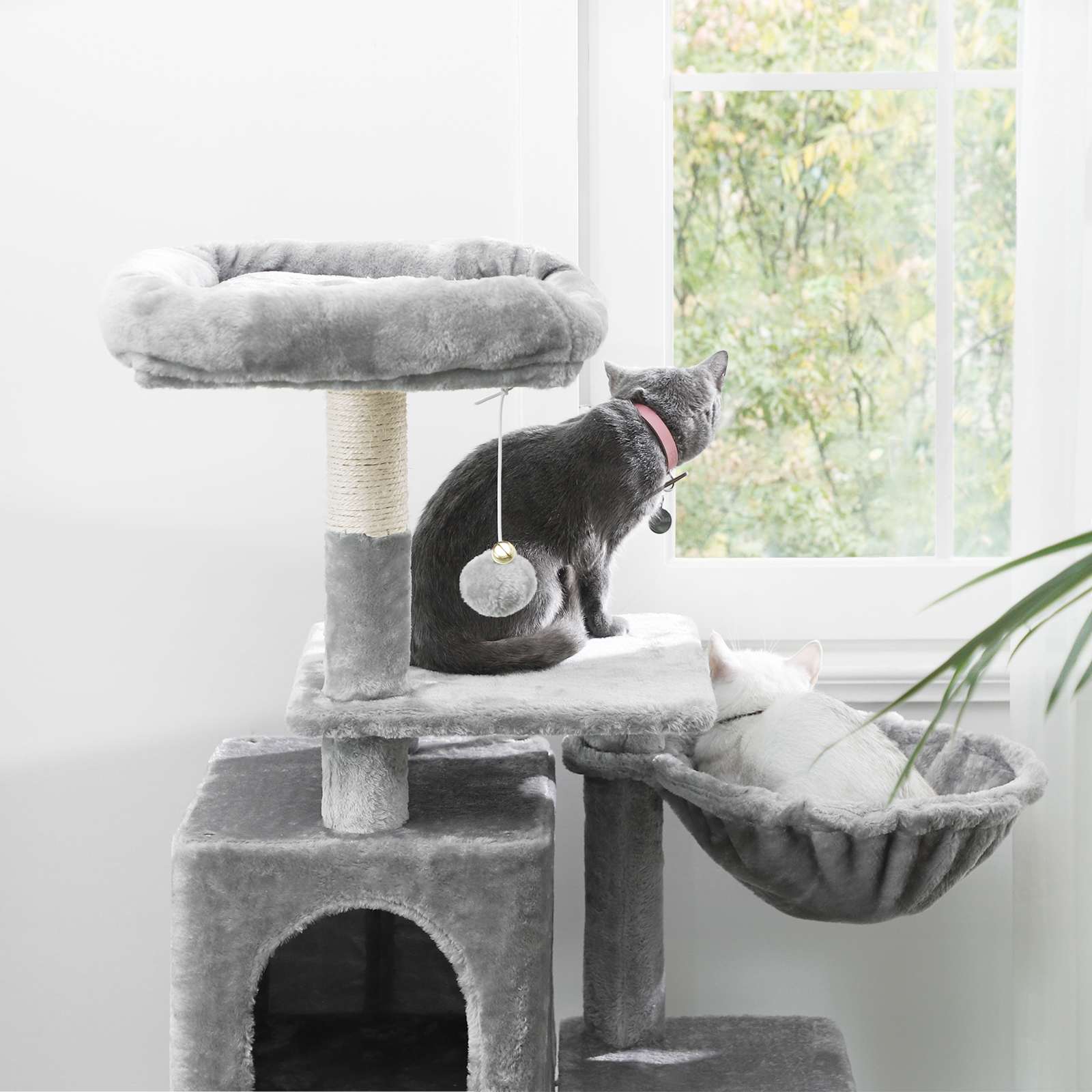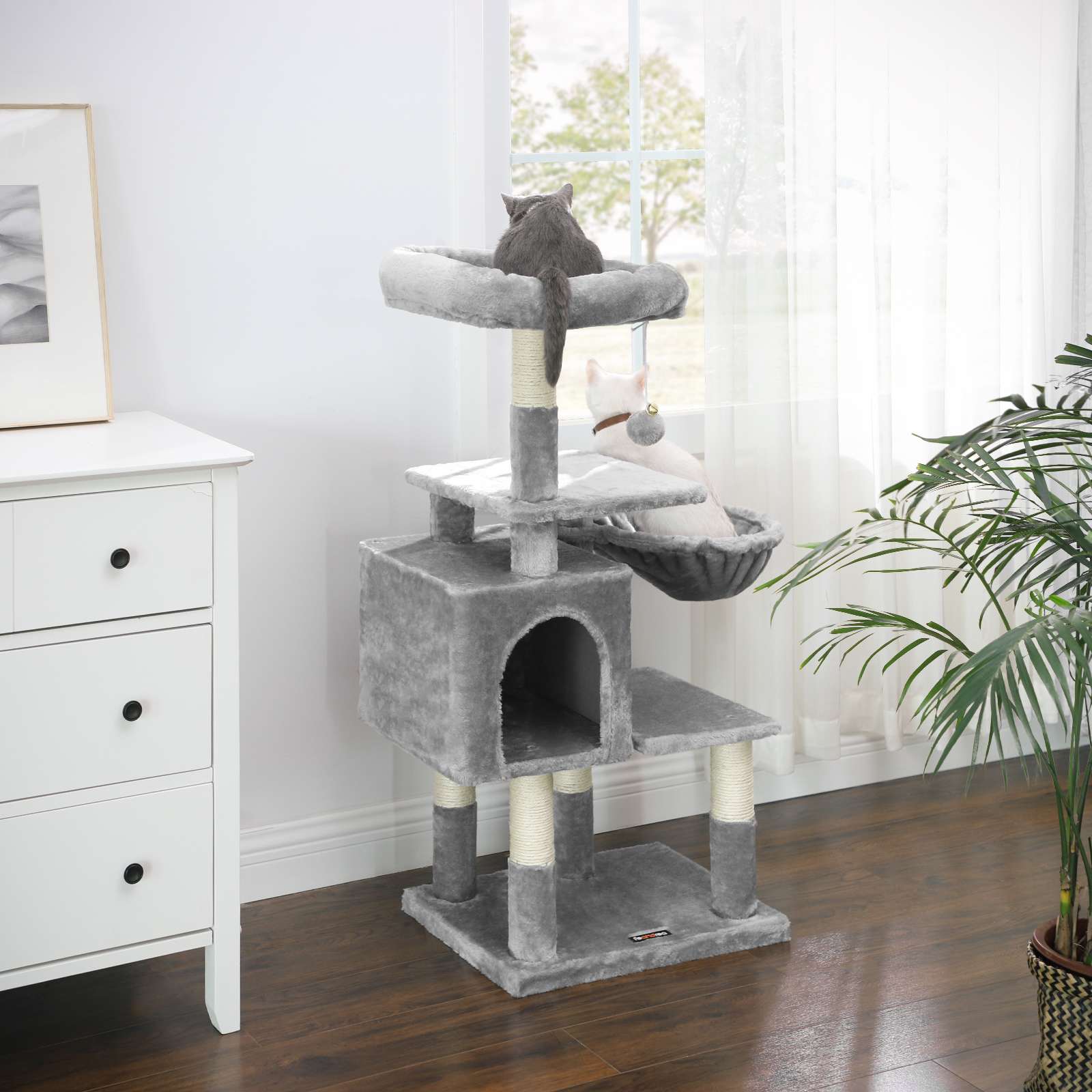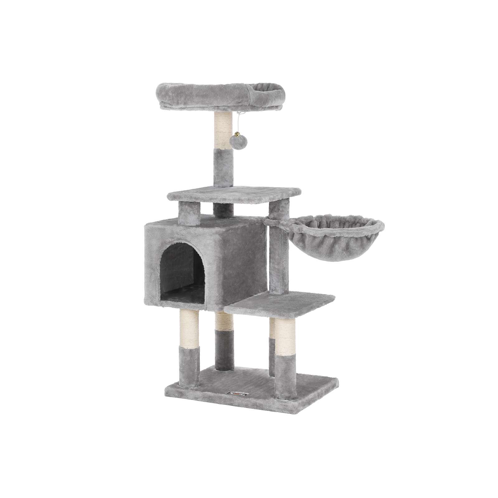 I FEANDREAs kreative v?rksteder springer to s?de killinger rundt, som personligt unders?ger alle kradsetr?er og giver deres dyriske feedback. P? den m?de f?r FEANDREAs designere f?rsteh?nds- eller rettere sagt f?rste-pote-information om, hvorvidt produkterne lever op til de fork?lede snorh?rede dyrs krav.H?jdepunkterne ved dette kradsetr? i oversigt: – Udstyret med adskillige klatreelementer; velegnet til katte i alle aldre – Rummelig, godt polstret udsigtsplatform – Gener?s hyggekurv og behagelig liggeplads – H?j stabilitet; har en tr?forst?rket bundplade – Vipbeskyttelse for ekstra sikkerhed Produktdetaljer: – Farve: Lysegr? – Materiale: MDF (medium densitetsfiberplade), plys, sisal – St?rrelse: 50 x 40 x 110 cm (L x B x H) – V?gt: 10,4 kg Leveringsomfang: – 1 x kradsetr? – 1 x vejledning (DE, EN, FR, ES, IT)
