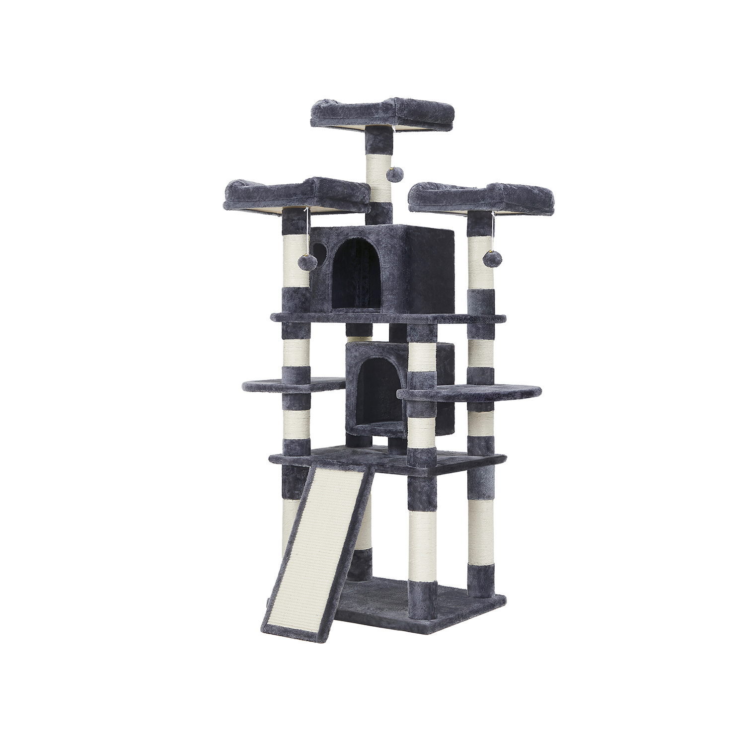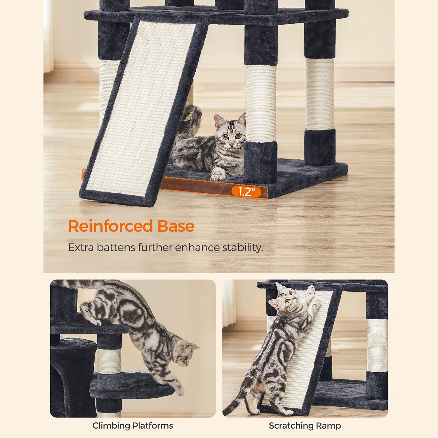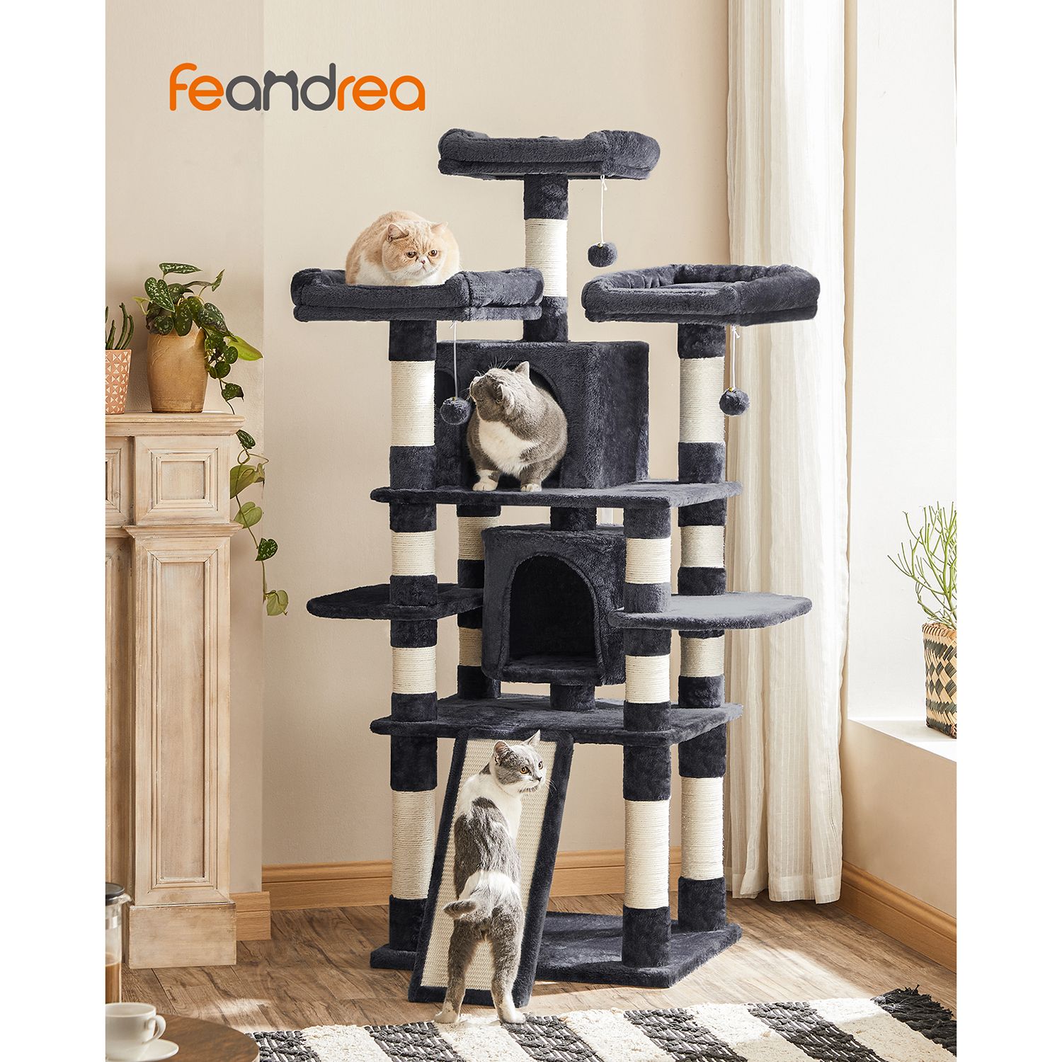I FEANDREAs kreative v?rksteder springer to s?de killinger rundt, som personligt unders?ger alle klatrestativer og giver deres dyriske feedback. P? den m?de f?r FEANDREAs designere f?rsteh?nds- eller rettere sagt f?rste-pote-information om, hvorvidt produkterne lever op til de fork?lede snorh?rede dyrs krav. Et klatrestativ med mange fordele Det ovenfor viste klatrestativ har best?et kattens test. De to store hyggelige huler og de 3 bl?de udsigtsplatforme var is?r popul?re. Men ogs? klatrebr?ttet i den nederste del af kattens leget?j var meget efterspurgt. Derudover f?lte de to testere sig sikre og sprang uden frygt fra platform til platform. Den h?je stabilitet af dette klatrestativ sikres is?r af de tykke sisalstammer og den forst?rkede bundplade. Der medf?lger ogs? en vippesikring. Pr?v, hvilken del af vores kradsetr? din kat vil elske, og del testresultatet af din favorit med andre dyreelskere i kommentarerne. Produktdetaljer: – Farve: R?ggr? – Materiale: CARB-certificeret sp?nplade, plys, sisal – St?rrelse: 60 x 55 x 172 cm (B x D x H) – V?gt: 29,1 kg Leveringsomfang: – 1 x kradsetr? – 1 x vejledning (DE, EN, FR, ES, IT) FEANDREA Bem?rkninger: – Placer kradsetr?et p? et plant underlag i et hj?rne af din bolig. – Produktet m? ikke placeres i fugtige omgivelser. – Hold b?rn v?k fra dette produkt. De m? ikke klatre op p? kradsetr?et eller lege med det. – Hvis din kat vil spise pelsbolde eller det elastiske b?nd, skal du straks fjerne dette leget?j. – Brug v?ltesikringen til at fastg?re produktet til v?ggen.