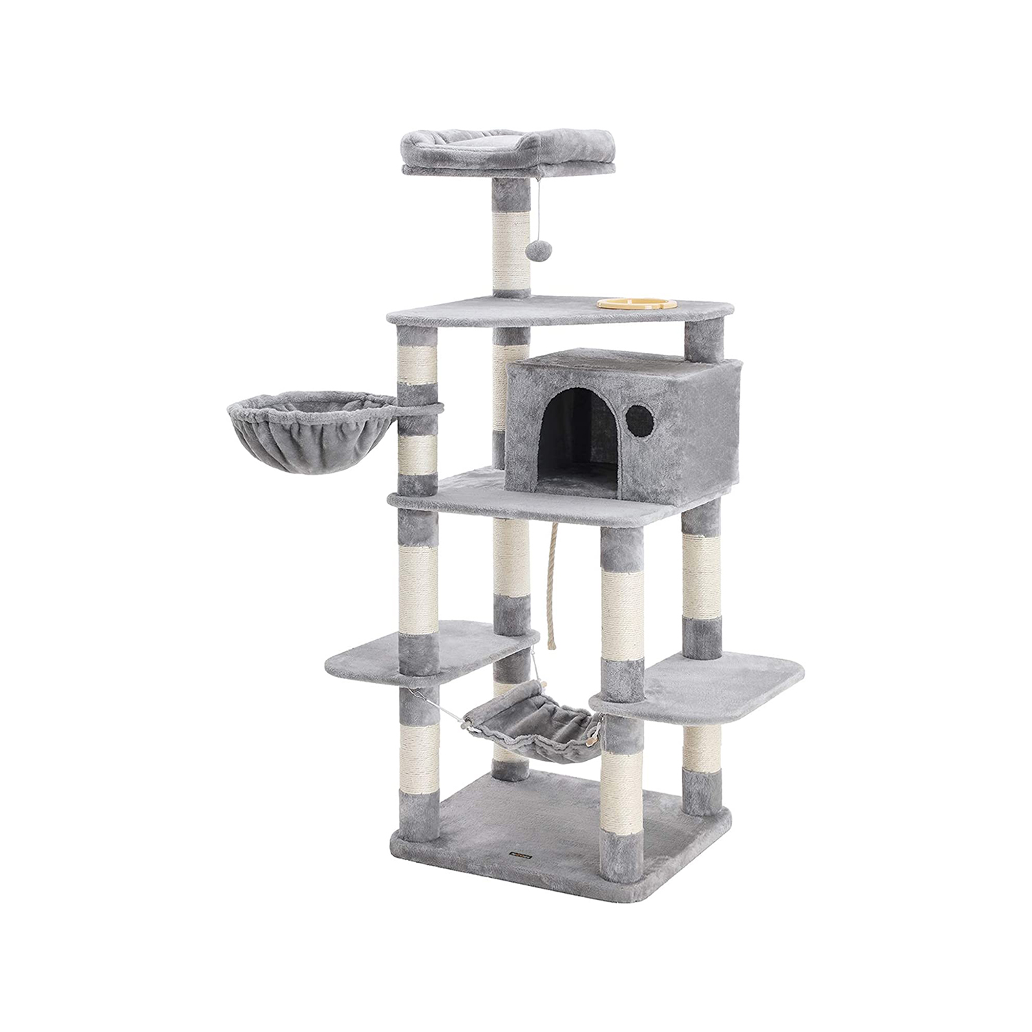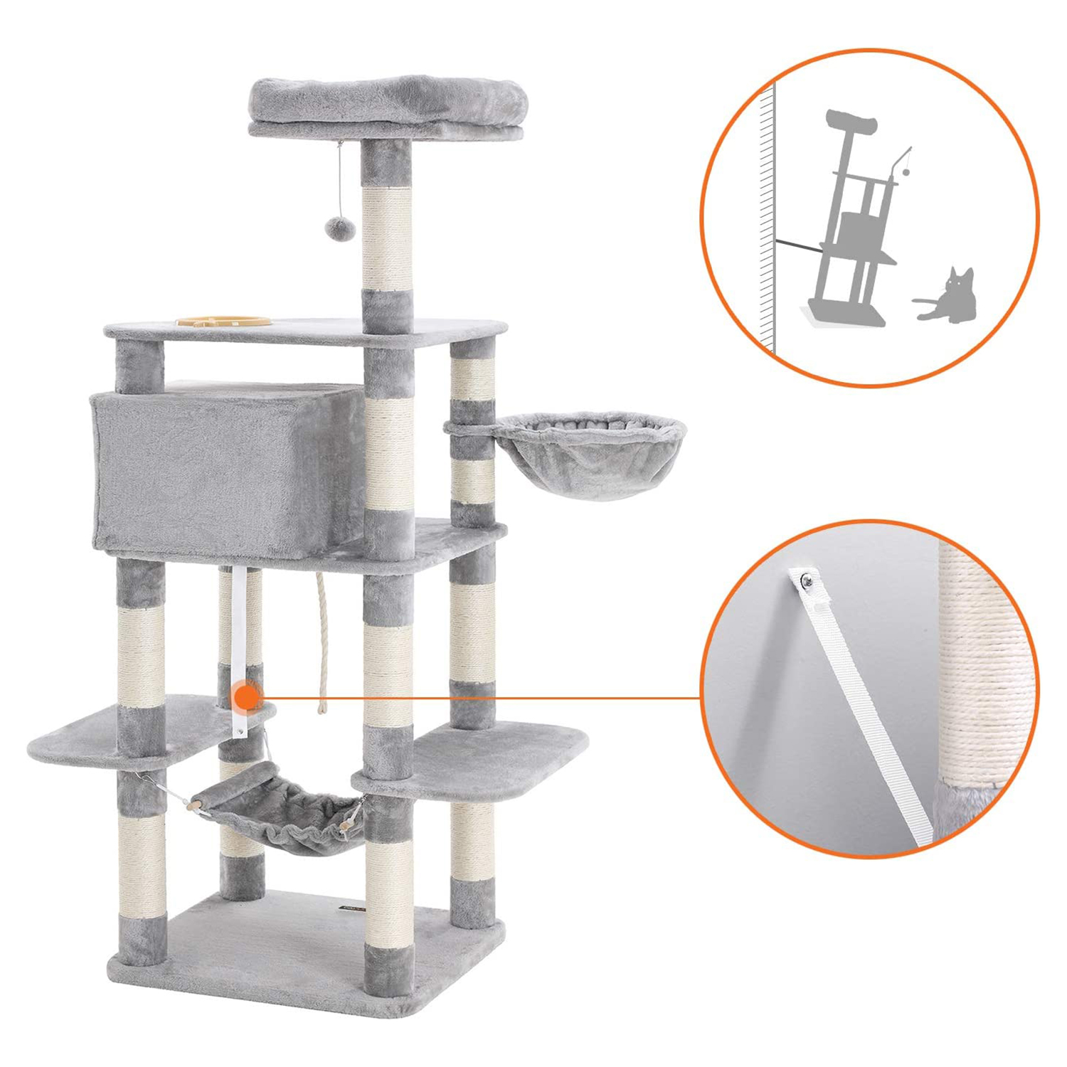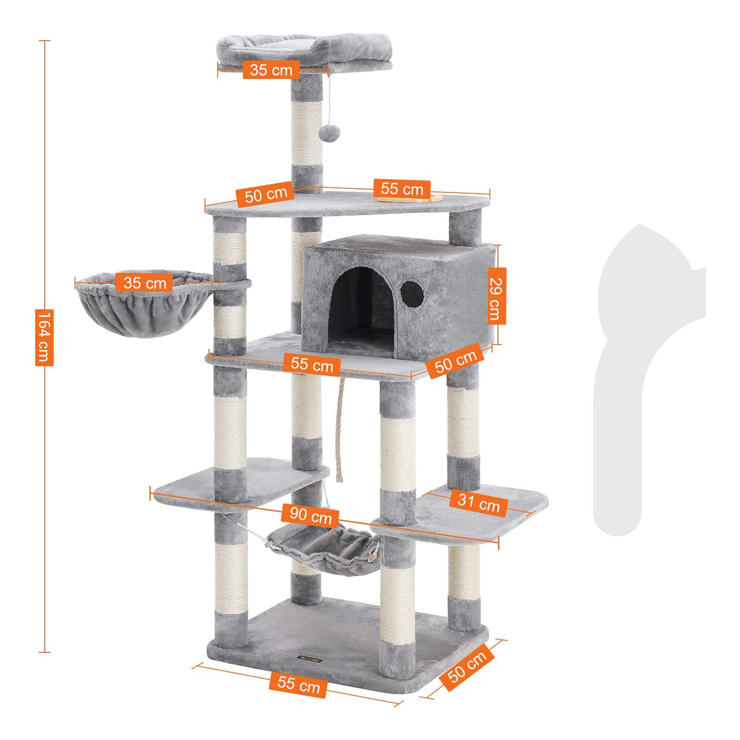 FEANDREA katteklatrestativer har alle de egenskaber, du har brug for, for at din kat kan trives. FODRING ? Med fodersk?len p? den ?verste platform bliver dine killinger aldrig tr?tte af dette klatrestativ. HVILE ? Luksuri?s ?verste siddeplads med forh?jet kant giver en f?rsteklasses plads til at hvile sig.KL? – St?rke st?nger, der er omviklet med naturlige sisalreb, giver katte mulighed for at kl? deres kl?er og str?kke sig. TAG EN LUR – Takket v?re hulen og kurven kan dine katte endelig f? deres egne senge og slutte fred med hinanden. Udover al den sjov er sikkerheden for dine k?ledyr ogs? sikret. Bunden er forst?rket med lister for at ?ge stabiliteten; der medf?lger ogs? anti-tip-beslag, s? du kan fastg?re katteklatrestativet til v?ggen. Uanset om du har sm? killinger, store katte eller gamle katte, er dette klatrestativ et vidunderligt hjem for dine pelskl?dte venner. Produktdetaljer:- Farve: lysegr? – Materiale: CARB-certificeret sp?nplade, plys, sisal – Produktm?l: 90 x 50 x 164 cm (B x D x H) – V?gt: 20,2 kg Leveringsomfang: – 1 x kradsetr? – 1 x vejledning (DE, EN, FR, ES, IT) FEANDREA Bem?rkninger:- Placer kradsetr?et p? et plant underlag i et hj?rne af rummet. – Undg? fugtige omgivelser. – B?rn m? ikke klatre op p? kradsetr?et eller lege med det. – Vi anbefaler, at du fastg?r t?rnet til v?ggen med de medf?lgende v?gbeslag.
