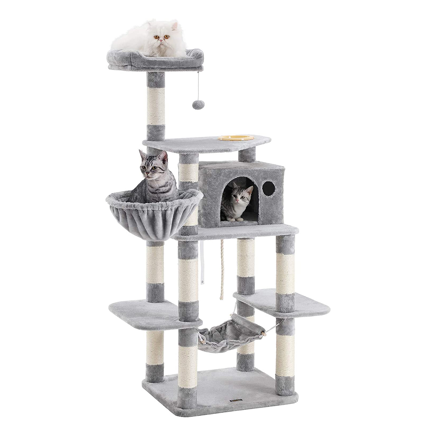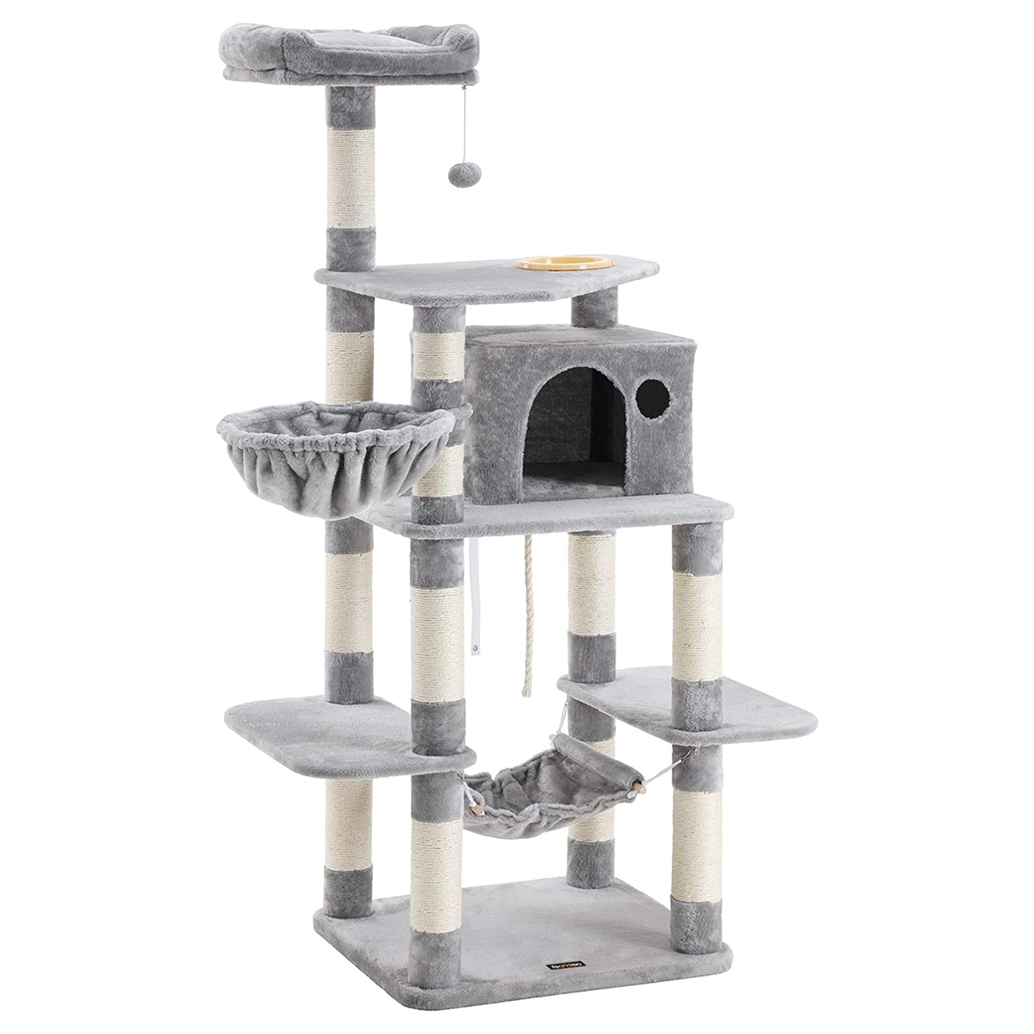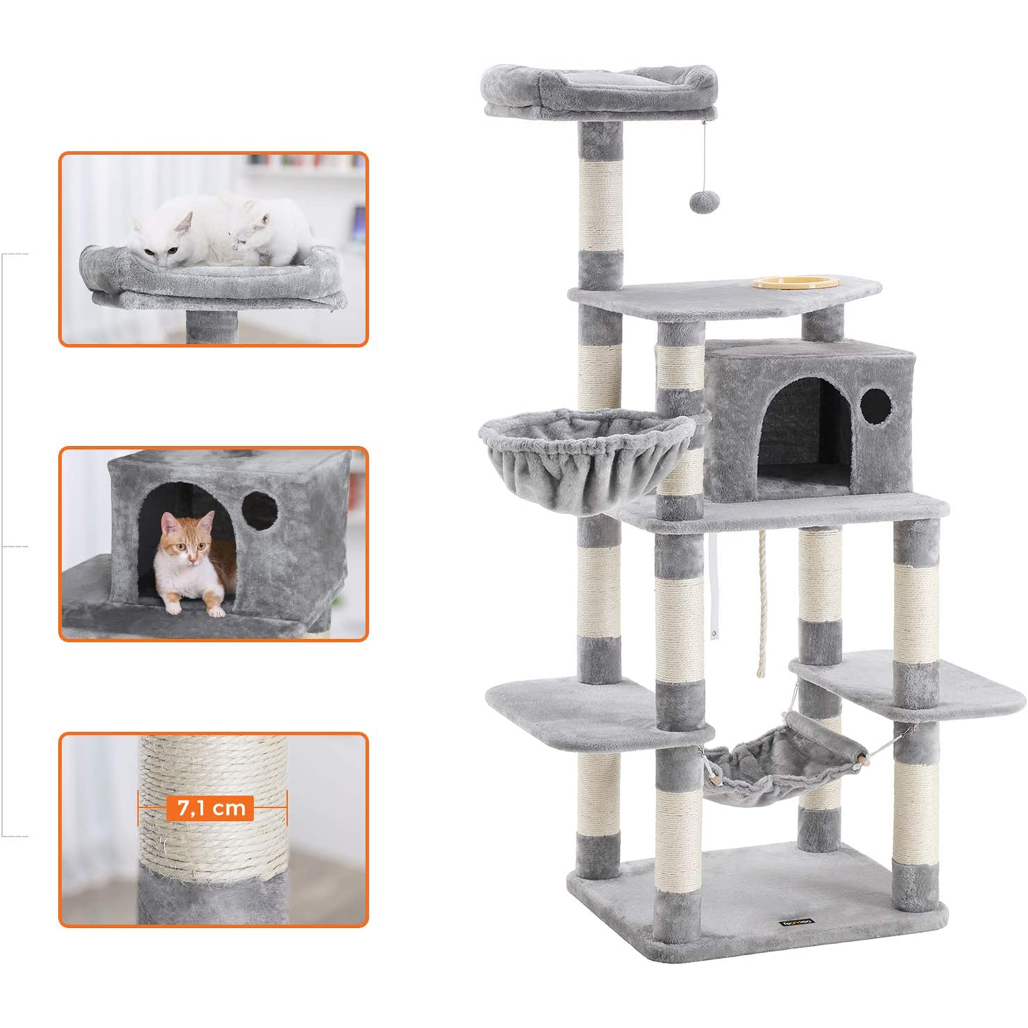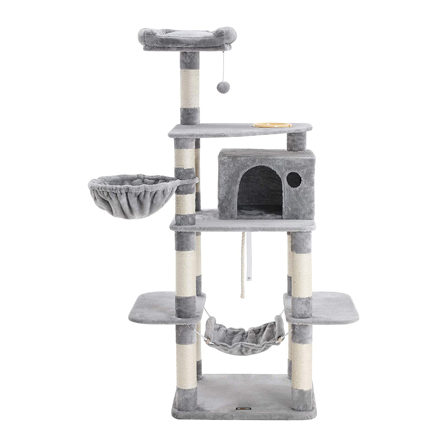 FEANDREA katteklatrestativer har alle de egenskaber, du har brug for, for at din kat kan trives. FODRING ? Med fodersk?len p? den ?verste platform bliver dine killinger aldrig tr?tte af dette klatrestativ. HVILE ? Luksuri?s ?verste siddeplads med forh?jet kant giver en f?rsteklasses plads til at hvile sig.KL? – St?rke st?nger, der er omviklet med naturlige sisalreb, giver katte mulighed for at kl? deres kl?er og str?kke sig. TAG EN LUR – Takket v?re hulen og kurven kan dine katte endelig f? deres egne senge og slutte fred med hinanden. Udover al den sjov er sikkerheden for dine k?ledyr ogs? sikret. Bunden er forst?rket med lister for at ?ge stabiliteten; der medf?lger ogs? anti-tip-beslag, s? du kan fastg?re katteklatrestativet til v?ggen. Uanset om du har sm? killinger, store katte eller gamle katte, er dette klatrestativ et vidunderligt hjem for dine pelskl?dte venner. Produktdetaljer:- Farve: lysegr? – Materiale: CARB-certificeret sp?nplade, plys, sisal – Produktm?l: 90 x 50 x 164 cm (B x D x H) – V?gt: 20,2 kg Leveringsomfang: – 1 x kradsetr? – 1 x vejledning (DE, EN, FR, ES, IT) FEANDREA Bem?rkninger:- Placer kradsetr?et p? et plant underlag i et hj?rne af rummet. – Undg? fugtige omgivelser. – B?rn m? ikke klatre op p? kradsetr?et eller lege med det. – Vi anbefaler, at du fastg?r t?rnet til v?ggen med de medf?lgende v?gbeslag.