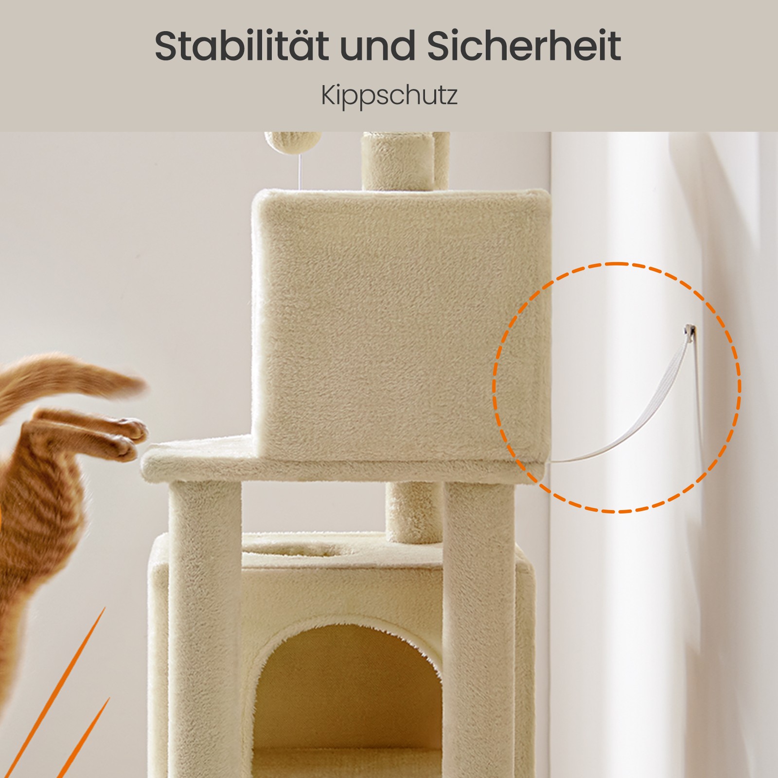– Da katte gerne hopper og leger, skal du fastg?re klatrestativet til v?ggen med den medf?lgende vippesikring for at skabe et sikkert milj?.