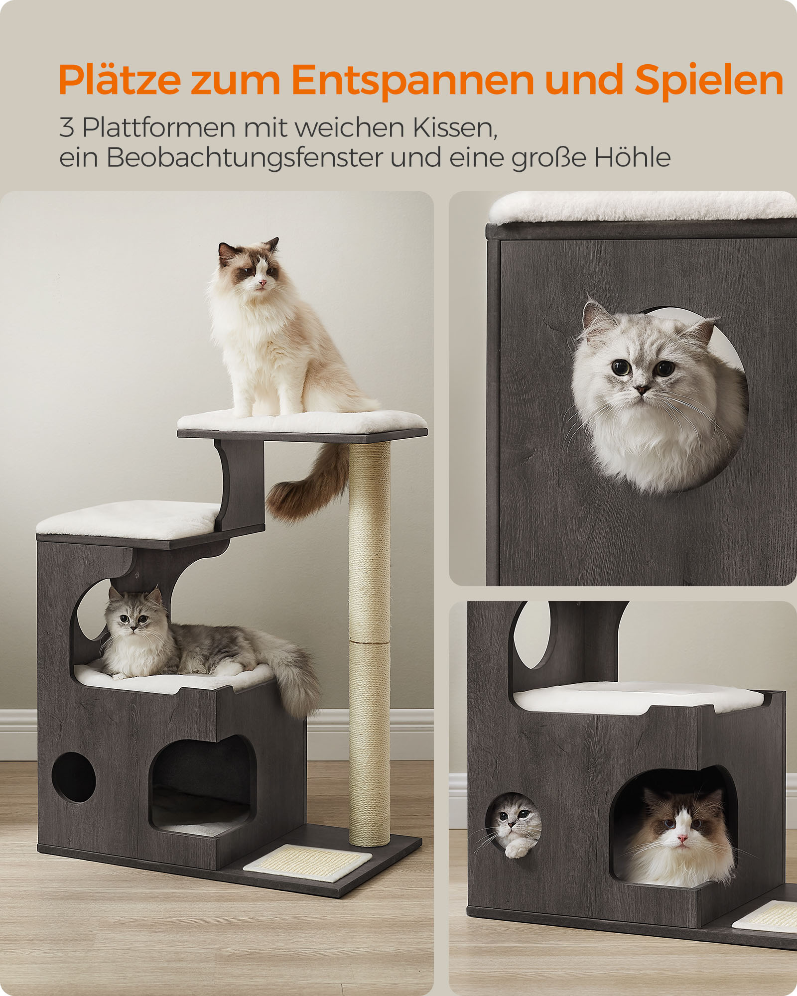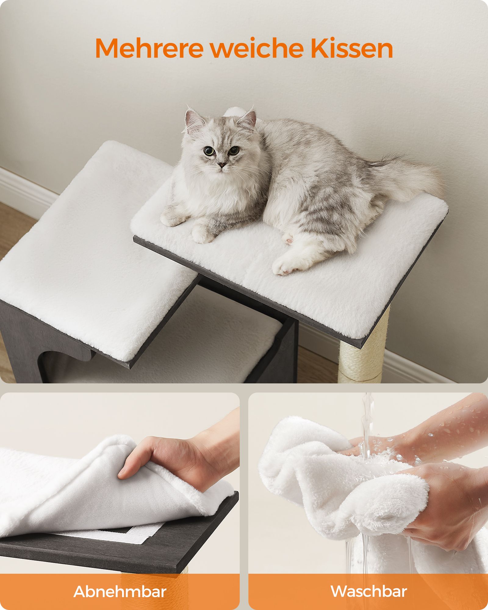 Feandrea Kratzbaum 88 cm, mellemstor katteklatrestativ med 3 liggeflader og hule, katte m?bler af MDF med tr?finer, sisalstamme, vaskbare puder af imiteret pels, vintagebrun, hvid PCT70HW