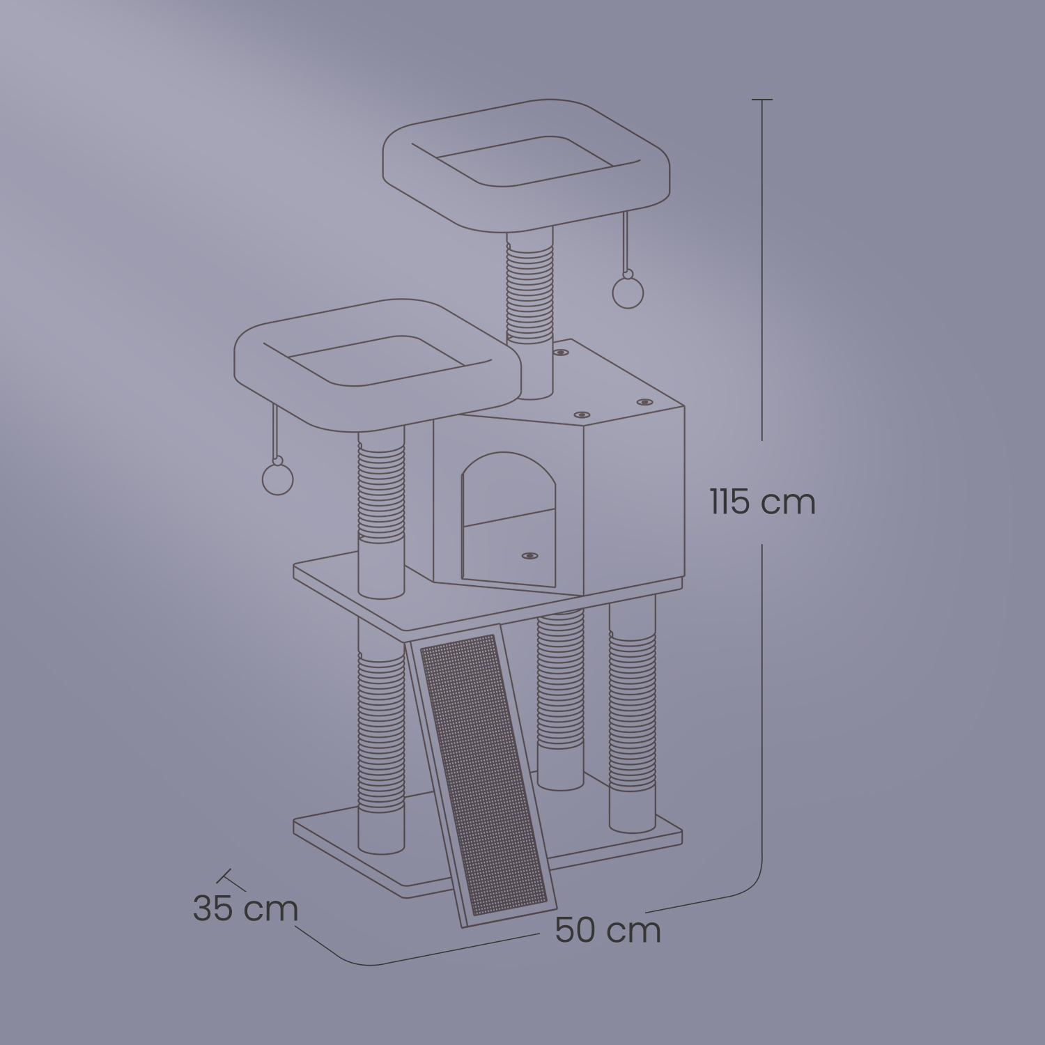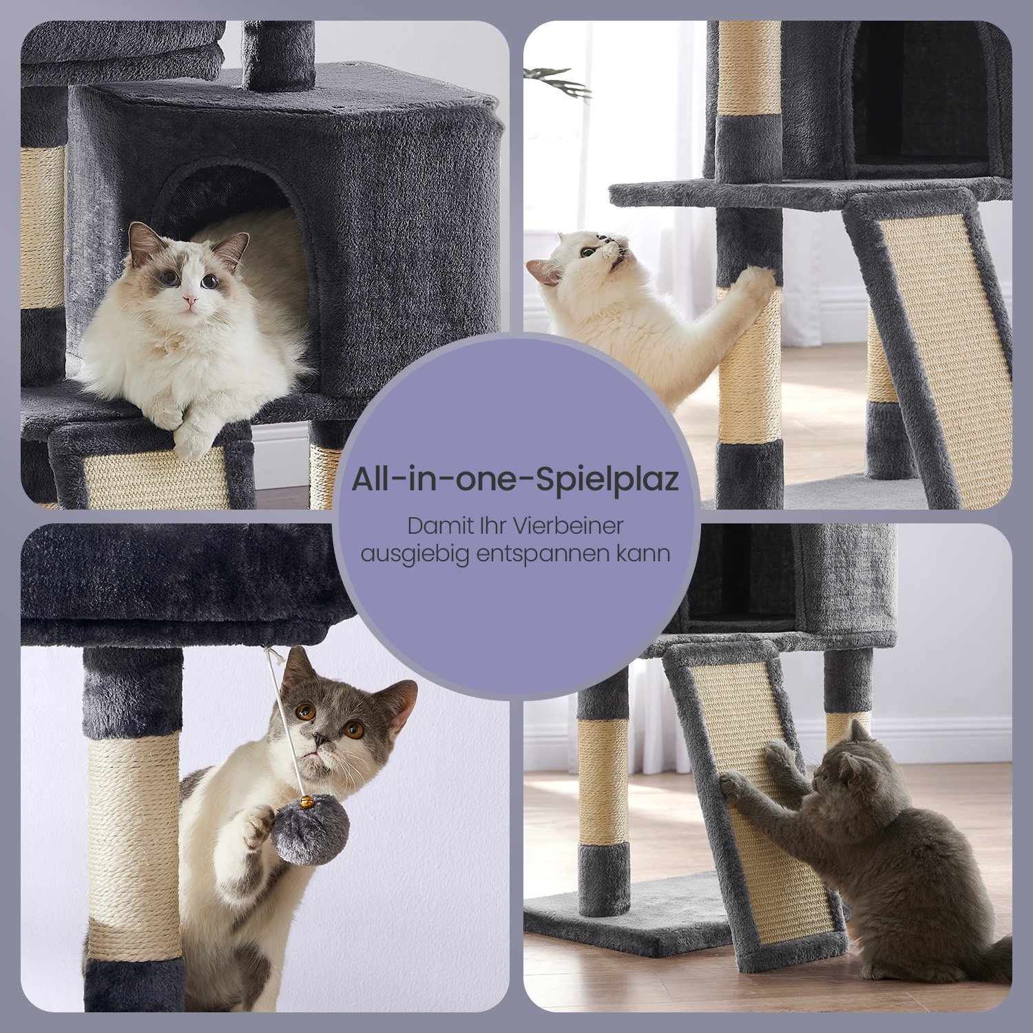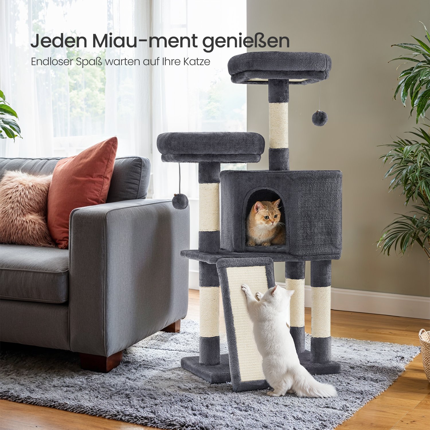 FEANDREA Pladsbesparende kradsetr? Dette kradsetr? p? 50 x 35 x 115 cm er velegnet til sm? lejligheder, hvor en eller flere energiske katte boltrer sig. Fork?l dem trods den begr?nsede plads med en hyggelig hule og 2 polstrede platforme. Slibe kl?er, tage en lur, slappe af, str?kke sig, lege… Hver kat har sit yndlingssted p? vores kradsetr?. Og hvad med din kat? I FEANDREAs kreative v?rksteder springer to s?de killinger rundt, som personligt unders?ger alle kradsetr?er og giver deres dyriske feedback. P? den m?de f?r FEANDREAs designere f?rsteh?nds- eller rettere sagt f?rste-pote-information om, hvorvidt produkterne lever op til de fork?lede snorh?rede dyrs krav.Din s?de kat kan nyde f?lgende s?rlige egenskaber: 2 udsigtsplatforme ?verst til at observere fra 1 behagelig hyggekurv til at lege gemmeleg i Stammer med sisal p? hvert niveau til at sk?rpe kl?erne 1 stort kradsebr?t, der samtidig fungerer som trappe Trinvis opbygning for nem op- og nedstigning 2 pelsbolde for ekstra sjov Produktdetaljer:Farve: R?ggr? Materiale: Sp?nplade, plys, sisal St?rrelse: 50 x 35 x 115 cm (L x B x H) V?gt: 10,3 kg Leveringsomfang: 1 x kradsetr? 1 x vippesikring 1 x vejledning (DE, EN, FR, ES, IT) FEANDREA Bem?rkninger:Hvis kattehulen bliver beskadiget, skal du reparere eller udskifte den i tide for at undg? skader fra beskadigede dele. Hvis dine katte tygger p? pelsbolden eller elastikken, skal du straks fjerne leget?jet og opbevare det et sted, hvor din kat ikke kan komme til det.