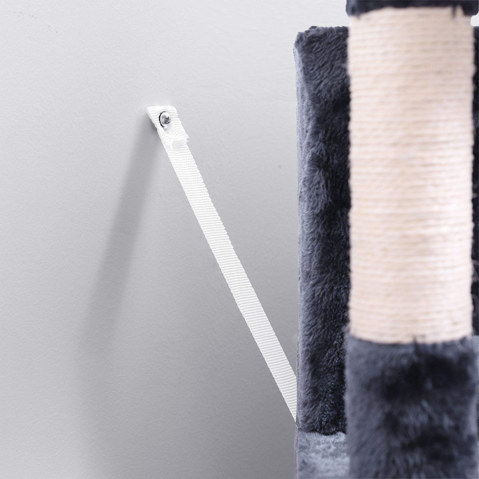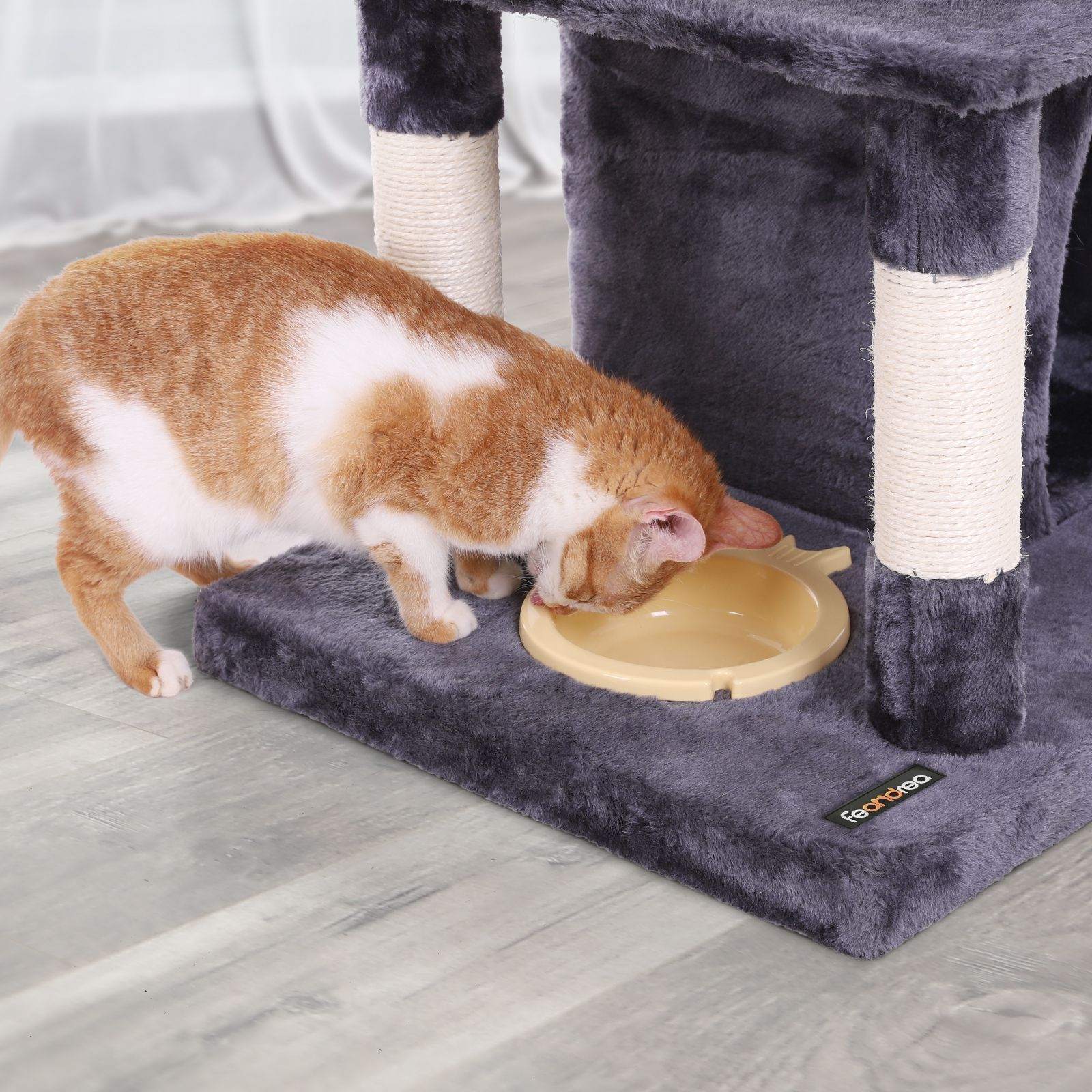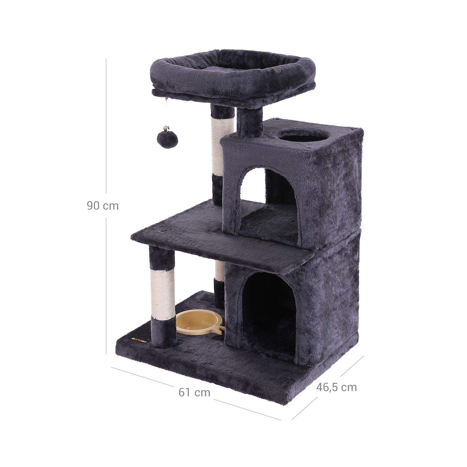 FEANDREA kradsetr?er har alle de egenskaber, du har brug for, for at dine katte kan trives. FODRING ? Med fodersk?len p? den nederste plade bliver dette kradsetr? aldrig kedeligt for dine killinger. AFSLAPNING ? Luksuri?s liggeflade med polstret kant giver en f?rsteklasses loungeoplevelse.KL? ? Tykke stammer, der er omviklet med naturligt sisalreb, hj?lper dine katte med at str?kke sig og slibe kl?erne. LUR ? Takket v?re de hyggelige huler har dine katte endelig deres egne senge og kan slutte fred med hinanden. Produktdetaljer: – Farve: antracit – Materiale: sp?nplade, plys, sisalreb – M?l: 50 x 40 x 85 cm (B x D x H) – V?gt: 13,4 kg Leveringsomfang: – 1 x kradsetr? – 1 x vejledning (DE, EN, FR, IT, ES) FEANDREA Bem?rkninger:- Hvis din kat begynder at spise eller tygge p? pelsbolde eller elastikb?nd, skal du fjerne leget?jet og opbevare det uden for din kats r?kkevidde. – Efter udpakning skal du placere kradsetr?et p? et godt ventileret sted for at fjerne eventuelle lugte og lade det luftes ud.- Kontroller regelm?ssigt, at skruerne sidder fast, for at sikre sikker brug. – Stil kradsetr?et p? et fladt underlag, s? det l?ner sig op ad v?ggen.