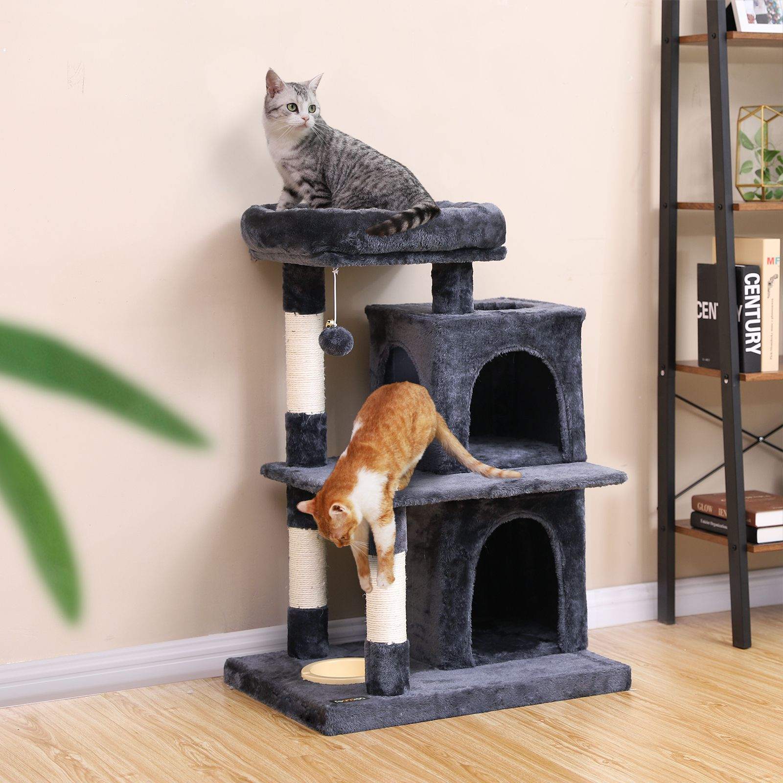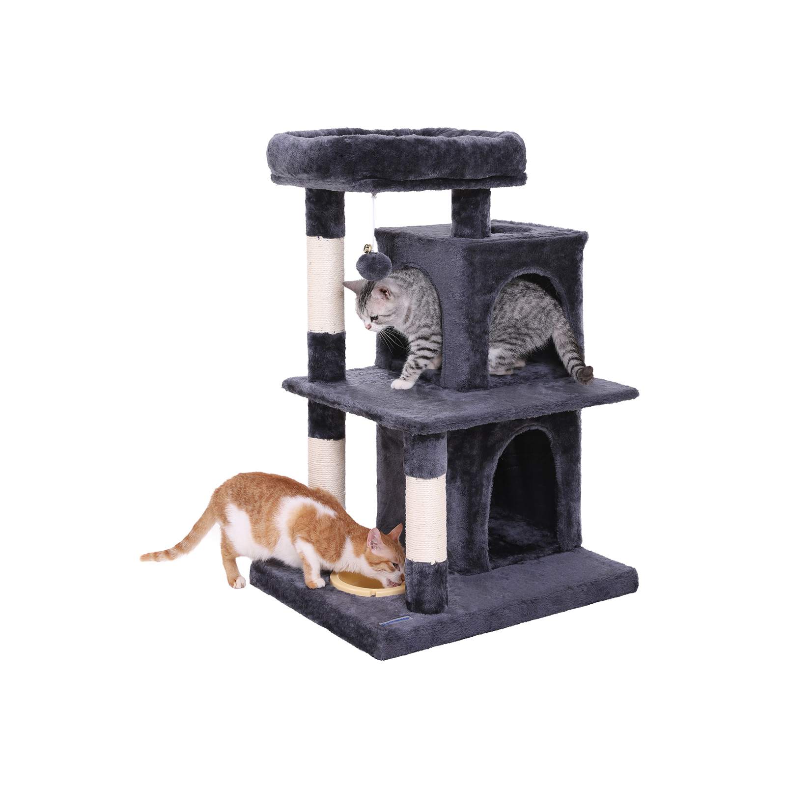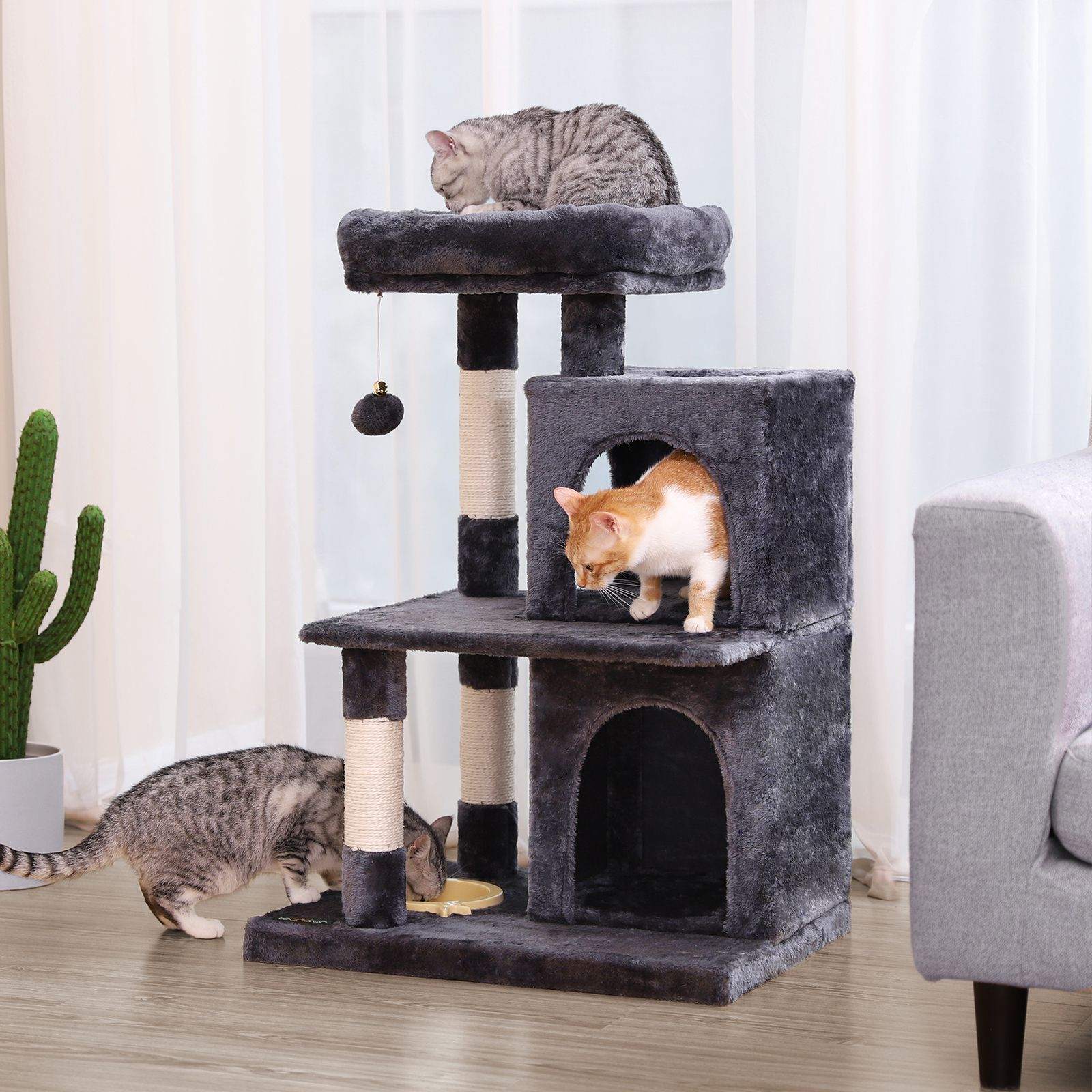 FEANDREA kradsetr?er har alle de egenskaber, du har brug for, for at dine katte kan trives. FODRING ? Med fodersk?len p? den nederste plade bliver dette kradsetr? aldrig kedeligt for dine killinger. AFSLAPNING ? Luksuri?s liggeflade med polstret kant giver en f?rsteklasses loungeoplevelse.KL? ? Tykke stammer, der er omviklet med naturligt sisalreb, hj?lper dine katte med at str?kke sig og slibe kl?erne. LUR ? Takket v?re de hyggelige huler har dine katte endelig deres egne senge og kan slutte fred med hinanden. Produktdetaljer: – Farve: antracit – Materiale: sp?nplade, plys, sisalreb – M?l: 50 x 40 x 85 cm (B x D x H) – V?gt: 13,4 kg Leveringsomfang: – 1 x kradsetr? – 1 x vejledning (DE, EN, FR, IT, ES) FEANDREA Bem?rkninger:- Hvis din kat begynder at spise eller tygge p? pelsbolde eller elastikb?nd, skal du fjerne leget?jet og opbevare det uden for din kats r?kkevidde. – Efter udpakning skal du placere kradsetr?et p? et godt ventileret sted for at fjerne eventuelle lugte og lade det luftes ud.- Kontroller regelm?ssigt, at skruerne sidder fast, for at sikre sikker brug. – Stil kradsetr?et p? et fladt underlag, s? det l?ner sig op ad v?ggen.