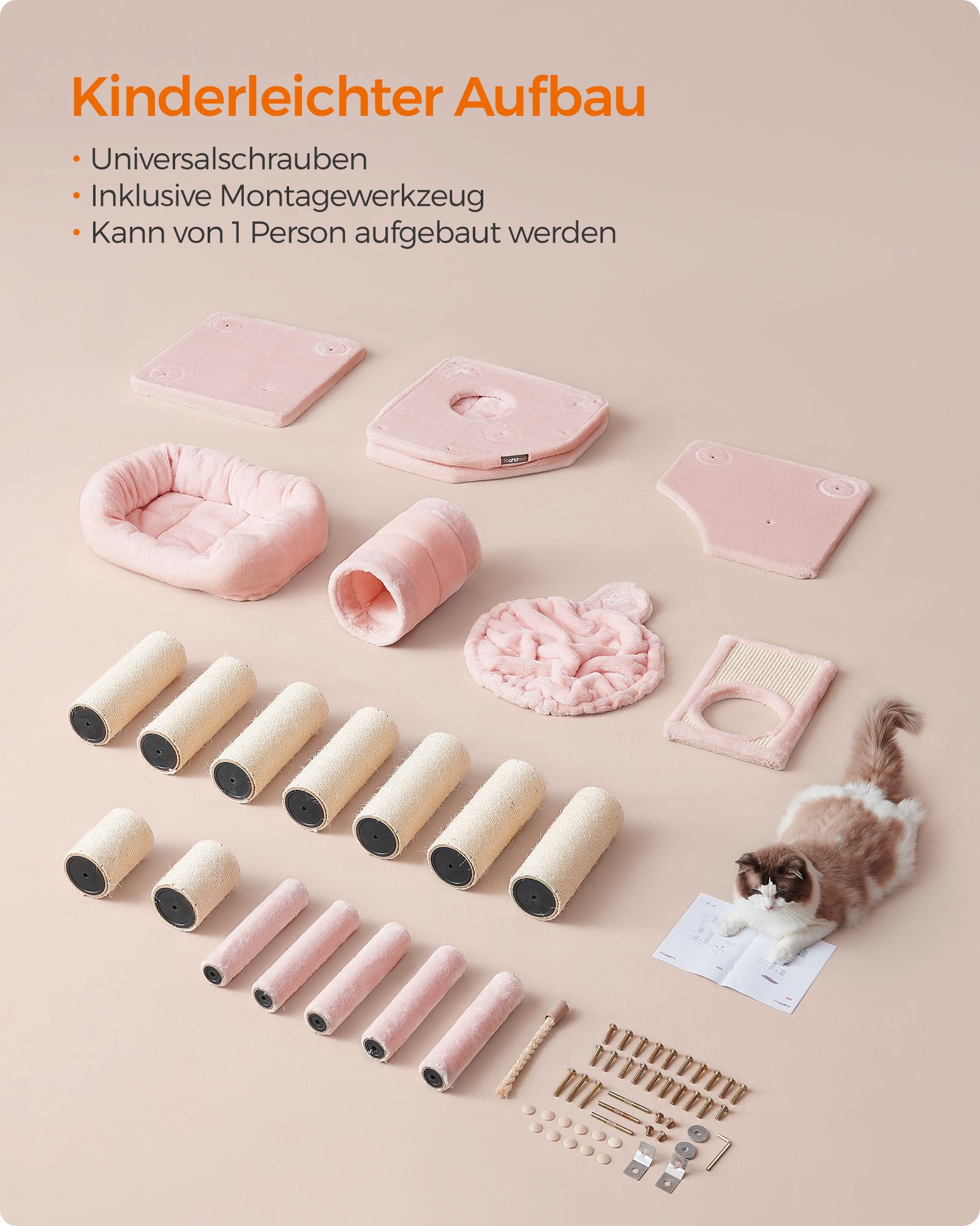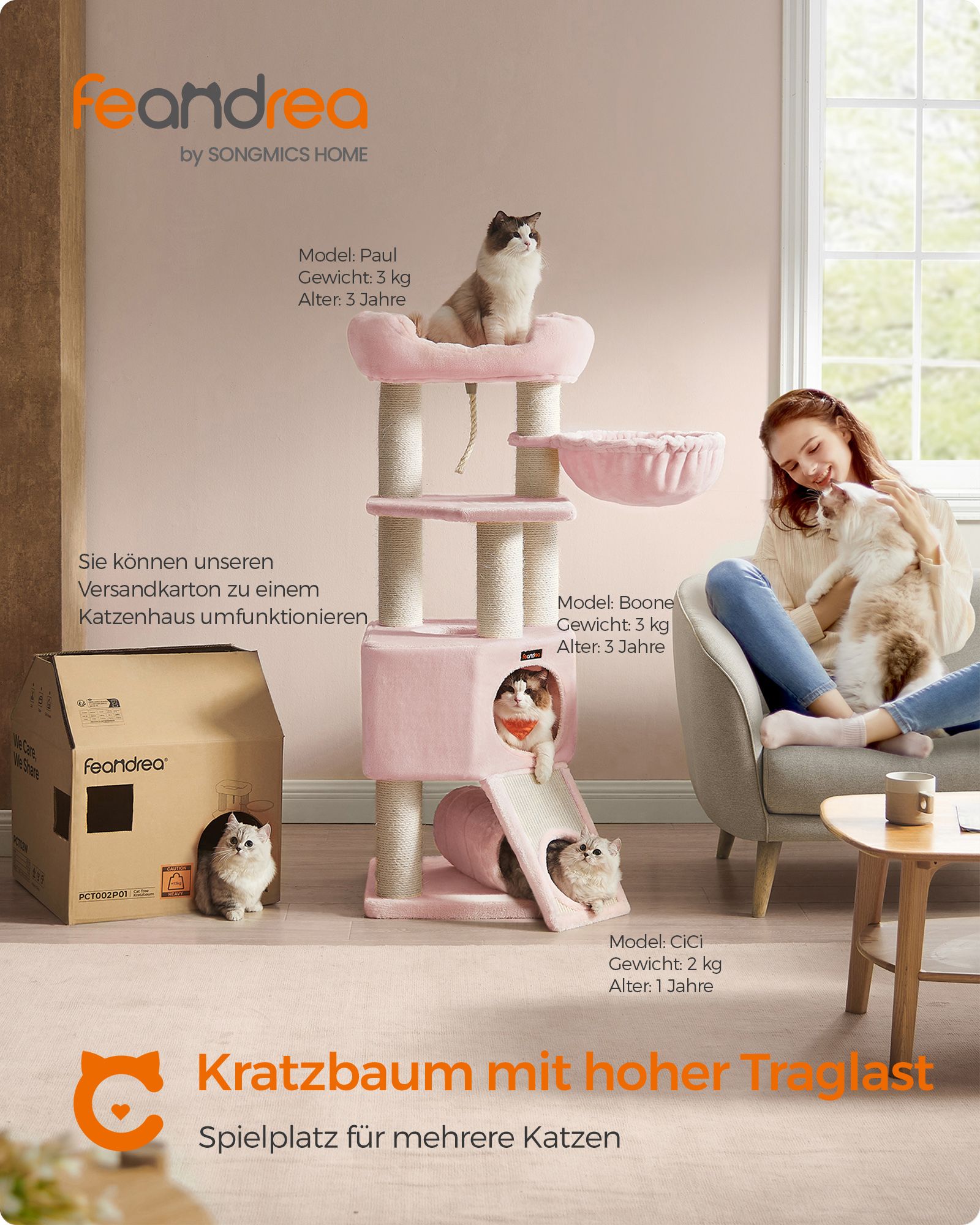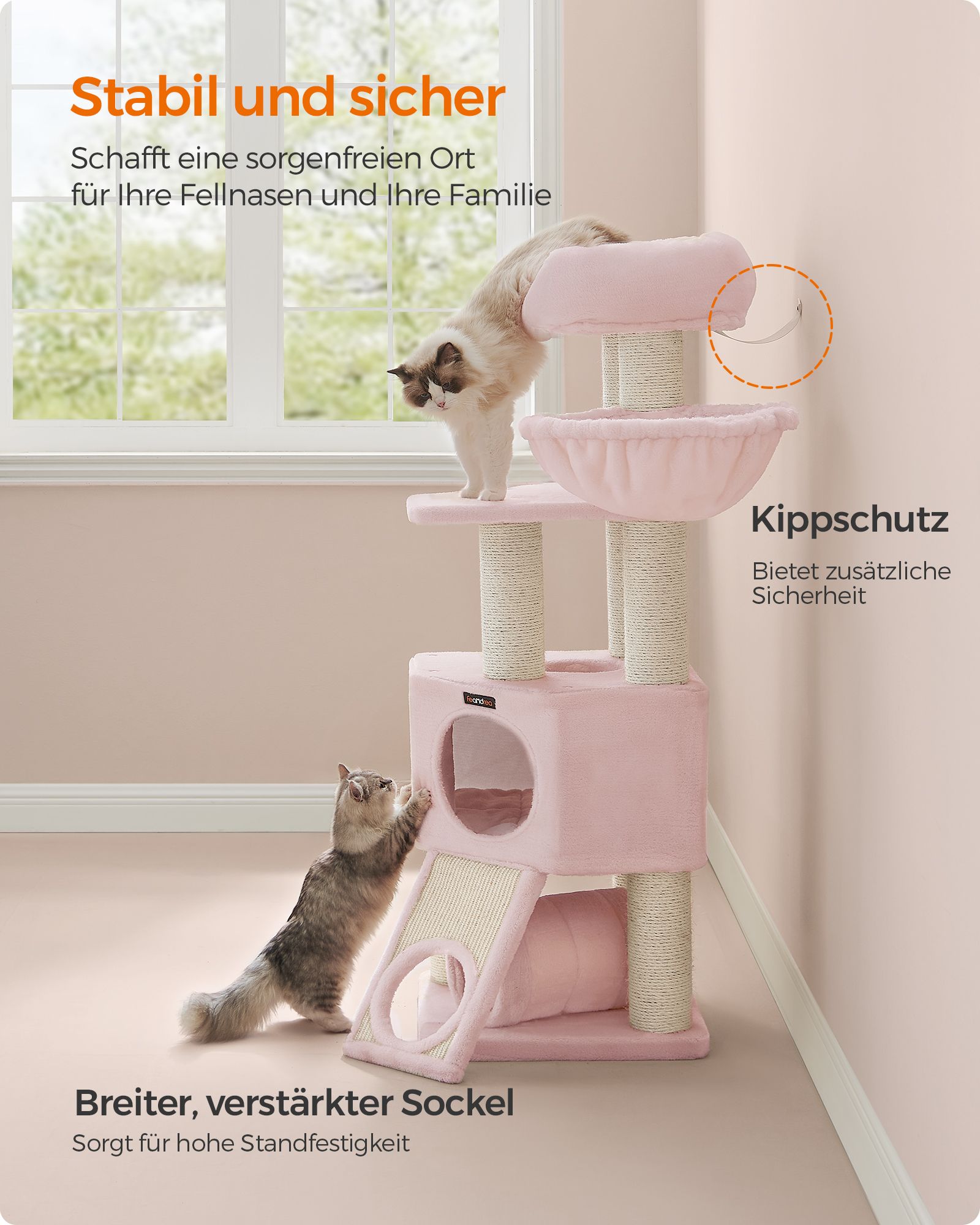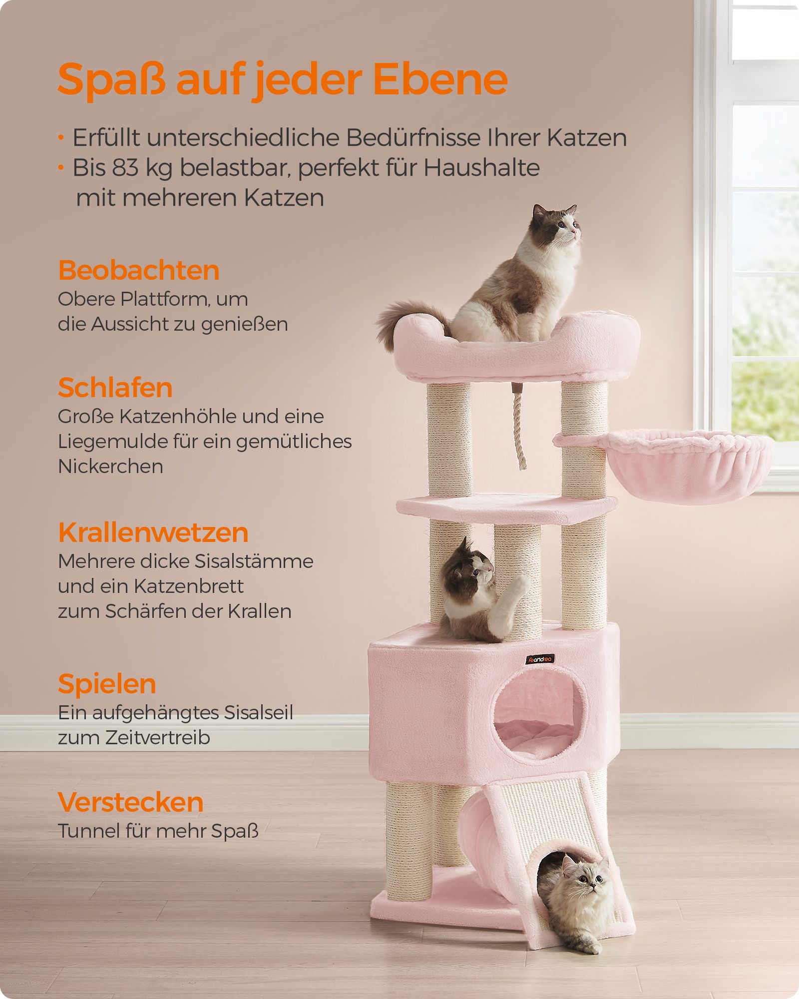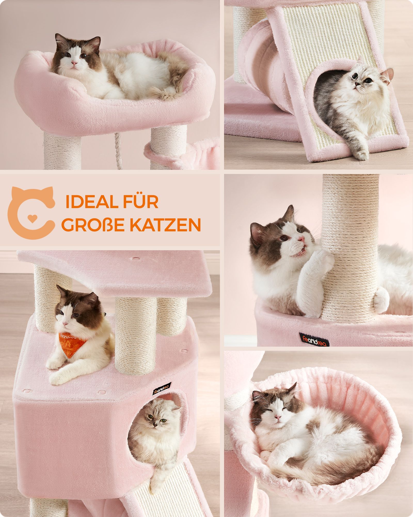 Feandrea Stor kradsetr?, M Kattetr?, med hule, h?ngek?je, plysplatform, tunnel, sisalstammer, kradsebr?t, 50 x 50 x 141 cm, lysegr?-naturfarvet PCT002N01