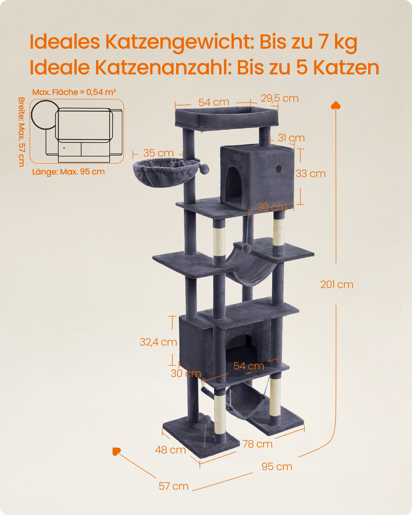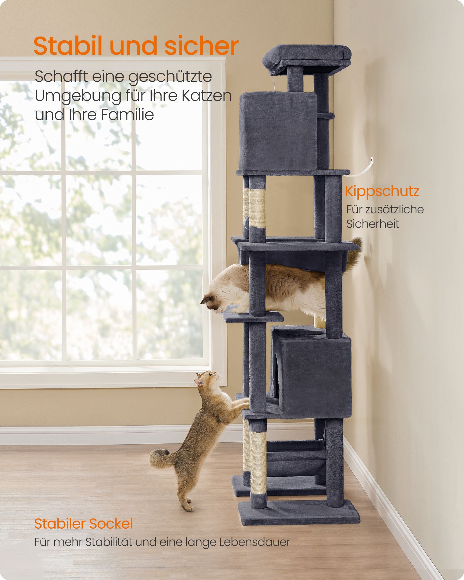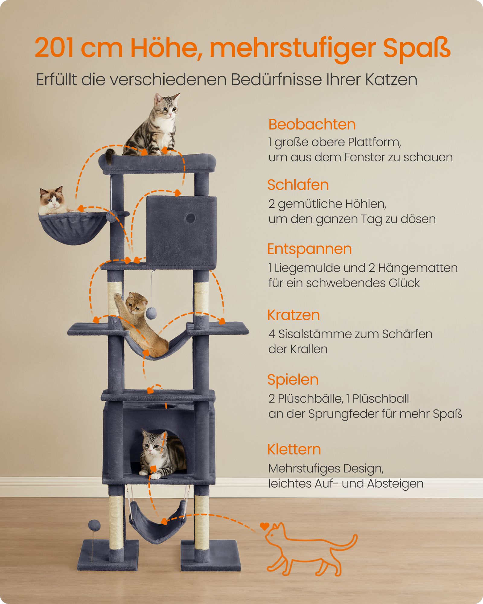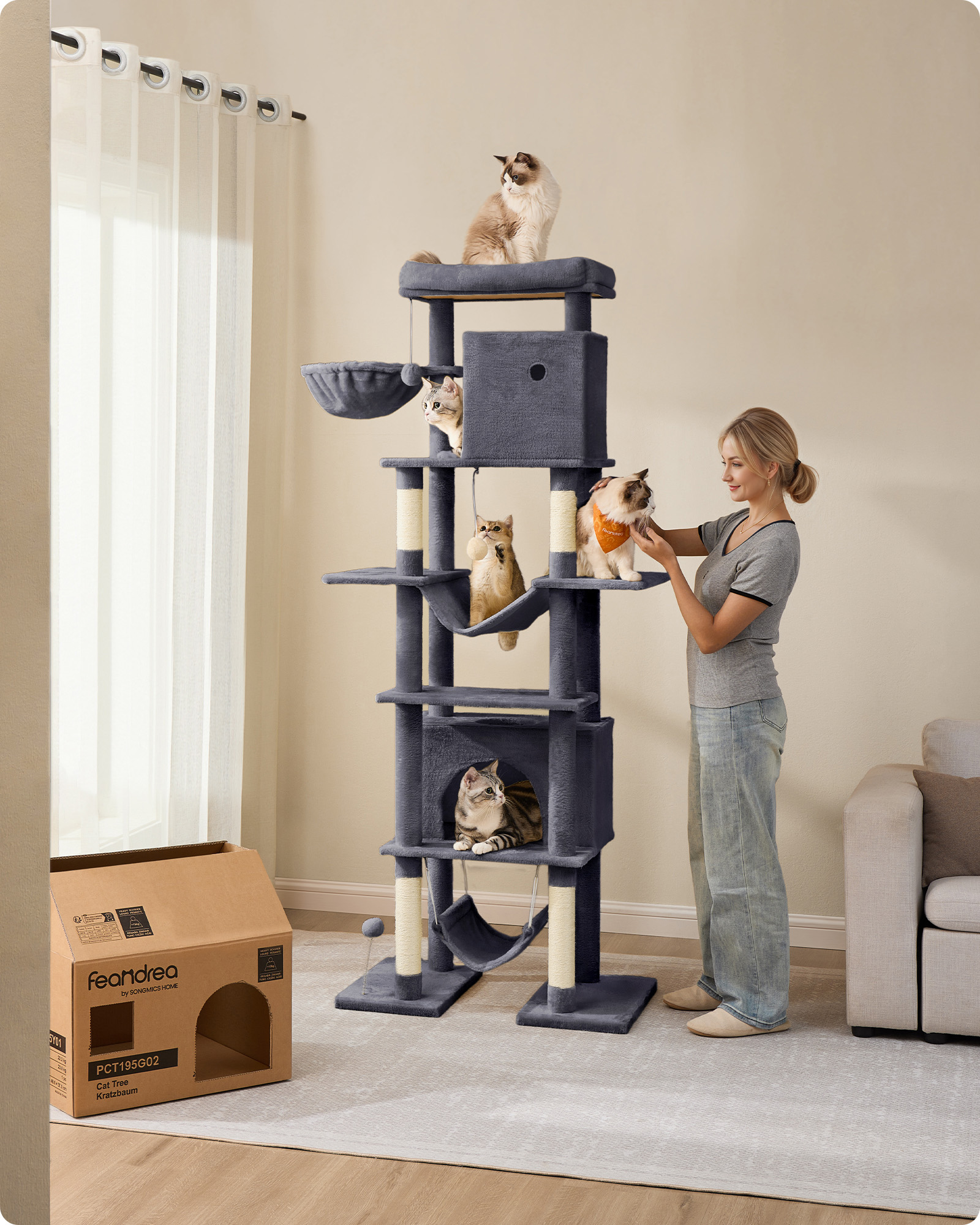 Feandrea Kratzbaum stor, katteklatrestativ XXL, fleretages katteklatrestativ, 201 cm h?j, med en platform, en liggeplads, 2 kattehuler, 2 h?ngek?jer, v?ltesikring, lysegr? PCT195G01