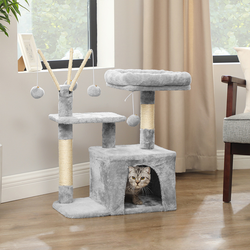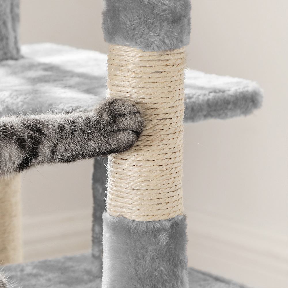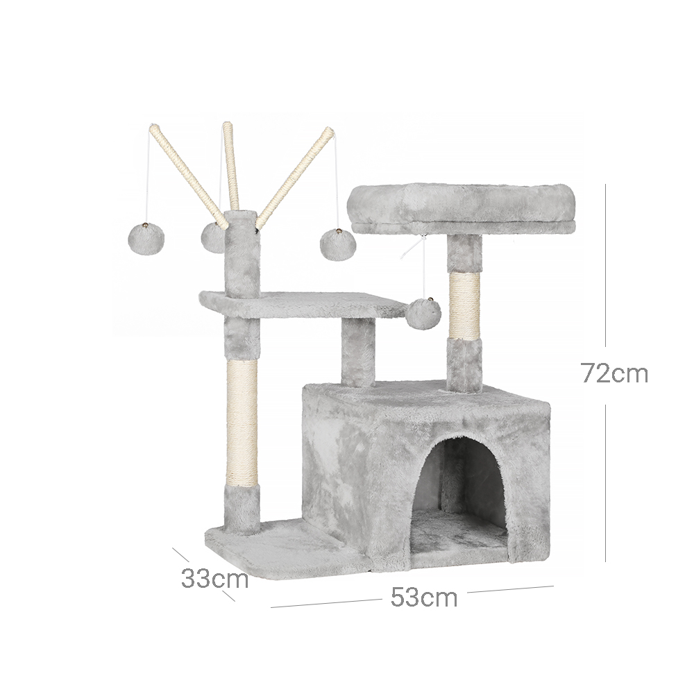 I FEANDREAs kreative v?rksteder springer to s?de killinger rundt, som personligt unders?ger alle kradsetr?er og giver deres dyriske feedback. P? den m?de f?r FEANDREAs designere f?rsteh?nds- eller rettere sagt f?rste-pote-information om, hvorvidt produkterne lever op til de fork?lede snorh?rede dyrs krav.Denne kradsetr?ets h?jdepunkter p? et blik: 4 pelsbolde for ekstra sjov 1 gennemt?nkt udsigtsplatform til observation 1 behagelig hyggekurv til at gemme sig i og tage en lur Bl?dt plysbetr?k, som en krammer Produktdetaljer:Farve: Lysegr? Materiale: Sp?nplade, plys, sisal St?rrelse: 53 x 32 x 72 cm (L x B x H) V?gt: 5,4 kg Leveringsomfang: 1 x kradsetr? 1 x tippesikring 1 x tilbeh?rspakke 1 x vejledning (DE, EN, FR, ES, IT) FEANDREA Bem?rkninger:Hvis dine katte tygger p? pelsbolden eller elastikken, skal du straks fjerne leget?jet og opbevare det et sted, hvor din kat ikke kan komme til det. Hvis kattehulen bliver beskadiget, skal du reparere eller udskifte den i tide for at undg? skader fra beskadigede dele.Fastg?r dette produkt til v?ggen med den medf?lgende v?gbeskyttelse for at sikre sikker brug.