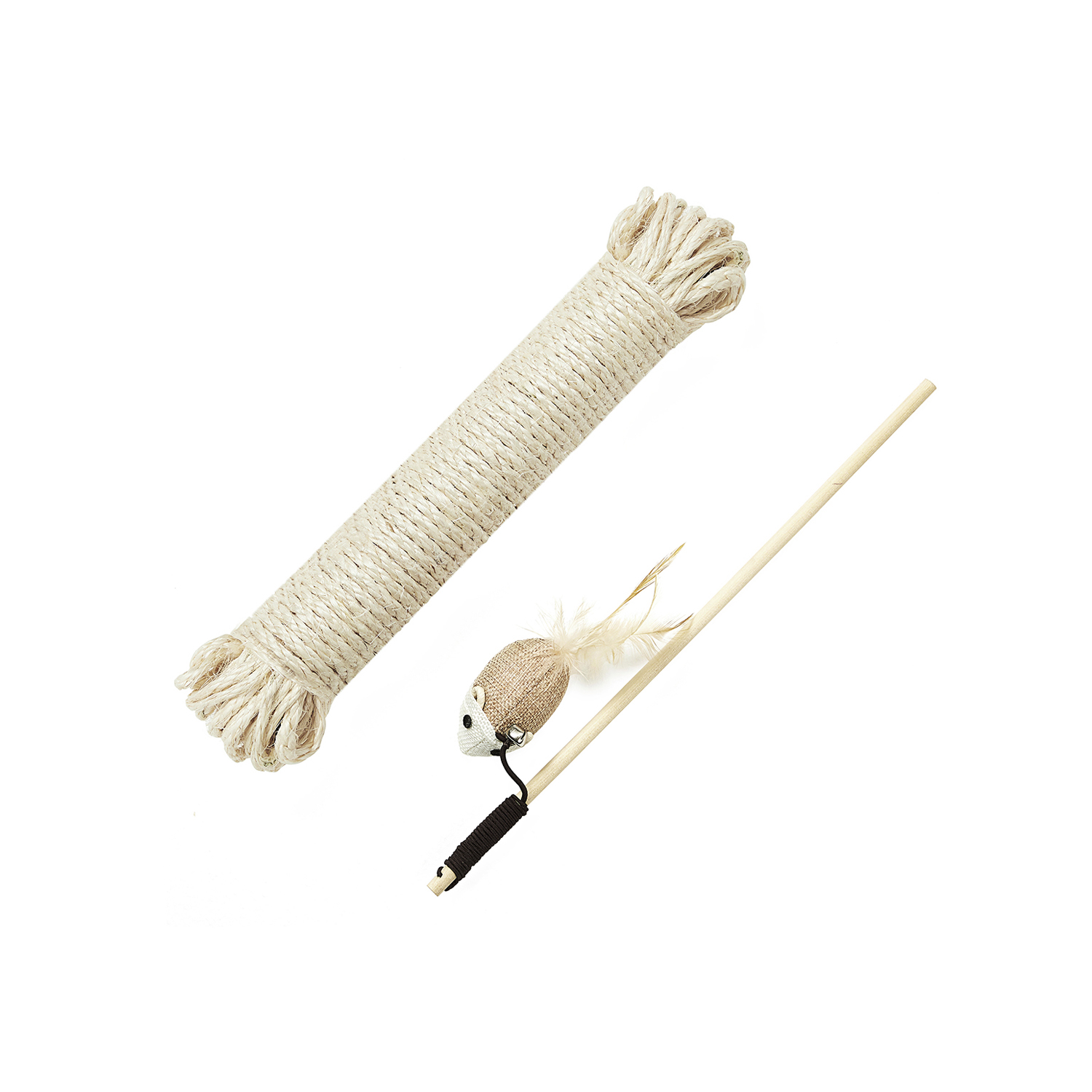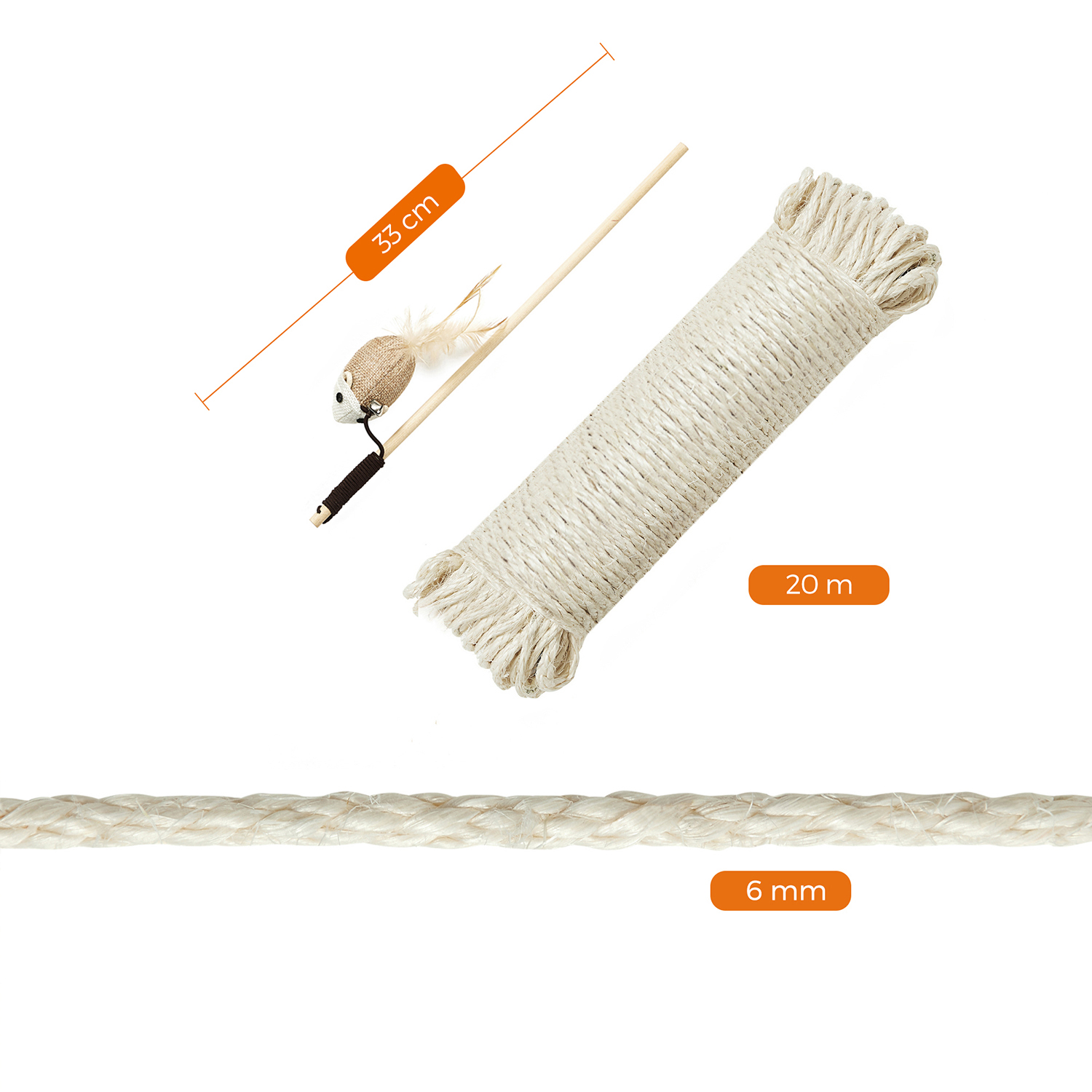 Produktdetaljer: – Farve: Beige – Materiale: Sisal – St?rrelse: 6 mm x 20 m (? x L) – L?ngde p? legestangen: 33 cm – V?gt: 0,4 kg Leveringsomfang: – 1 x Sisalreb – 1 x Katteleget?j Bem?rkninger: – Tr?k rebet stramt under monteringen.- Det anbefales at b?re handsker under brug. – Lad ikke din kat tygge p? eller spise kattet?jet. – Produktet kan lugte “nyt”, n?r det pakkes ud. I s? fald kan du placere det i et godt ventileret rum, s? lugten forsvinder efter kort tid.