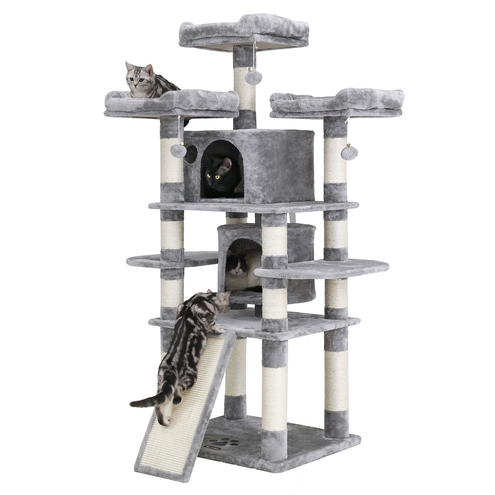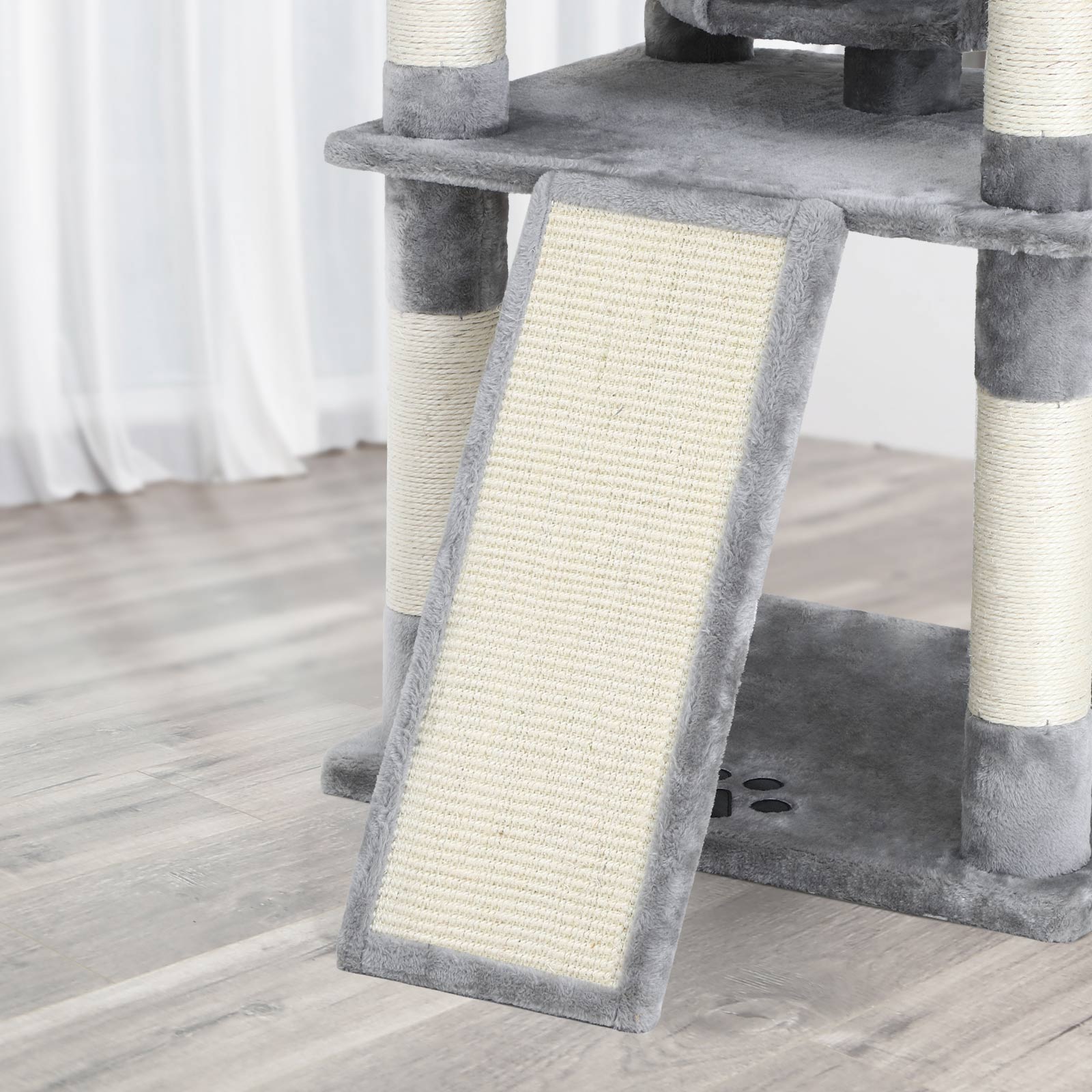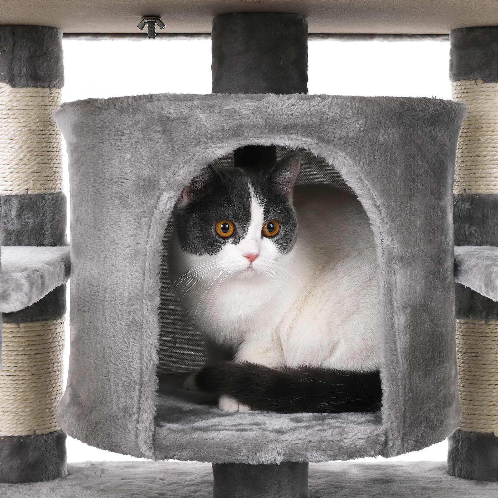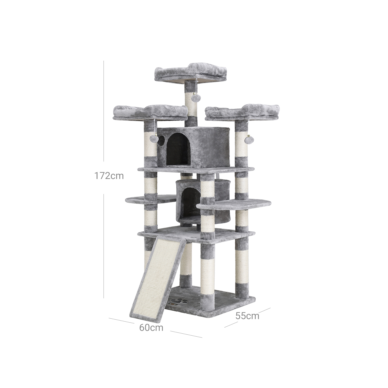 En kradsetr? med mange fordele Det ovenfor viste klatret?rn har best?et kattens test. De to store hyggelige huler og de 3 bl?de udsigtsplatforme var is?r popul?re. Men ogs? kradsebr?ttet i den nederste del af katteleget?jet var meget efterspurgt. Derudover f?lte de to testere sig sikre og sprang uden frygt fra platform til platform. Den h?je stabilitet af dette klatrestativ sikres is?r af de tykke sisalstammer og den forst?rkede bundplade. Der medf?lger ogs? en v?ltesikring. Produktdetaljer: – Farve: Lysegr? – Materiale: Sp?nplade, plys, sisal – St?rrelse: 60 x 55 x 172 cm (L x B x H) – V?gt: 29,1 kg Leveringsomfang: – 1 x kradsetr? – 1 x vejledning (DE, EN, FR, ES, IT) FEANDREA Bem?rkninger:- Placer kradsetr?et p? et plant underlag i et hj?rne af din bolig. – Produktet m? ikke opstilles i fugtige omgivelser. – Hold b?rn v?k fra dette produkt. De m? hverken klatre op p? kradsetr?et eller lege med det. – Hvis din kat fors?ger at spise pelsbolde eller det elastiske b?nd, skal du straks fjerne dette leget?j.- Brug v?gbeskyttelsen til at fastg?re produktet til v?ggen. – Hvis hyggekurven er beskadiget, skal du straks kontakte os, s? dette element af kradsetr?et kan udskiftes, eller der kan findes en anden l?sning. Beskadigede dele kan for?rsage skader, s? udskift dem straks.