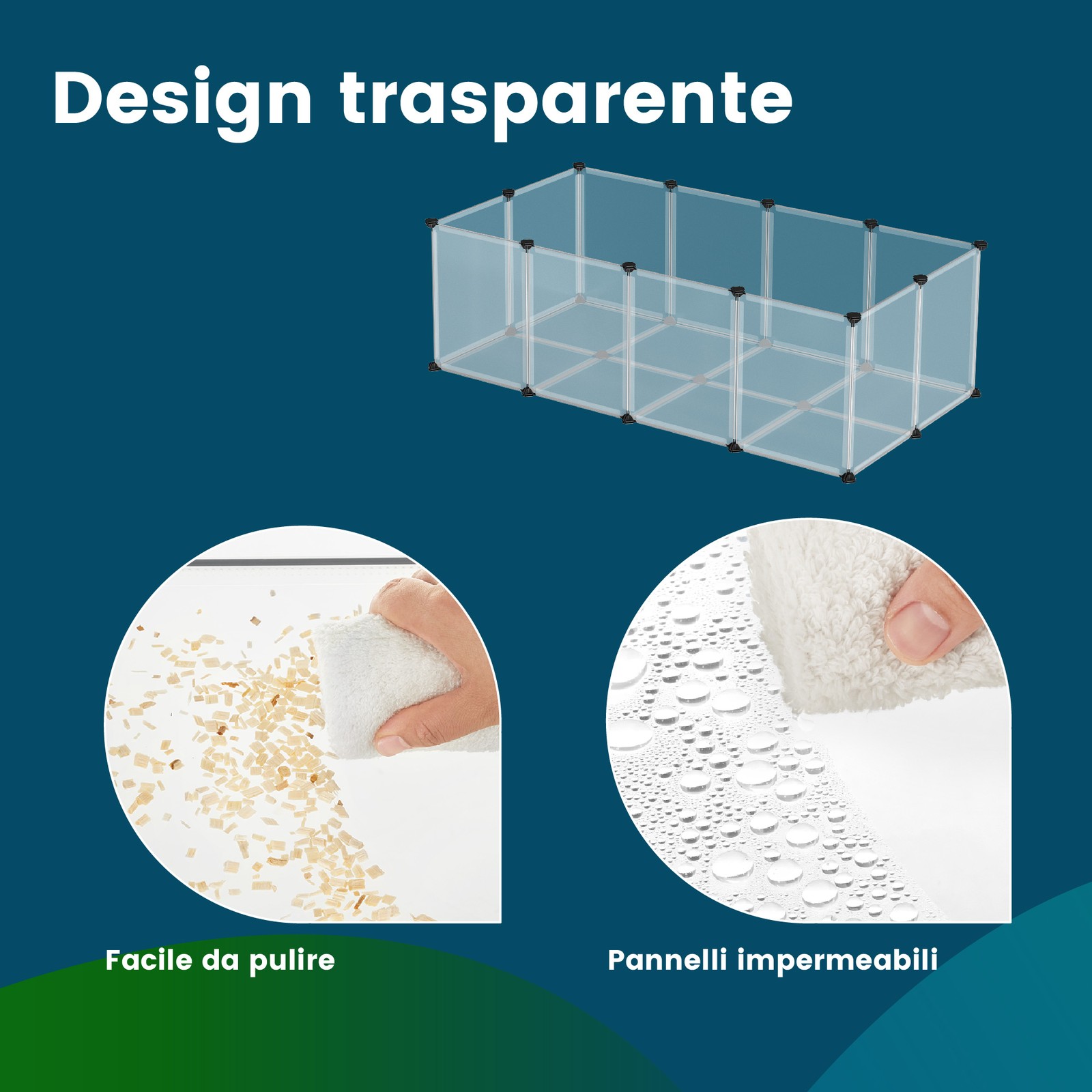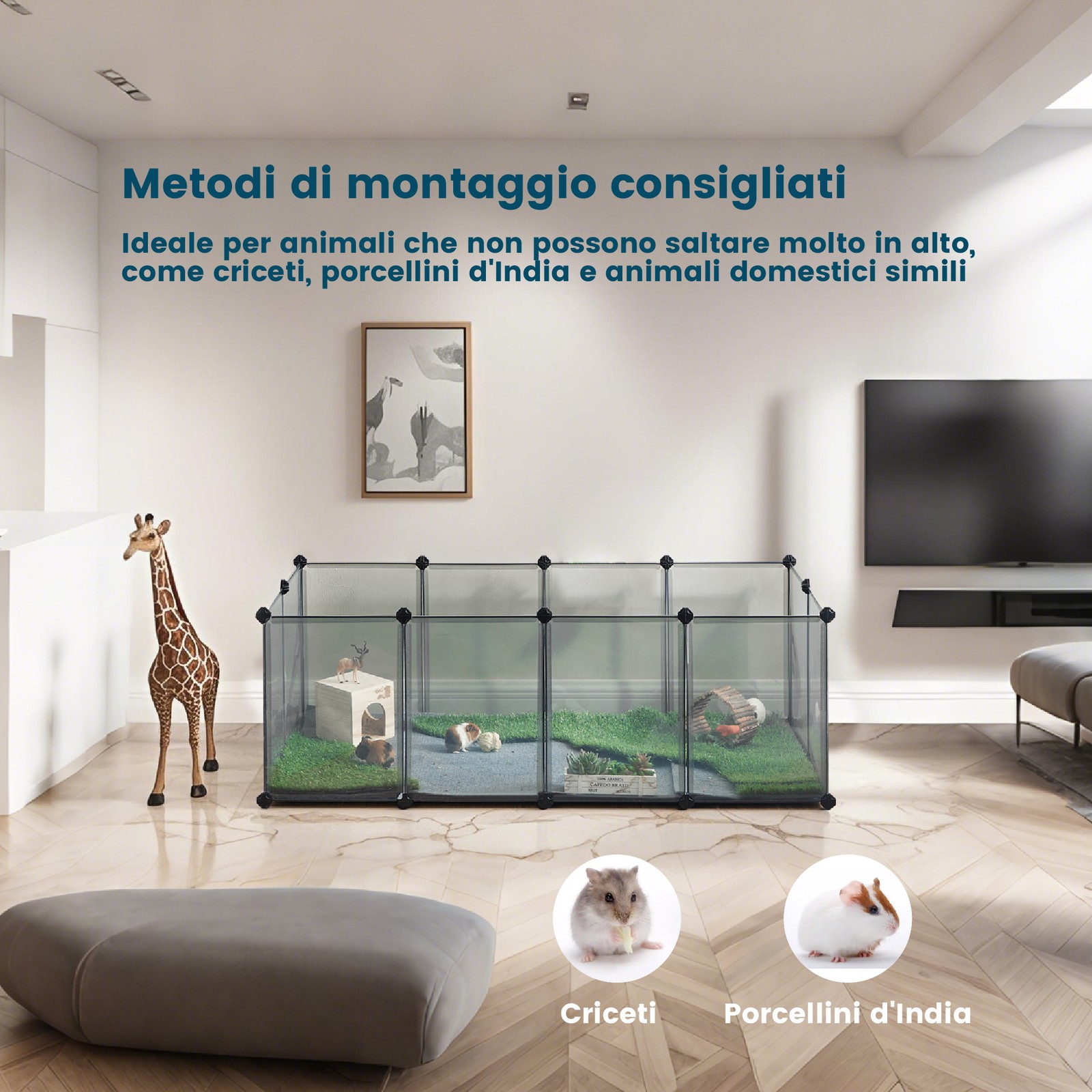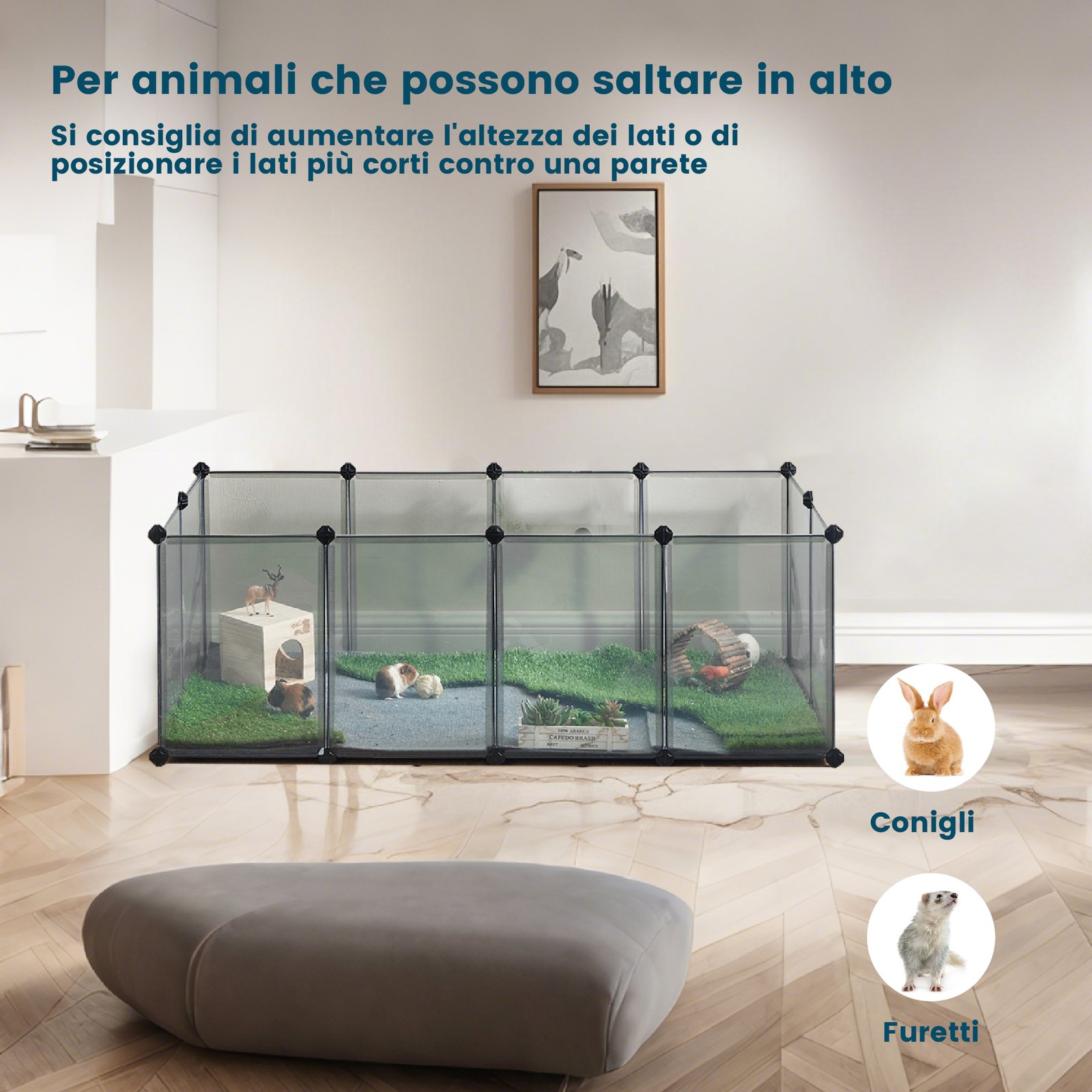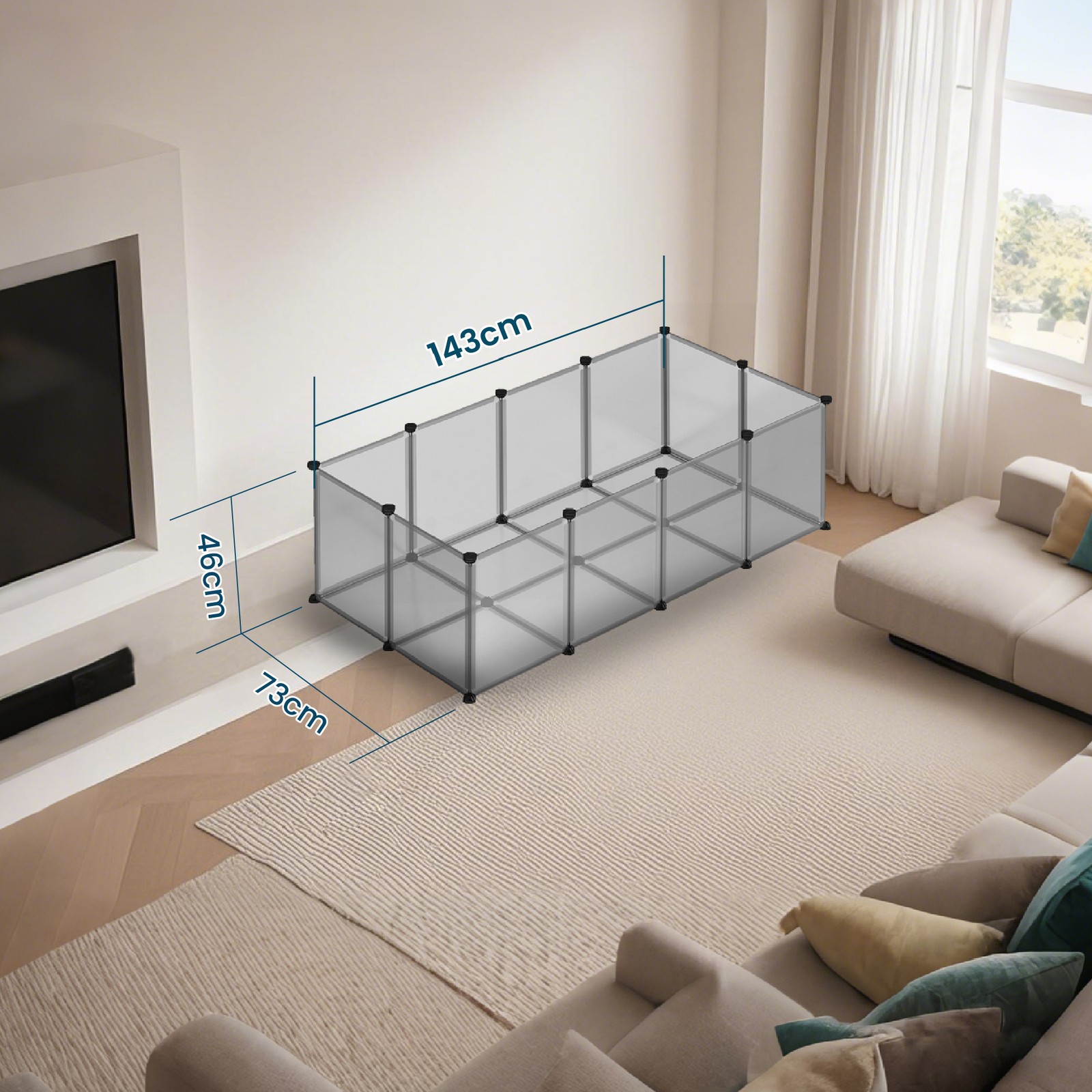 Fleksibelt udend?rs bur til sm? dyr: Byg et individuelt l?beg?rd med masser af bev?gelsesfrihed til dit k?ledyr, s? dine marsvin eller kaniner f?ler sig trygge og som en del af familien. Plastpladerne kan monteres fleksibelt (dog kun i en vinkel p? 90? eller 180?).Let at montere: Hegnet kan monteres hurtigt og nemt ? du skal blot f?lge den medf?lgende vejledning. Vi leverer desuden en lille hammer for at lette monteringen. De 30 kabelbindere s?rger desuden for ekstra stabilitet. Enkelt, men alligevel sikkert: De halvgennemsigtige plastplader giver dig mulighed for at se og holde ?je med dine sm? pelsdyr. Plastmaterialet er desuden lugtfrit og let at reng?re med en klud. Produktdetaljer: Farve: Gr? Materiale: PP-plastplader, ABS-plastforbindelsesstykker St?rrelse: 143 x 73 x 46 cm (L x B x H) V?gt: 4,15 kg Leveringsomfang: 12 x plastplade (45 x 35 cm) 8 x plastplade (35 x 35 cm) 27 x plastforbindelsesstykke 30 x kabelbinder 1 x hammer 1 x vejledning (DE, EN, FR, ES, IT) SONGMICS Bem?rkninger: Dette bur er kun egnet til sm? dyr. Brug det ikke til hunde og katte. S?rg for, at plastpladerne klikker helt fast i plastforbindelsesstykkerne under monteringen for at ?ge indhegningens stabilitet. Forbind to plastplader, der er placeret ved siden af hinanden, med kabelbindere. S?t dig ikke p? dette produkt, og hold det v?k fra ild og varmekilder. Opstil ikke dette produkt udend?rs i l?ngere tid.
