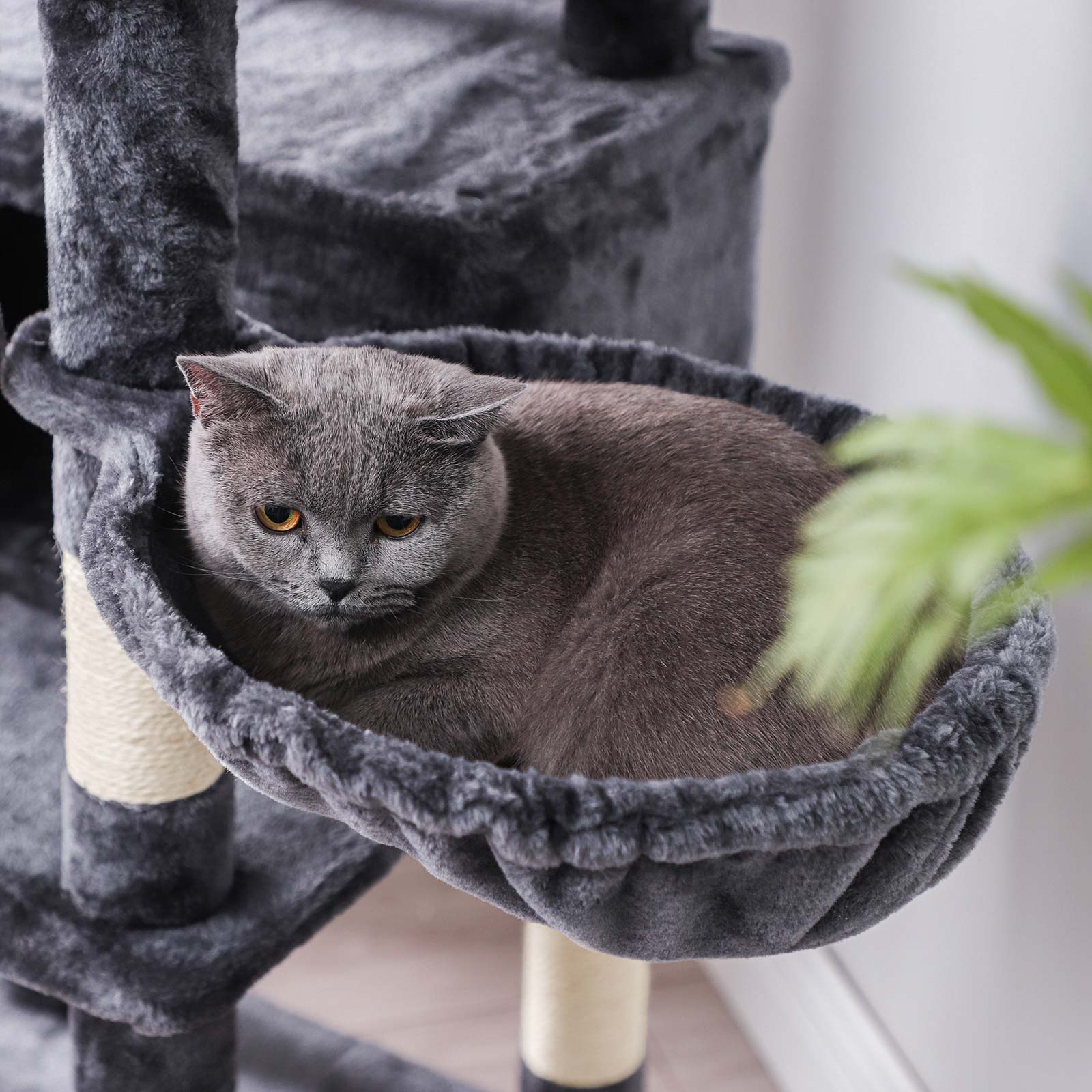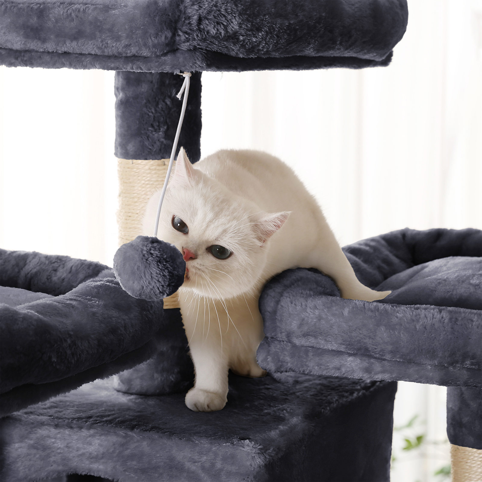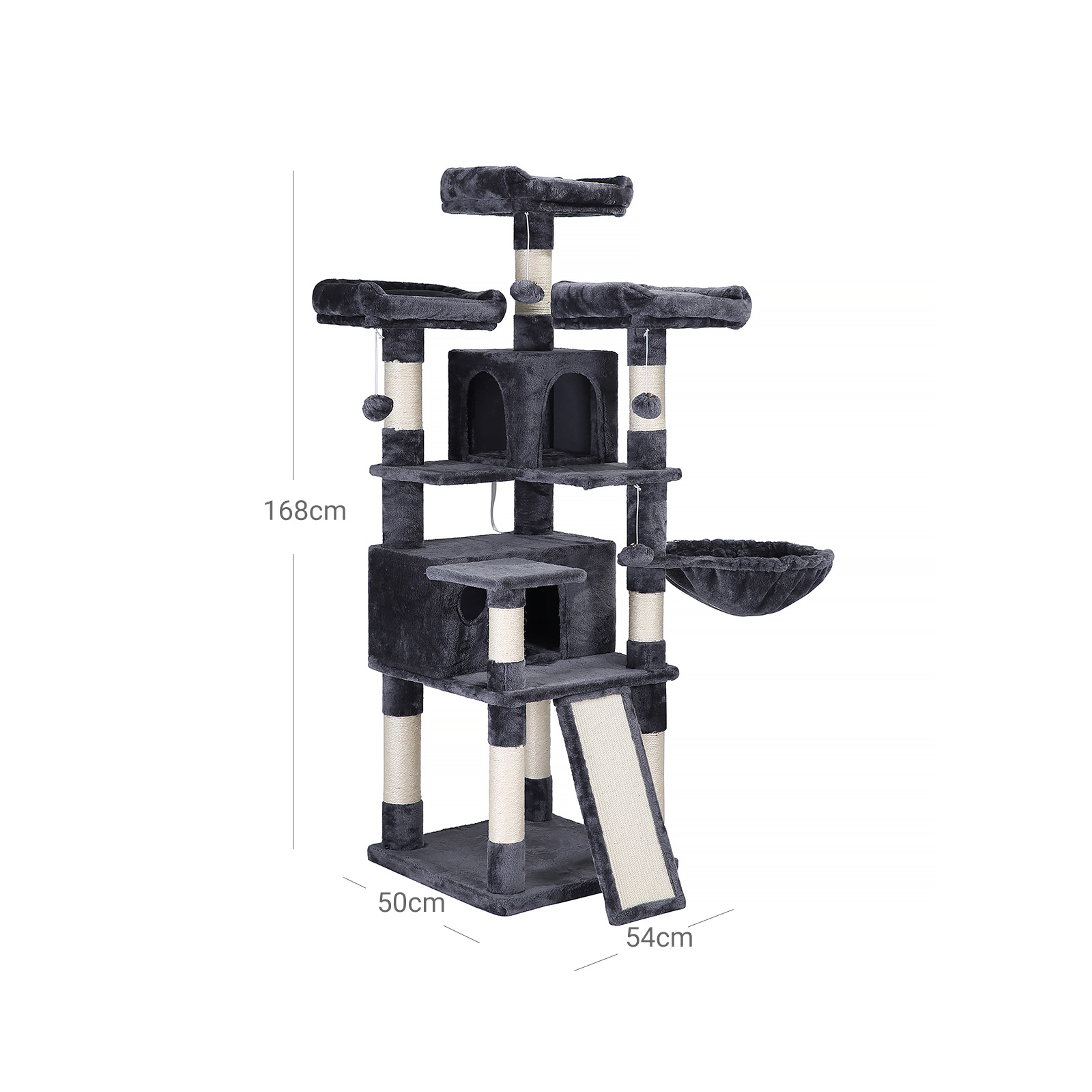 I FEANDREAs kreative v?rksteder springer to s?de killinger rundt, som personligt unders?ger alle kradsetr?er og giver deres dyriske feedback. P? den m?de f?r FEANDREAs designere f?rsteh?nds- eller rettere sagt f?rste-pote-information om, hvorvidt produkterne lever op til de fork?lede snorh?rede dyrs krav. Denne kradsetr?ets h?jdepunkter p? et blik: – Dejligt stort; plads til 3 katte, der hver is?r ikke b?r veje mere end 7 kg – 3 godt polstrede udsigtsplatforme med forh?jede kanter til afslapning – 2 behagelige hyggekroge til at lege gemmeleg og slappe af- XXL-kradsebr?t og stolper omviklet med sisalreb, s? din kat kan efterlade spor de rigtige steder – Stabil liggeplads til en lur – Robust base og vippesikring for mere stabilitet og sikkerhed – 3 pelsbolde for mere sjov – Betr?k af slidst?rkt, bl?dt plys Produktdetaljer: – Farve: R?ggr? – Materiale: Sp?nplade, plys, sisal – St?rrelse: 54 x 50 x 168 cm (L x B x H) – V?gt: 21 kg Leveringsomfang: – 1 x kradsetr? – 1 x v?ltebeskyttelse – 1 x monteringsudstyr – 1 x vejledning (DE, EN, FR, ES, IT) FEANDREA Bem?rkninger:- Hvis hyggekurven eller betr?kket er blevet beskadiget, bedes du straks kontakte vores kundeservice for at f? en erstatning eller finde en anden l?sning, s? skader som f?lge af beskadigede dele undg?s. – Fjern straks pelsbolde, hvis din kat tygger p? dem.