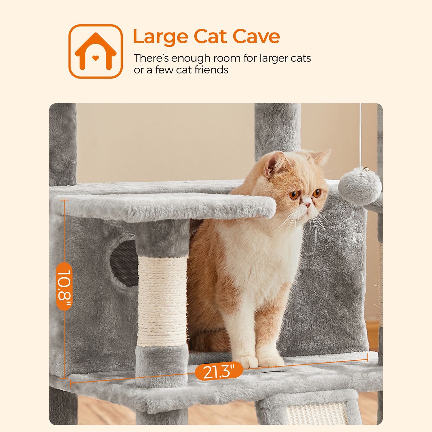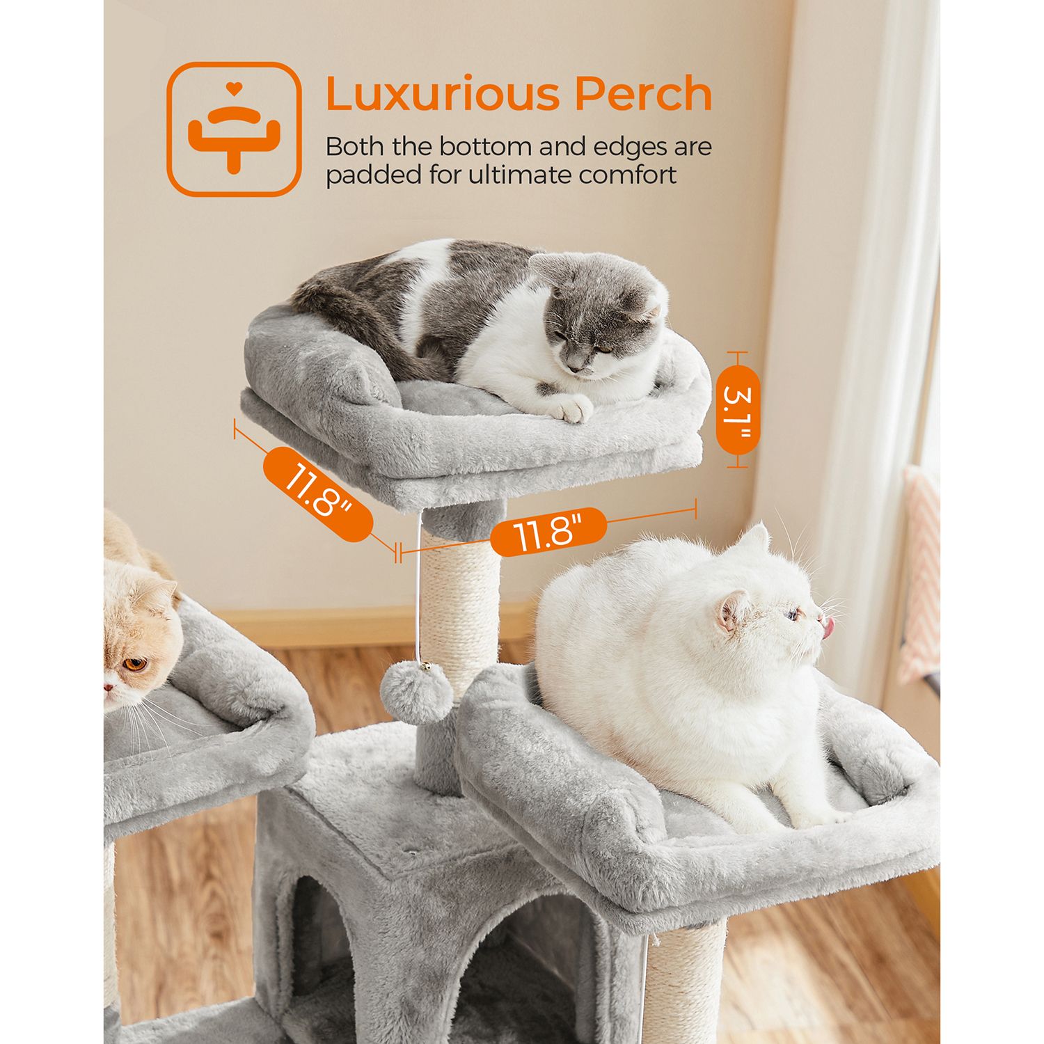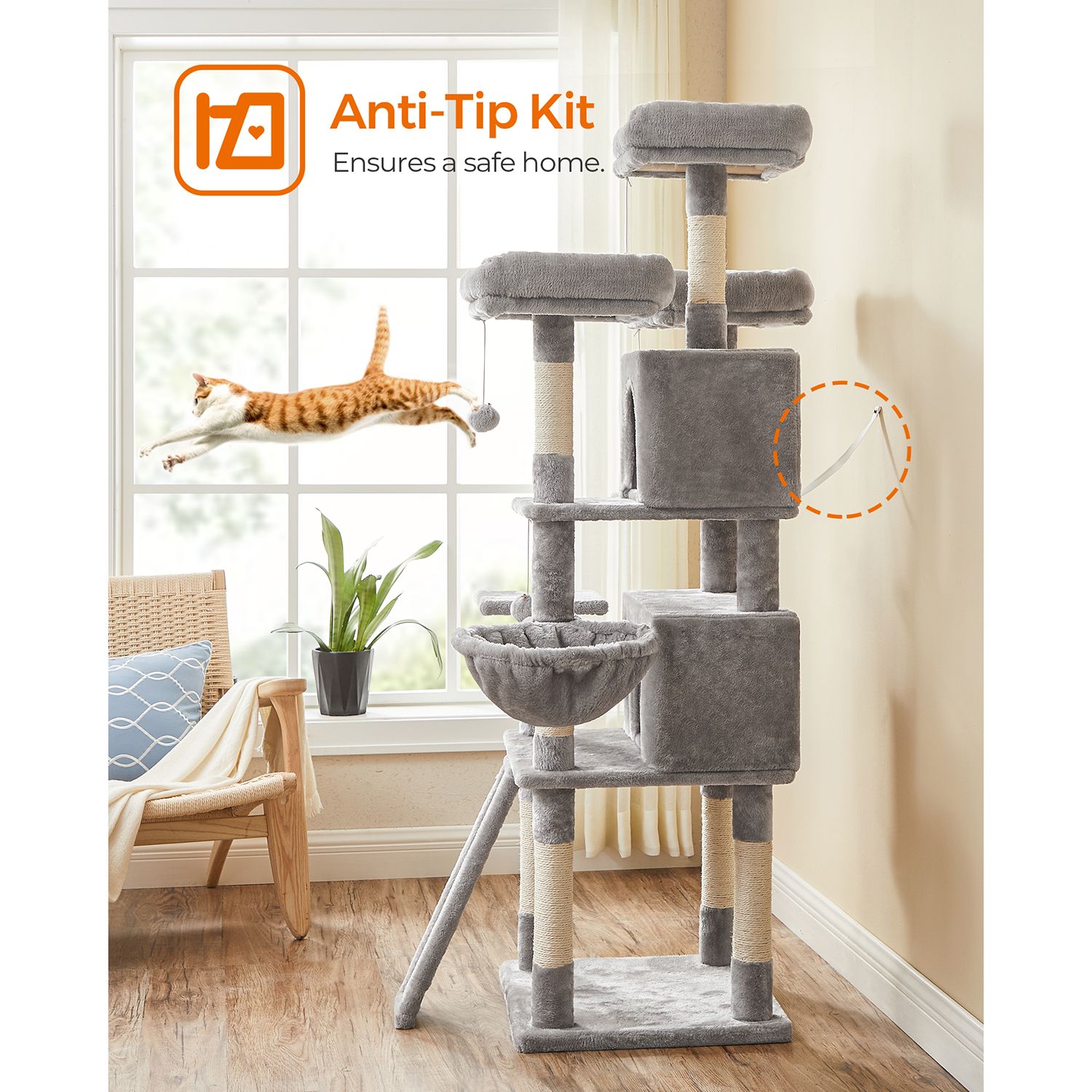 I FEANDREAs kreative v?rksteder springer to s?de killinger rundt, som personligt unders?ger alle kradsetr?er og giver deres dyriske feedback. P? den m?de f?r FEANDREAs designere f?rsteh?nds- eller rettere sagt f?rste-pote-information om, hvorvidt produkterne lever op til de kr?vende krav fra de fork?lede snorh?rede dyr. Denne kradsetr?ets h?jdepunkter p? et blik: – Dejligt stort; plads til 3 katte, der hver is?r ikke b?r veje mere end 7 kg – 3 godt polstrede udsigtsplatforme med forh?jede kanter til afslapning – 2 behagelige hyggekroge til at lege gemmeleg og slappe af- XXL-kradsebr?t og stolper omviklet med sisalreb, s? din kat kan efterlade spor de rigtige steder – Stabil liggeplads til en lur – Tr?forst?rket base og v?ltesikring for mere stabilitet og sikkerhed – 3 pelsbolde for mere sjov – Betr?k af slidst?rkt, bl?dt plys Produktdetaljer: – Farve: Lysegr? – Materiale: Sp?nplade, plys, sisal – St?rrelse: 55 x 55 x 168 cm (L x B x H) – V?gt: 22,2 kg Leveringsomfang: – 1 x kradsetr? – 1 x v?ltebeskyttelse – 1 x monteringsudstyr – 1 x vejledning (DE, EN, FR, ES, IT) FEANDREA Bem?rkninger:- Hvis den hyggelige hule eller betr?kket er blevet beskadiget, bedes du straks kontakte vores kundeservice for at f? en erstatning eller finde en anden l?sning, s? skader som f?lge af beskadigede dele undg?s. – Fjern straks pelsbolde, hvis din kat tygger p? dem.