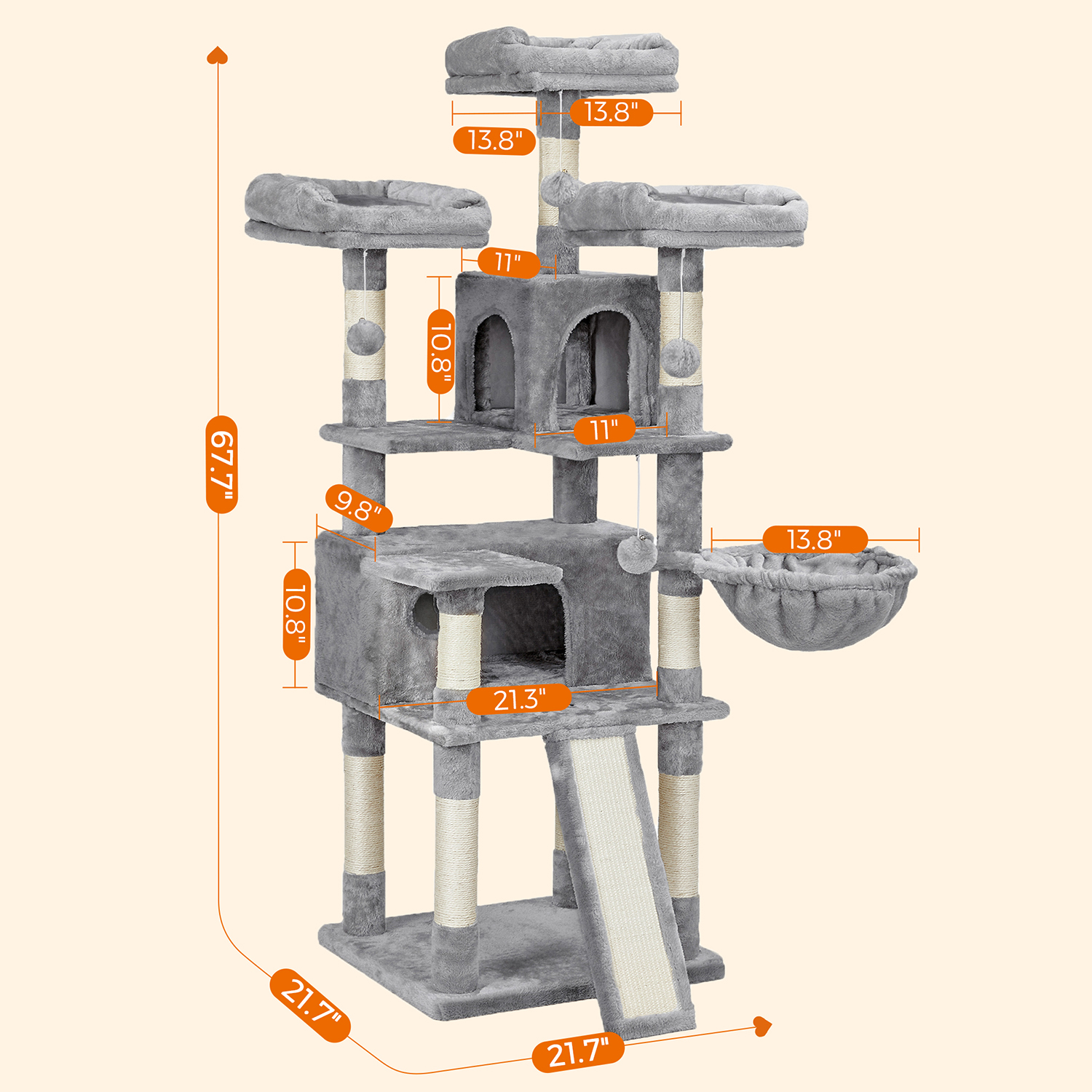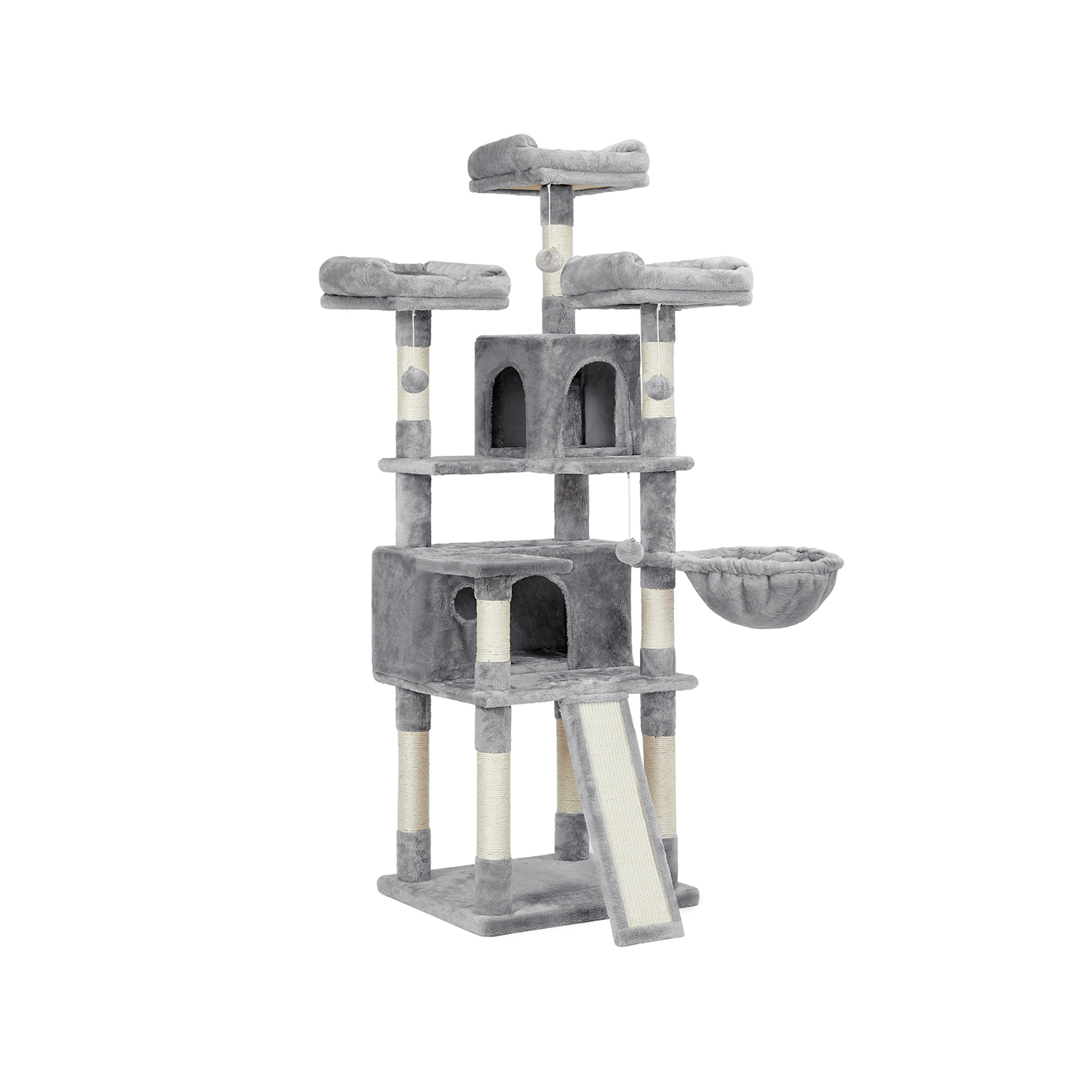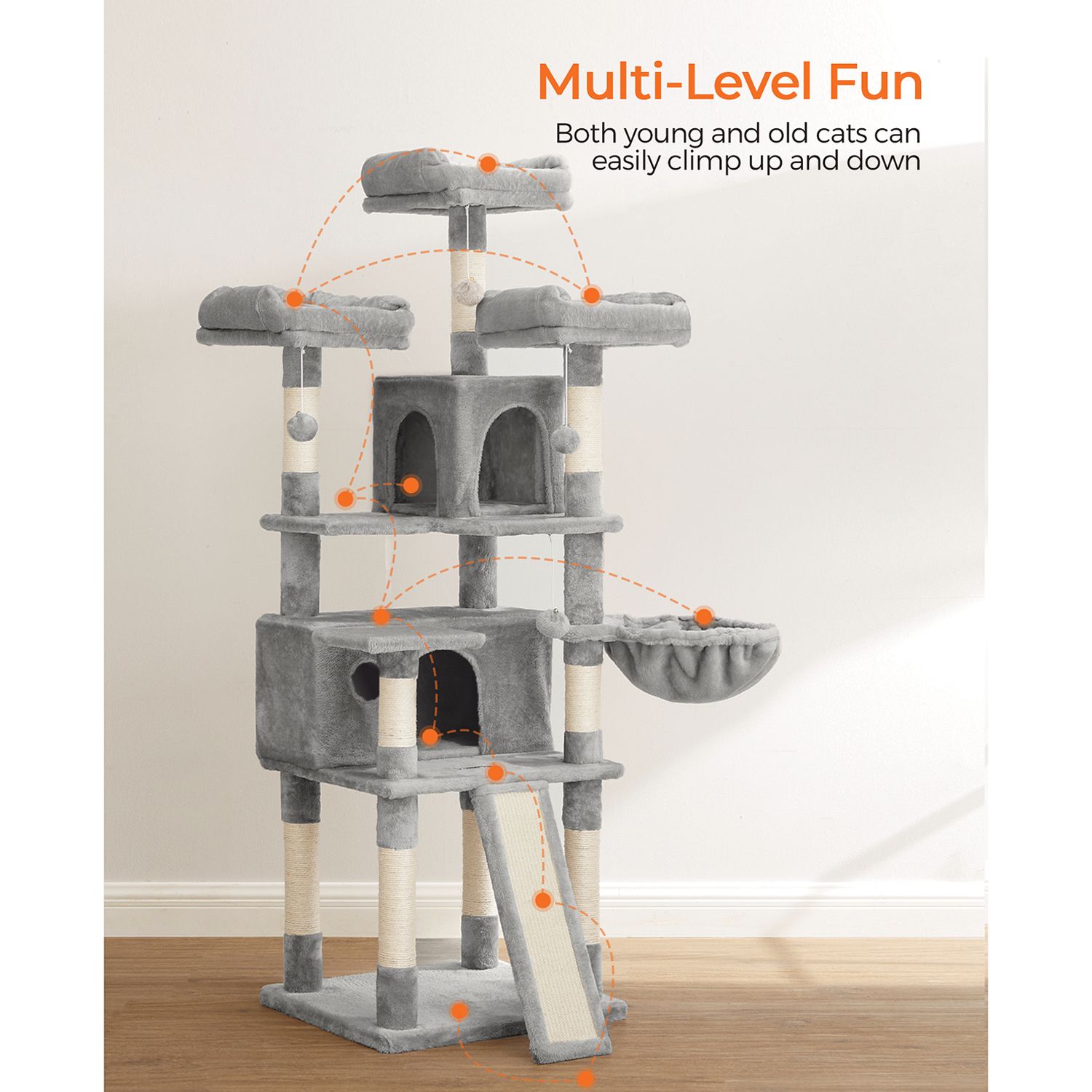 I FEANDREAs kreative v?rksteder springer to s?de killinger rundt, som personligt unders?ger alle kradsetr?er og giver deres dyriske feedback. P? den m?de f?r FEANDREAs designere f?rsteh?nds- eller rettere sagt f?rste-pote-information om, hvorvidt produkterne lever op til de kr?vende krav fra de fork?lede snorh?rede dyr. Denne kradsetr?ets h?jdepunkter p? et blik: – Dejligt stort; plads til 3 katte, der hver is?r ikke b?r veje mere end 7 kg – 3 godt polstrede udsigtsplatforme med forh?jede kanter til afslapning – 2 behagelige hyggekroge til at lege gemmeleg og slappe af- XXL-kradsebr?t og stolper omviklet med sisalreb, s? din kat kan efterlade spor de rigtige steder – Stabil liggeplads til en lur – Tr?forst?rket base og v?ltesikring for mere stabilitet og sikkerhed – 3 pelsbolde for mere sjov – Betr?k af slidst?rkt, bl?dt plys Produktdetaljer: – Farve: Lysegr? – Materiale: Sp?nplade, plys, sisal – St?rrelse: 55 x 55 x 168 cm (L x B x H) – V?gt: 22,2 kg Leveringsomfang: – 1 x kradsetr? – 1 x v?ltebeskyttelse – 1 x monteringsudstyr – 1 x vejledning (DE, EN, FR, ES, IT) FEANDREA Bem?rkninger:- Hvis den hyggelige hule eller betr?kket er blevet beskadiget, bedes du straks kontakte vores kundeservice for at f? en erstatning eller finde en anden l?sning, s? skader som f?lge af beskadigede dele undg?s. – Fjern straks pelsbolde, hvis din kat tygger p? dem.