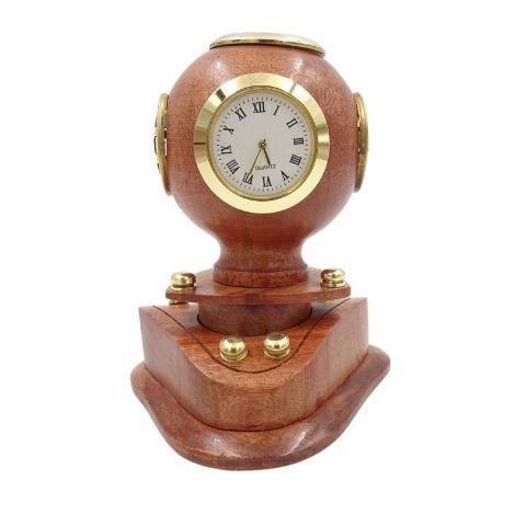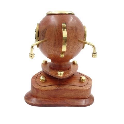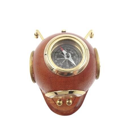 Lille dykkerhjelm med ur NC1220 Lille dykkerhjelm med ur er en charmerende dekoration, der vil appellere til elskere af undervandsudforskning. Et lille bordur tilføjer en maritim karakter til arbejdspladsen og understreger ejerens kærlighed til dykning. En dekorativ dykkerhjelm er en fantastisk gave til en dykker, en entusiast af havklimaet og undervandsverdenen. Dykkerhjelmen er lavet af træ og messing. I stedet for det forreste porthul er der et ur med hvid urskive, sorte bogstaver og guldvisere. Der er et lille kompas på toppen af hjelmen. Produktinformation: Materiale: træ, messing, glasDimensioner: 10 x 9,5 x 11,5 cmFarve: brun, messing