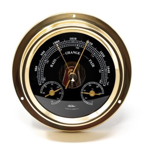 Marine vejrstation Fischer 1508BTH-45.6 Vi præsenterer en elegant, meget nøjagtig vejrstation produceret af det tyske firma Fischer. Sættet indeholder et barometer, et hygrometer og et termometer. Takket være Fisher-vejrstationen kan du holde styr på mikroklimaet i dit hjem. Barometeret giver dig mulighed for at observere trykfald og -stigninger. Hygrometeret viser luftfugtigheden i dit hjem, og du kan aflæse temperaturen på termometeret. Dette produkt er fremstillet i nautisk stil. Det smukke gyldne kabinet ser fantastisk ud. Kombinationen af det gyldne kabinet og den sorte urskive med gyldne accenter ser yderst elegant ud og vil tilføre stil til dit rum. Dette produkt er både smukt og meget nyttigt. Det er et produkt af høj kvalitet, der er fremstillet af det kendte firma Fischer. Firmaet Fischer blev grundlagt i 1945 i Drebach, Tyskland, og har siden da fremstillet barometre, hygrometre og termometre. Det har over 70 års erfaring i denne branche. I dag er Fischer en velkendt og respekteret leverandør af produkter af høj kvalitet. Alle produkter er håndlavede udelukkende i Erzgebirge i Tyskland. Dimensioner: Diameter 12,5 cm. Andre produktegenskaber: Navne på skjoldene på engelsk. Nøjagtighed af barometermåling: ± 3 hPa, nøjagtighed af hygrometermåling: ± 3 % r.h. (20 … 100 %), +1 gradueringsskala Nøjagtighed af termometermåling: ± 1 K OBS! Skalering af barometer, termometer og hygrometer er udført på fabrikken. På grund af f.eks. kraftige stød kan det dog være nødvendigt at foretage en ny regulering. For at gøre dette skal du i tilfælde af barometer og hygrometer bruge en skruetrækker og justere skruen på bagsiden af enheden i henhold til instruktionerne i den medfølgende manual. I tilfælde af et termometer kan det, når kviksølvkolonnen er revet fra hinanden, repareres ved at ryste kolonnen kraftigt flere gange.