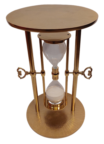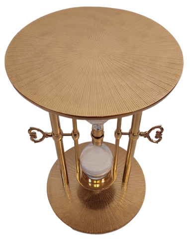 Metalbord med timeglas 30 minutter – 1051 Metalbord med timeglas 30 minutter er en usædvanlig kombination af elegance og funktionalitet, som passer perfekt ind i forskellige indretningsstilarter. Dette smukke metalbord i guld vil være et unikt dekorativt element i ethvert interiør. Dets uovertrufne design skiller sig ud fra andre møbler, og timeglasset, der måler tiden i 30 minutter, bidrager til dets unikke karakter. Timeglasset kan vendes. Det vil fungere perfekt som et blikfang i dit interiør, tiltrække opmærksomhed og tilføje en unik charme. Bordets dimensioner (40 x 40 x 60 cm) gør det til et perfekt supplement til din stue, soveværelse eller kontor. Det er fremstillet af holdbart metal og glas, hvilket garanterer holdbarhed og stabilitet. Dens gyldne farve tilføjer elegance til interiøret, både i rum indrettet i glamourøs, industriel stil og i mere klassiske rum, hvor dette bord kan være et interessant modspil. Produktinformation: Materiale: metal og glas Mål: 40 x 40 x 60 cm Stil: Passer til både glamourøse, industrielle og klassiske interiører Farve: Guld Udstyret med et timeglas, der måler 30 minutter Kombination af funktionalitet og æstetik