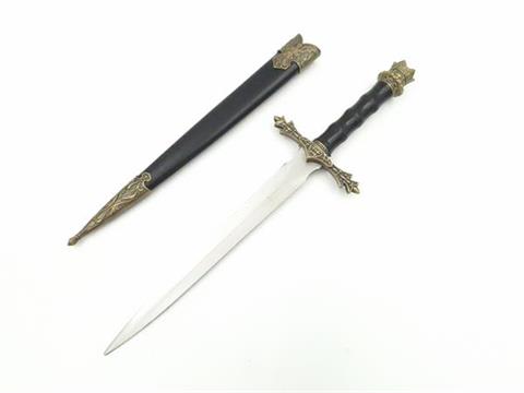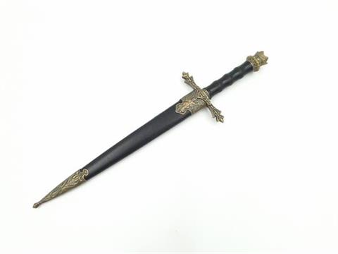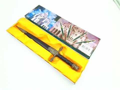 Middelalderlig dolk – SW-075 Smuk ridderdolk – replika – dekorativ genstand. Det er et elegant, unikt tilbehør, der kan være en interessant gave, der vil tage modtageren med tilbage til middelalderens slutning, en tid præget af store intriger. Dolken er et kort, hvidt våben, der hovedsageligt blev brugt i det 16. til 19. århundrede. Dolke har i årtier været et symbol på mord – i mange år blev de brugt til lydløse mord, herunder eliminering af politiske modstandere, såsom Julius Cæsar. Dette er ikke et våben – dolken har en sløvet klinge. Produktinformation: Længde – 34 cm Materiale: stål og plast Emballage: papæske, farvet, foret med gult.
