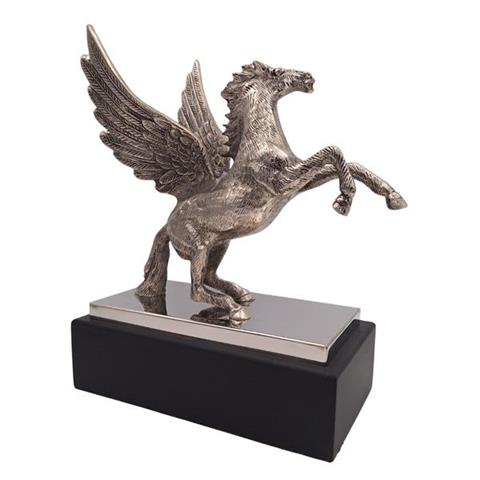 Pegasus – dekorativ aluminiumsfigur på en base af stål og træ – NI9935 Leder du efter en stilfuld og moderne dekoration til dit interiør? Pegasus-figuren er det perfekte valg! Den elegante kombination af aluminium og træ vil tilføre karakter til ethvert rum. Pegasus er perfekt til moderne, minimalistiske interiører såvel som til mere klassiske indretninger. Den vil være en smuk accent på en kommode, en hylde eller et skrivebord. Pegasus-figuren er også en god gaveidé til elskere af heste, græsk mytologi eller blot smukke genstande. Pegasus er et fascinerende væsen, der har inspireret mennesker over hele verden i århundreder. Den er et symbol på mange værdier, såsom inspiration, poesi, kunst og frihed. Produktinformation: Mål: 27,5 x 16 x 36 cmMateriale: aluminiumsfigur, stål- og træfodFarve: sølv, sort fodHøj kvalitetElegant dekoration