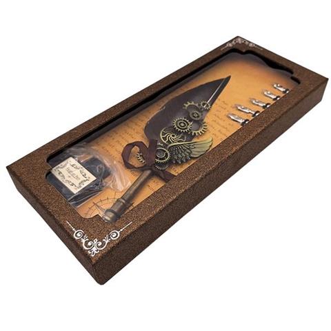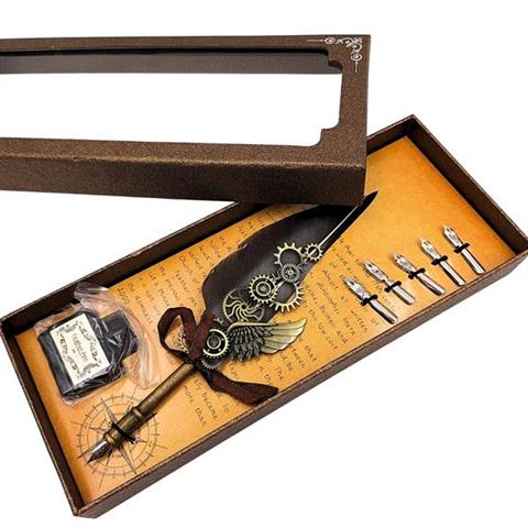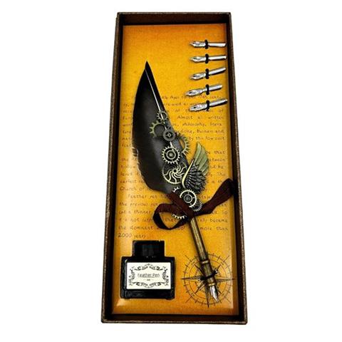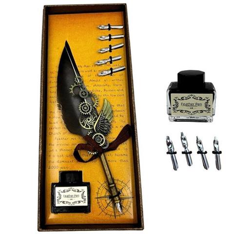 Retro kalligrafisæt med vintage gåsefjederpen + 6 penne + blæk – EE5 Kalligrafisæt i retrostil designet til håndskrift og dekorative skriveprojekter. Inkluderer en gåsefjederpen med detaljerede metaldekorationer, seks udskiftelige penne og en 15 ml blækflaske.  Produktinformation: GåsefjederpenPenfarve: Grå med metaldekorationerPenens dimensioner: Længde 22 cmAntal penne: 6Blækbeholder: 15 mlHøj kvalitetHåndværkStil: Retro / Vintage / Steampunk / Elegant