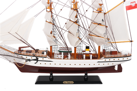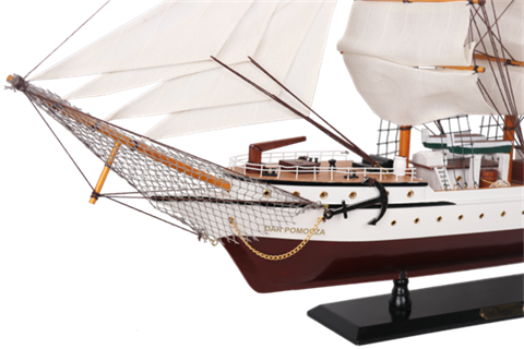 Sejlskibsmodel Dar Pomorza – DARPOM80 Skibsmodellen kan blive et centralt dekorativt element i dit kontor eller din stue. Den store størrelse gør, at den tiltrækker dine gæsters opmærksomhed. Præcist håndværk og elegant design gør produktet unikt. Produktinformation: Materiale: Modellen er lavet af træ (skrog og master), sejl af lærred, finishelementer (metal, plast).Model af høj kvalitet, omhyggeligt fremstillet med sans for detaljer.Levering af modellen i dele, der skal samles – opstilling af master, montering af bovspryd og tilslutning og spænding af liner. Monteringen tager ca. 10-15 minutter og kræver ingen værktøj. Mål: længde 80 cm, højde 57 cm, bredde 14 cm. Dar Pomorza er et tremastet træningssejlskib, kendt som den hvide fregat. En legende inden for polsk søfartsuddannelse. Dar Pomorza blev købt af det pommerske samfund i 1929 til søfartsskolen i Gdynia. Under polsk flag gennemførte “Dar Pomorza” 102 skolekrydstogter og sejlede en halv million sømil – en afstand svarende til ca. 25 rejser jorden rundt. Det blev berømt som det første skib i den polske handelsflådes historie, der sejlede jorden rundt, og uddannede 13.384 studerende.
