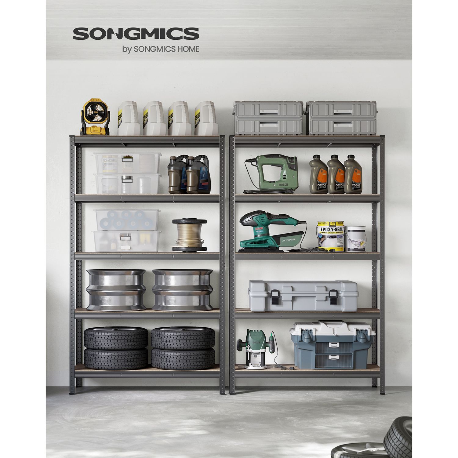 Produktdetaljer: Farve: Gr? Materiale: Pulverlakeret st?l, MDF (MDF) St?rrelse pr. reol: 60 x 120 x 200 cm (D x B x H) V?gt pr. reol: 22,8 kg Maks. statisk belastning pr. hylde: 175 kg Maks. statisk belastning i alt pr. reol: 875 kg Leveringsomfang: 2 x lagerreol 2 x vippesikring 1 x vejledning SONGMICS Bem?rkninger:Fastg?r produktet til v?ggen med den medf?lgende v?gbeskyttelse for at sikre sikkerheden under brug. Brug altid handsker under monteringen. Placer ikke produktet i et fugtigt milj?.Den maksimale belastning i teksten refererer til den maksimale statiske v?gt. For at lette transporten leveres produktet i 2 pakker. Disse ankommer normalt samtidig. V?r t?lmodig, hvis du f?rst modtager ?n pakke. Den anden pakke b?r ankomme kort tid efter.