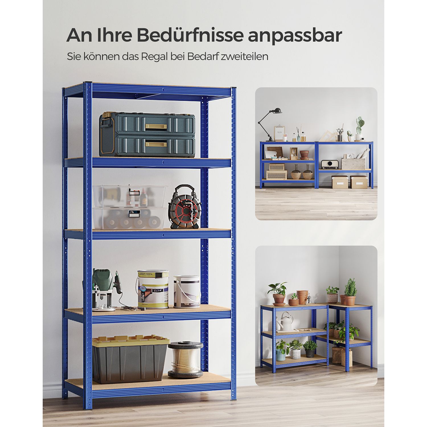 Produktdetaljer: Farve: Bl? Materiale: Pulverlakeret st?l, MDF (MDF) St?rrelse pr. reol: 50 x 100 x 200 cm (D x B x H) V?gt pr. reol: 16,8 kg Maks. statisk belastning pr. hylde: 120 kg Maks. statisk belastning i alt pr. reol: 600 kg Leveringsomfang: 2 x lagerreol 2 x v?ltebeskyttelse 1 x vejledning SONGMICS Bem?rkninger:Fastg?r produktet til v?ggen med den medf?lgende v?gbeskyttelse for at sikre sikkerheden under brug. Brug altid handsker under monteringen. Placer ikke produktet i et fugtigt milj?.Den maksimale belastning i teksten refererer til den maksimale statiske v?gt. For at lette transporten leveres produktet i 2 pakker. Disse ankommer normalt samtidig. V?r t?lmodig, hvis du f?rst modtager ?n pakke. Den anden pakke b?r ankomme kort tid efter.