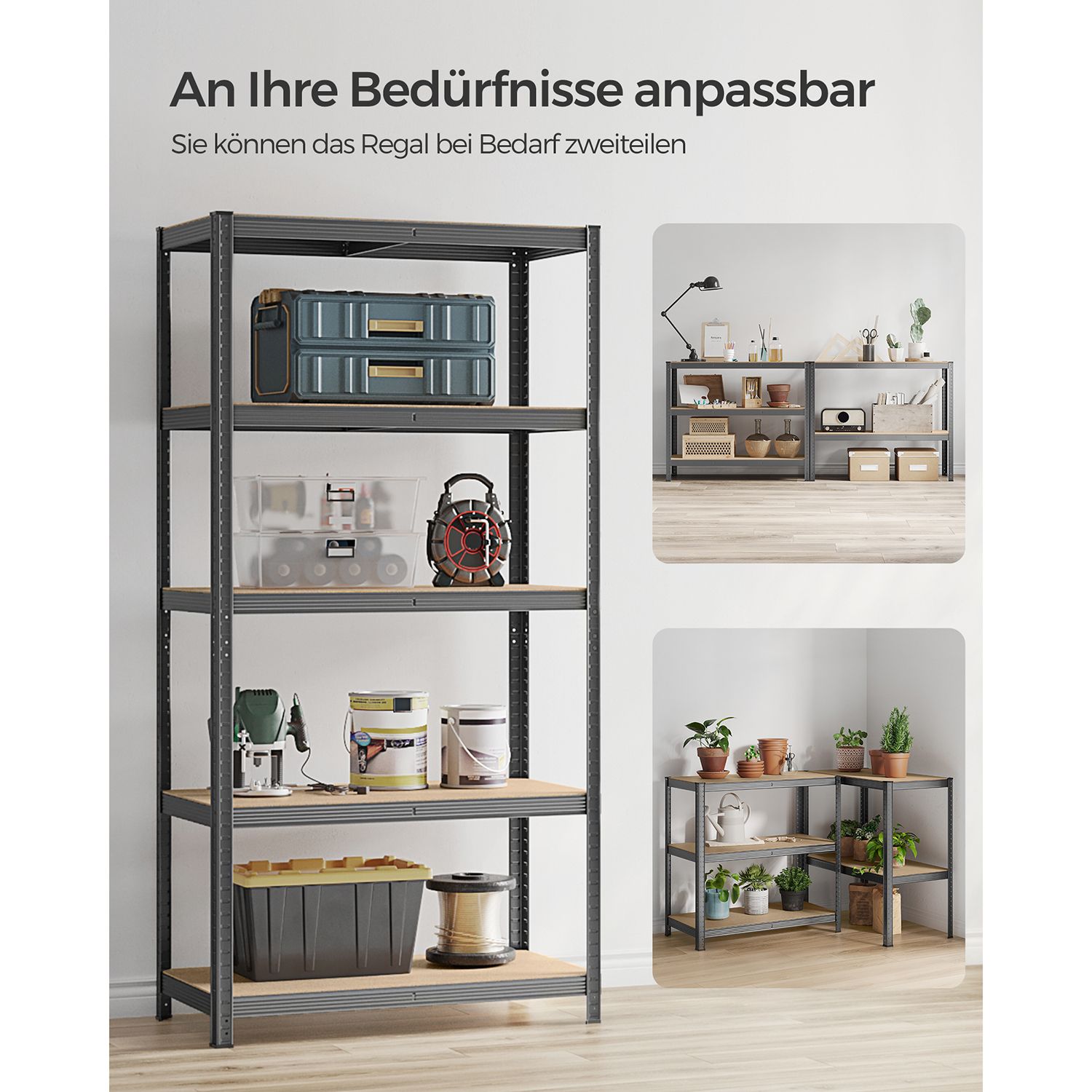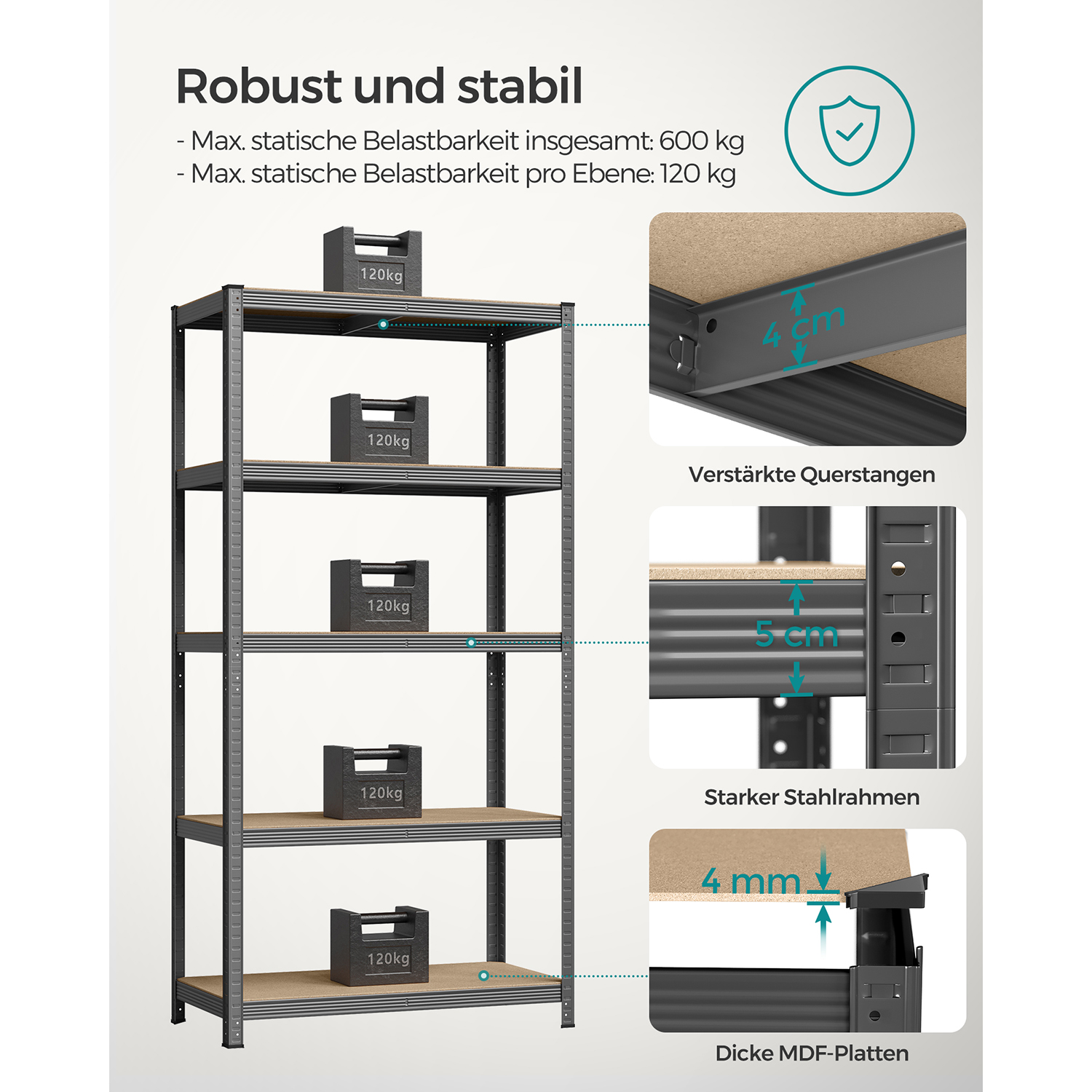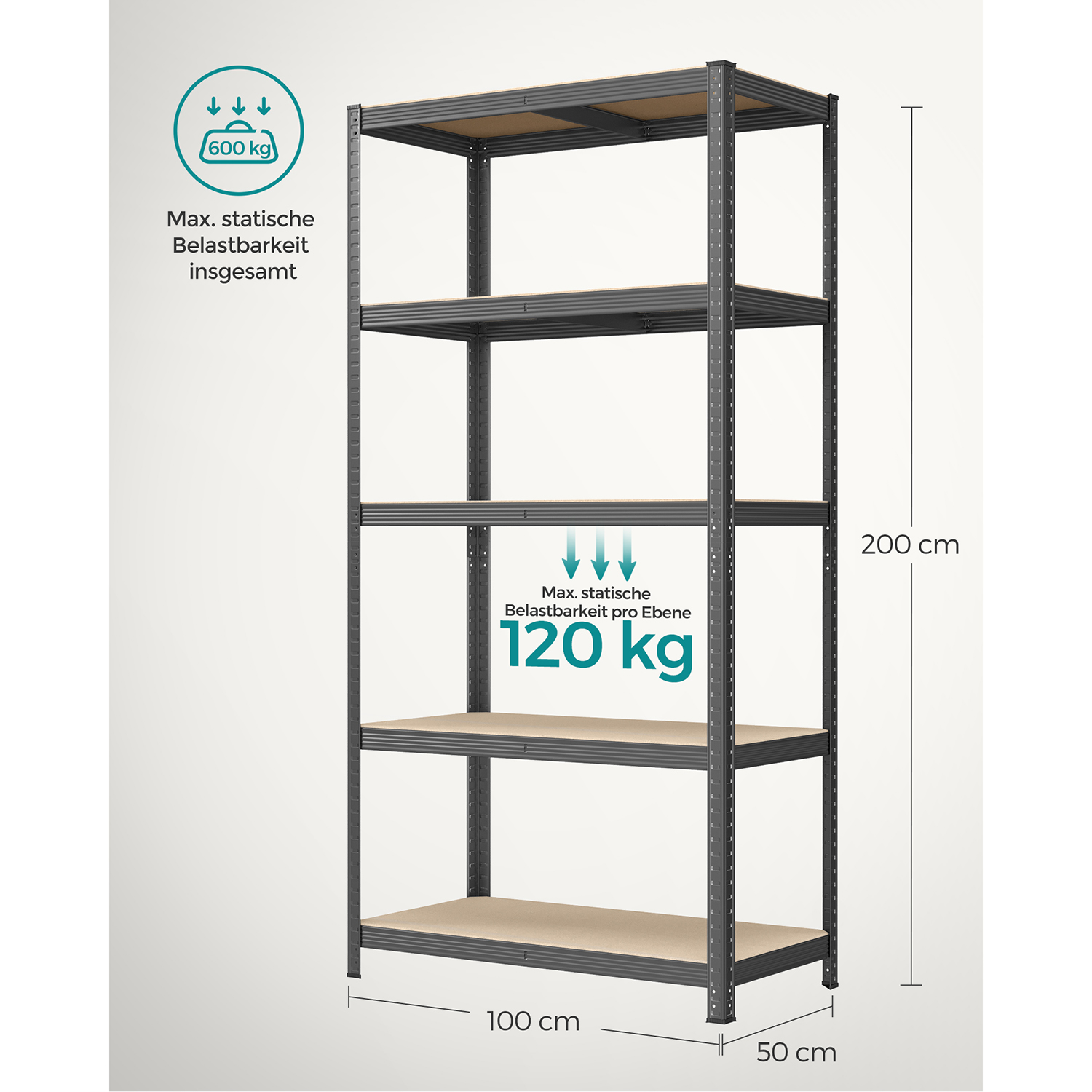 Produktdetaljer: Farve: Gr? Materiale: Pulverlakeret st?l, MDF (MDF) St?rrelse pr. reol: 50 x 100 x 200 cm (D x B x H) V?gt pr. reol: 15,7 kg Maks. statisk belastning pr. hylde: 120 kg Maks. statisk belastning pr. reol i alt: 600 kg Leveringsomfang: 2 x lagerreol 2 x v?ltesikring 1 x vejledning SONGMICS Bem?rkninger:Fastg?r produktet til v?ggen med den medf?lgende v?gbeskyttelse for at sikre sikkerheden under brug. Brug altid handsker under monteringen. Placer ikke produktet i et fugtigt milj?.Den maksimale belastning i teksten refererer til den maksimale statiske v?gt. For at lette transporten leveres produktet i 2 pakker. Disse ankommer normalt samtidig. V?r t?lmodig, hvis du f?rst modtager ?n pakke. Den anden pakke b?r ankomme kort tid efter.