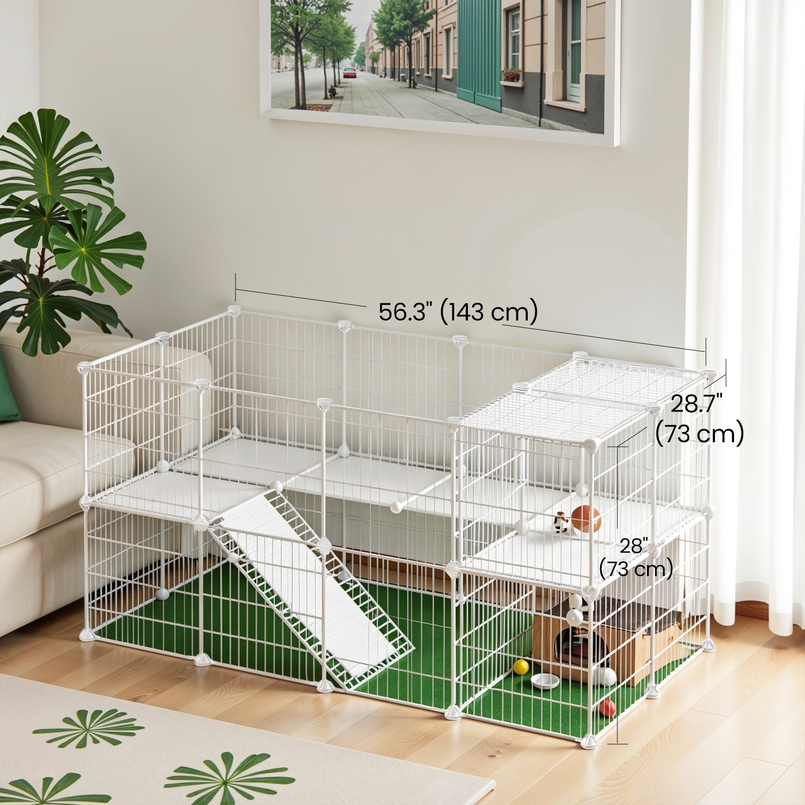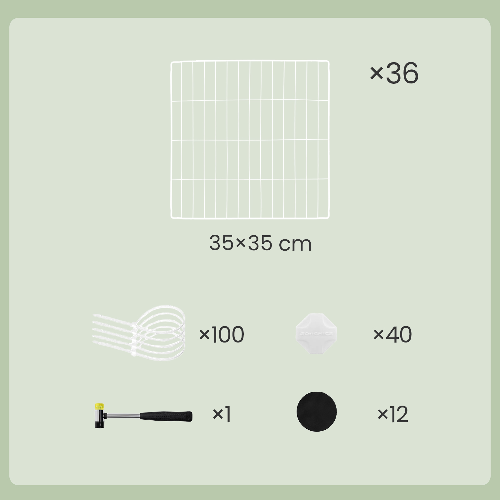 N?r dine k?ledyr har det godt, vil de over?se dig med k?rlighed. Brug dette gitterbur fra SONGMICS til at give dit k?ledyr en ?ben, rummelig og alligevel godt beskyttet legeplads. S? vil din lille pelsbold f?le din gunst og kunne boltre sig ud. K?ledyr er familiemedlemmer: Det bur til sm? dyr, vi har designet, kan tilpasses dit k?ledyrs behov. Du kan sammens?tte de 36 jerngitter (35 x 35 cm (L x H)) og de 40 ABS-plastforbindelsesstykker til forskellige former. Placer dyreleget?j, en hyggelig seng og en sk?l med vand i l?beg?rden, og skab et kongerige for dit k?ledyr.En sikkerhedszone for din k?ledyr: H?jkvalitets ABS-forbindelsesstykker giver gitterburet en h?j grad af stabilitet. For at ?ge stabiliteten yderligere medf?lger der 100 kabelbindere, der forhindrer, at hegnet kollapser under brug.G?r din firbenede ven glad med denne k?ledyrspark fra SONGMICS og giv ham det hjem, han altid har dr?mt om! Produktdetaljer: Farve: Hvid Materiale: Gitterelementer af jern, plastforbindelsesstykker Samlet st?rrelse: 143 x 73 x 71 cm (L x B x H)St?rrelse pr. gitterelement: 35 x 35 cm (L x H)V?gt: 9,3 kgMaks. statisk belastning: 4 kgLeveringsomfang:36 x jernitterplader40 x plastforbindelsesstykker1 x gummihammer12 x skridsikre puder100 x kabelbindere1 x vejledning (DE, EN, FR, ES, IT)SONGMICS Bem?rkninger: L?g venligst en m?tte eller lignende p? gitterpladerne, der fungerer som l?beflade, for at sk?ne dine k?ledyrs poter. Undg? at sl? h?rdt p? produktet, n?r du bruger hammeren. Undg? at bringe produktet i kontakt med skarpe eller spidse genstande, s?t dig ikke p? buret, og hold det v?k fra varmekilder.Stil ikke produktet permanent udend?rs. S?rg for, at alle gitterelementer er skubbet helt ind i plastforbindelsesstykkerne under monteringen. Vi anbefaler, at du bruger skridsikre puder for at sikre, at buret st?r mere stabilt. Det anbefales at kl?be de skridsikre puder p? forbindelsesstykkerne i bunden.