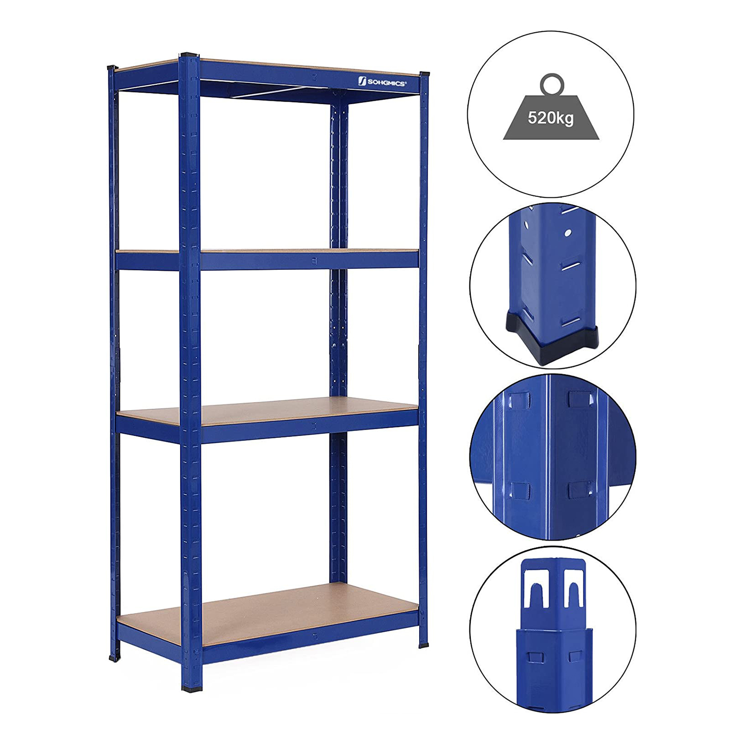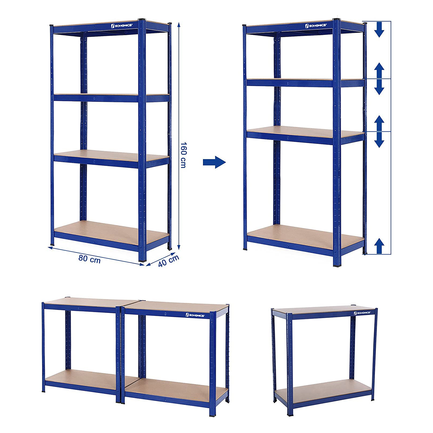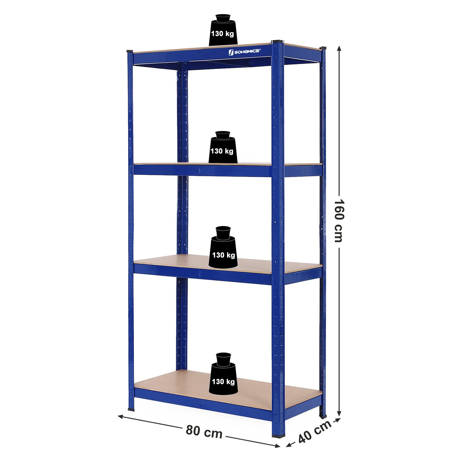 Produktdetaljer: Farve: Bl? Materiale: Pulverlakeret st?l, MDF (medium densitets fiberplade)St?rrelse pr. hylde: 40 x 80 x 160 cm (D x B x H)V?gt pr. hylde: 10,2 kgMaks. statisk belastbarhed pr. hylde: 130 kgLeveringsomfang:2 x lagerhylde2 x vippesikring2 x vejledningSONGMICS Bem?rkninger:B?r altid handsker under montering.Placer ikke produktet i et fugtigt milj?.Den maksimale belastning i teksten refererer til den maksimale statiske v?gt.