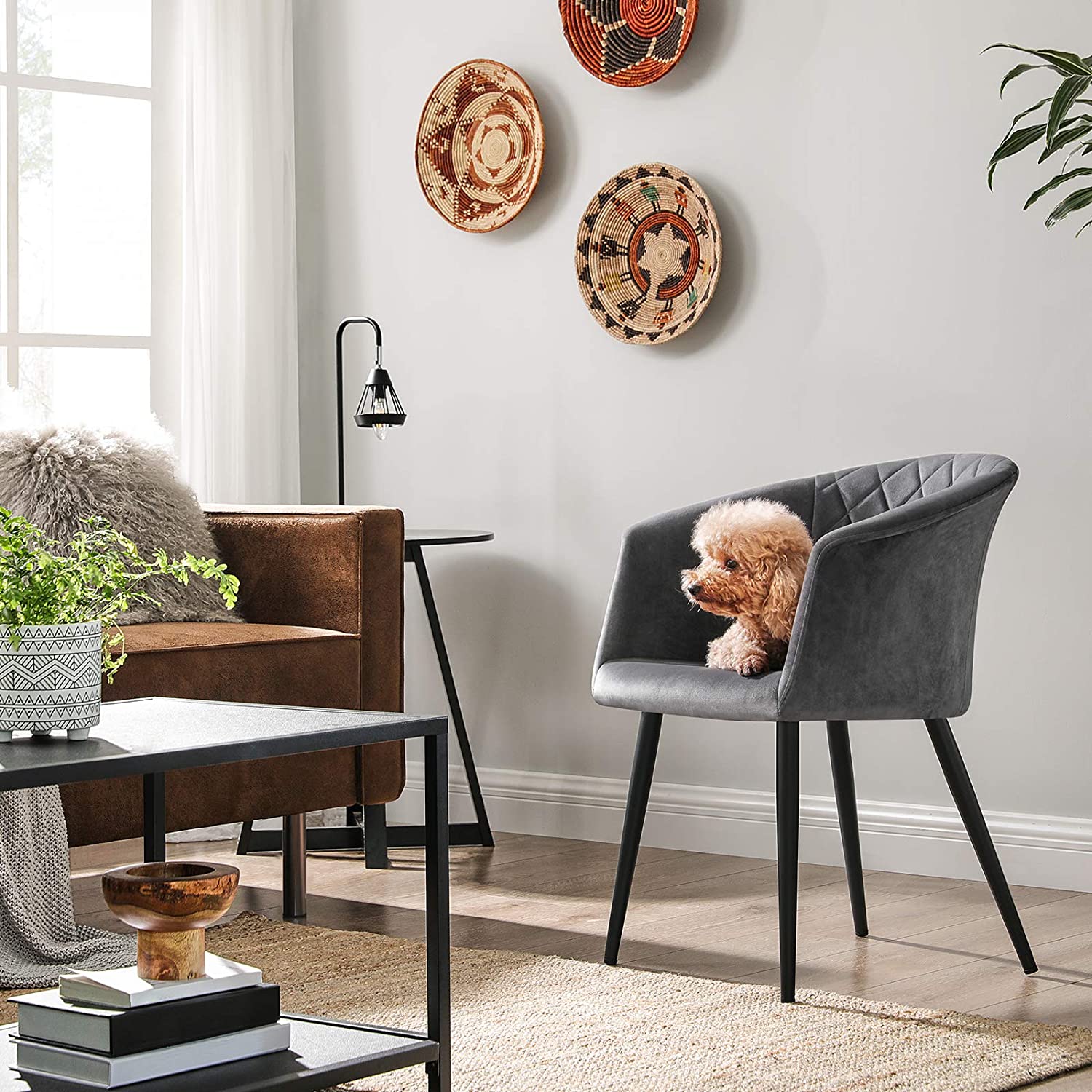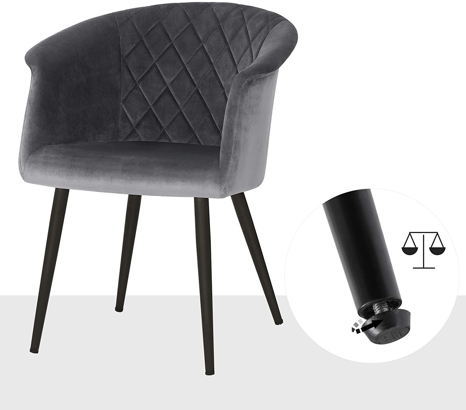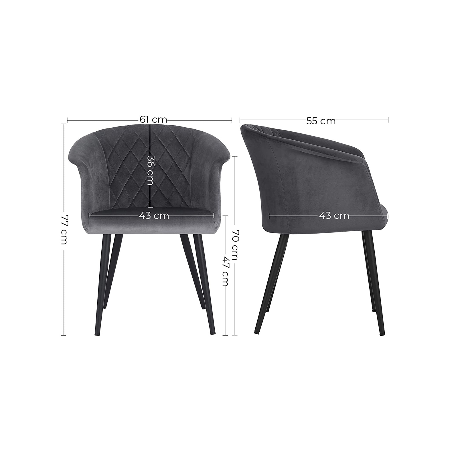 Pr?v lidt hygge: Ergonomisk design, bl?d skumpolstring, velourbetr?k i h?j kvalitet og holdbare metalben ? alle disse materialer udg?r en solid og behagelig stol. Endnu bedre: Stolen har ogs? et flot udseende, der skaber en behagelig atmosf?re i ethvert rum. Altid ved din side: Uanset hvor du vil sidde og slappe af, st?r denne polstrede stol klar til dig. Uanset om det er i spisestuen, stuen, sovev?relset, arbejdsv?relset eller til solbadning p? altanen, er denne stol altid velegnet til afslappende stunder.Produktdetaljer: Farve: Gr? Materiale: Pulverlakerede metalben, tr?plade, velour, skumpolstring Samlet st?rrelse: 61 x 55 x 77 cm (L x B x H) S?deh?jde: 47 cm S?debredde: 43 cm S?dedybde: 43 cm Rygl?nsh?jde: 36 cm Arml?nsh?jde: 70 cm Tykkelsen af s?depolstringen: 6 cm V?gt: 6,2 kg Maks. statisk belastning: 110 kg Leveringsomfang: 2 x stol 2 x tilbeh?rspakke 2 x vejledning (DE, EN, FR, ES, IT) SONGMICS Bem?rkninger: Uds?t ikke produktet for direkte sollys.Hold produktet v?k fra spidse eller skarpe genstande for at undg? skader. St? ikke p? stolen og brug den ikke som trin eller stige. T?r stolen straks af med en t?r klud, hvis den bliver v?d. Stil stolen p? et plant underlag.