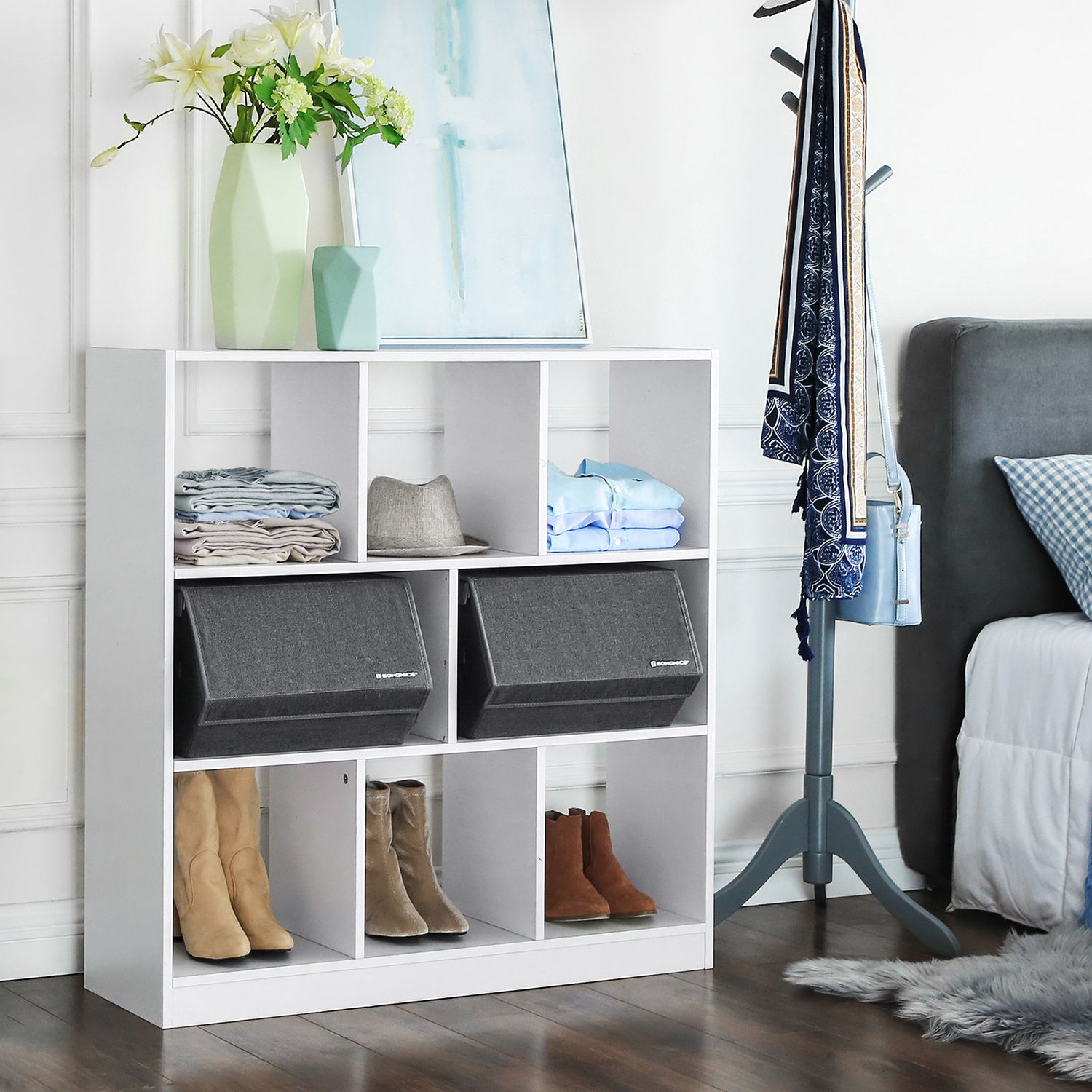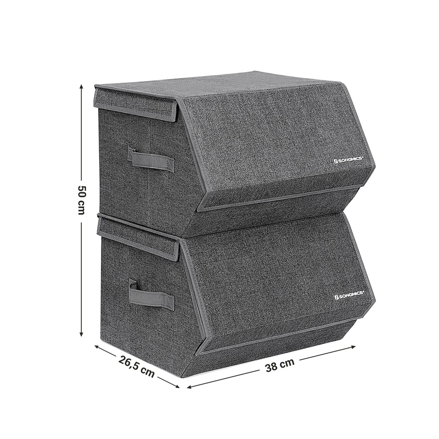 SONGMICS opbevaringskasser tilbyder dig smarte opbevaringsl?sninger, s? du kan skabe mere plads i dit kl?deskab, p? din hylde osv. Med metalringen og velcrolukningerne p? bagsiden kan flere opbevaringskasser stables oven p? hinanden, og de kan ikke deformeres, selv under stor belastning. Det opklappelige l?g med magnetlukning g?r det nemt at tage ting ud og l?gge ting ind. I disse kasser kan du nemt opbevare dagligdagsartikler og skabe orden i dit skab. Hvad venter du p?? Du vil ikke fortryde dit k?b. Produktdetaljer: – Farve: Gr?-beige – Materiale: Imiteret linned, 80 g/m? ikke-v?vet stof, jernramme, 3 mm pap – St?rrelse: 38 x 35 x 25 cm (L x B x H) – V?gt pr. kasse: 3 kg – Maks. statisk belastning pr. kasse: 10 kg Leveringsomfang:- 2 x opbevaringsboks – 1 x vejledning (DE, EN, FR, ES, IT) SONGMICS bem?rkninger: – Produktet kan ikke vaskes. Snavs kan t?rres af med en fugtig klud, hvorefter boksen skal t?rre p? et luftigt sted.- Det kan v?re, at produktet har en let lugt, n?r det pakkes ud. I s? fald skal du placere det p? et godt ventileret sted i et par timer.