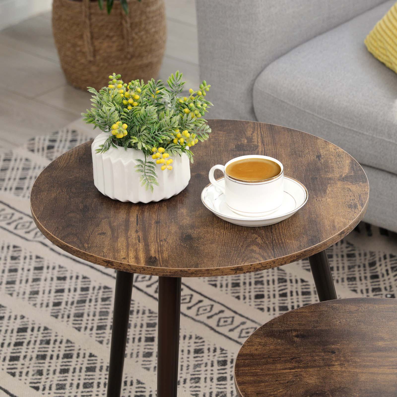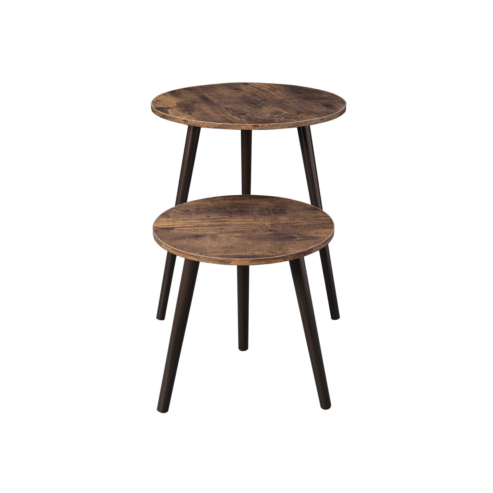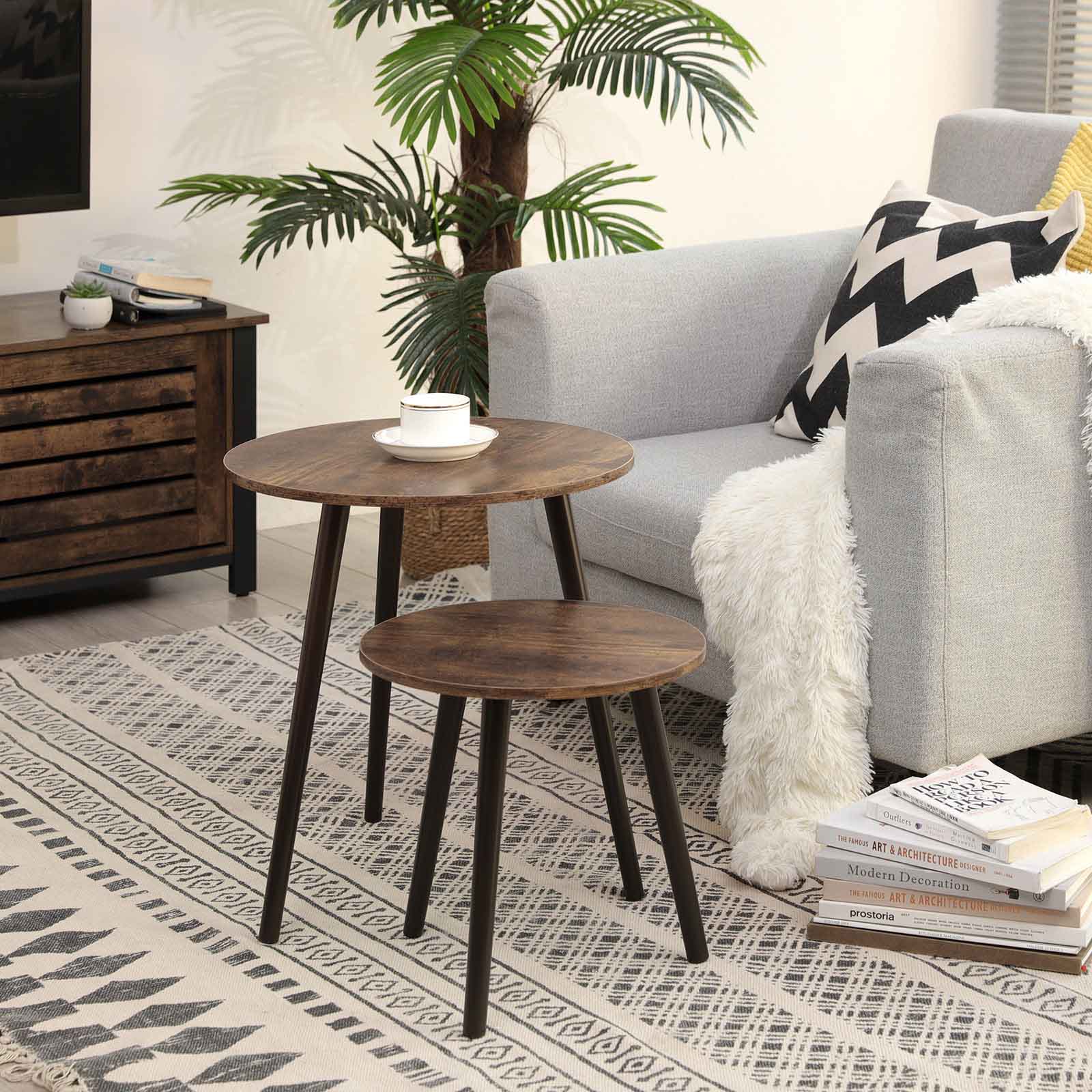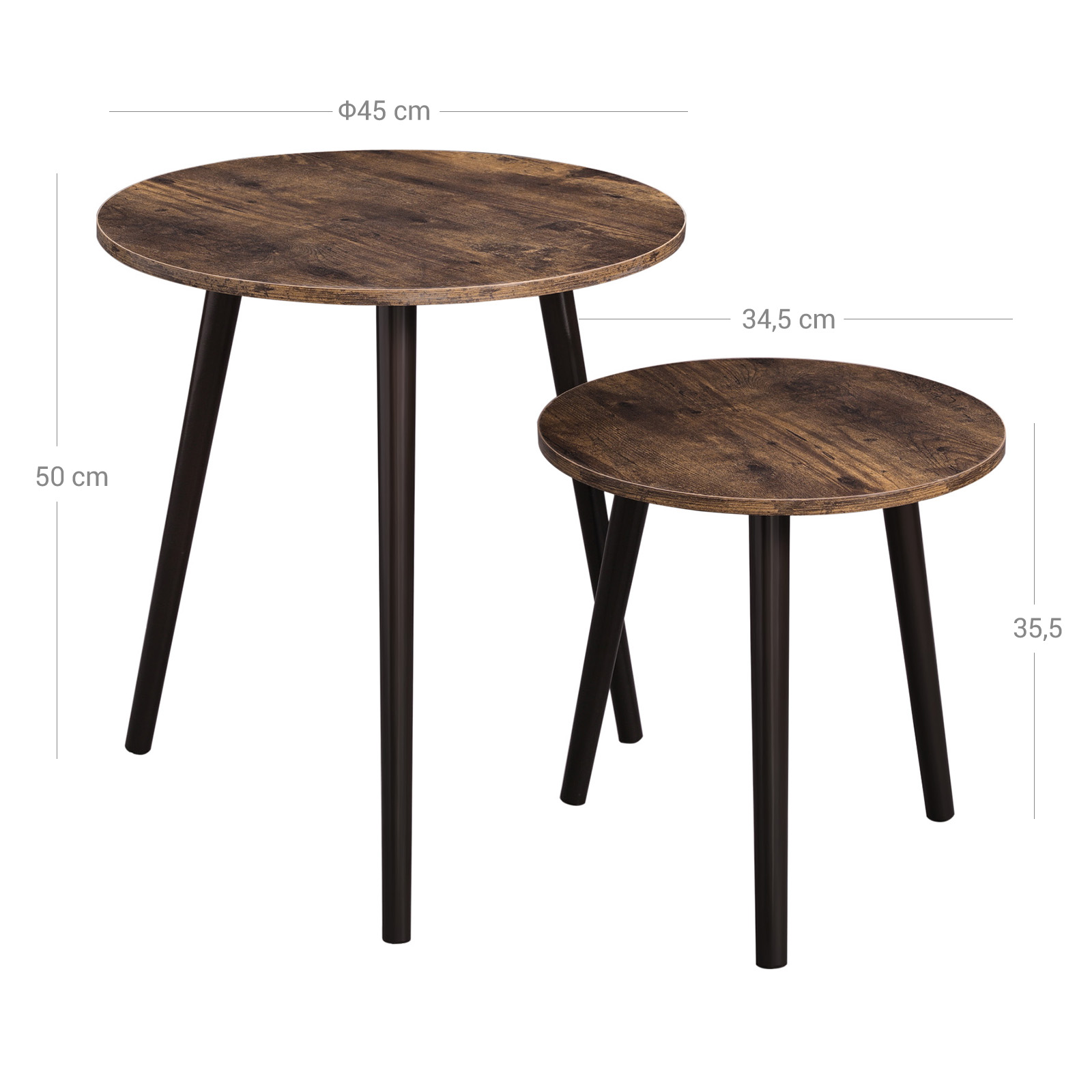 Produktdetaljer: Farve: M?rkebrun/vintage Materiale: MDF, ben af fyrretr? St?rrelse p? det store bord: 45 x 50 cm (? x H) St?rrelse p? det lille bord: 34,5 x 35,5 cm (? x H) Samlet v?gt: 4,25 kg Leveringsomfang: 2 x sofabord 1 x tilbeh?rspose 1 x vejledning (DE, EN, FR, ES, IT) SONGMICS Bem?rkninger: Produktet m? ikke st? udend?rs i l?ngere tid. Det er beregnet til indend?rs brug. Brug ikke produktet i fugtige omgivelser. Produktet m? ikke komme i kontakt med skarpe genstande og aggressive kemiske stoffer for at undg? beskadigelse.