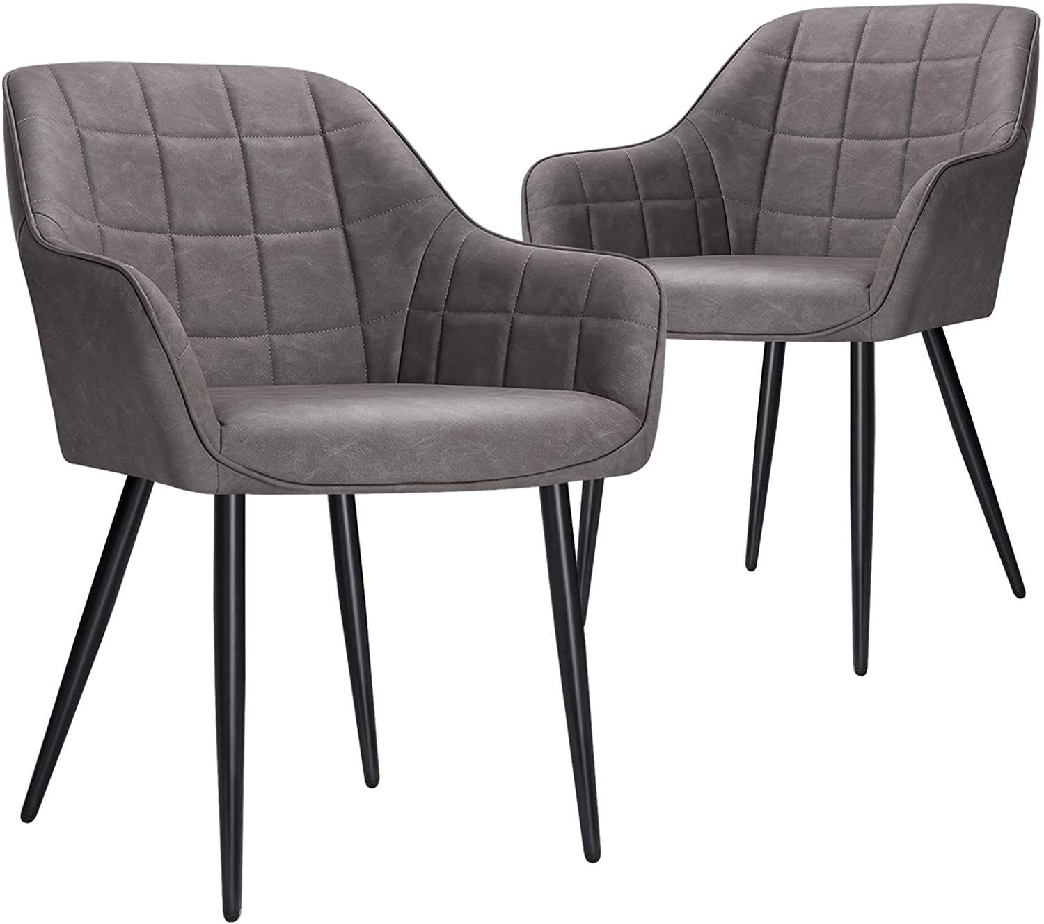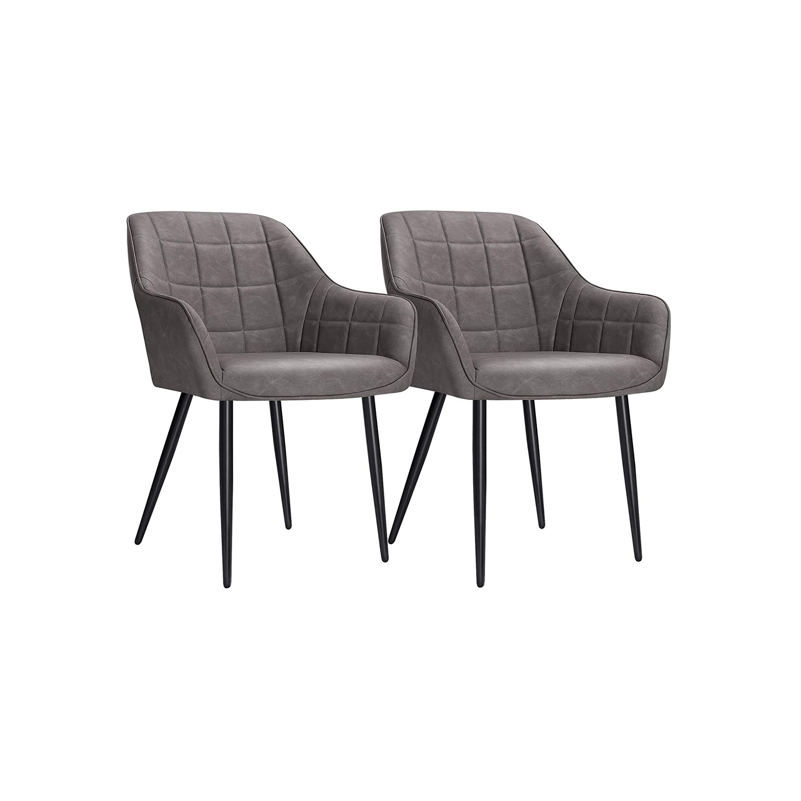 Pr?v lidt hygge: Ergonomisk design, 7 cm tyk skumpolstring, h?jkvalitets PU-betr?k og holdbare metalben med en belastning p? op til 110 kg ? disse elementer skaber de solide og komfortable stole. Endnu bedre: Stolene har ogs? et flot udseende, der skaber en behagelig atmosf?re i ethvert rum.Altid ved din side: Uanset hvor du vil sidde og slappe af, st?r disse polstrede stole klar til dig. Uanset om det er i spisestuen, stuen, sovev?relset, arbejdsv?relset eller til solbadning p? altanen, er disse stole altid velegnede til afslappende stunder. Produktdetaljer: Farve: Gr? Materiale: Pulverlakerede metalben, tr?plade, PU, skumpolstring St?rrelse pr. stol: 62,5 x 60 x 85 cm (L x B x H)S?deh?jde: 50 cmS?debredde: 49 cmS?dedybde: 44,5 cmH?jde p? rygl?n: 39,5 cmH?jde p? arml?n (fra gulvet): 64 cm Tykkelsen af s?depolstringen: 7 cm V?gt: 6,5 kg Maks. statisk belastning pr. stol: 110 kg Leveringsomfang: 2 x stol 2 x tilbeh?rspakke 2 x vejledning SONGICs bem?rkninger: Uds?t ikke produktet for direkte sollys. Hold produktet v?k fra spidse eller skarpe genstande for at undg? skader.Stolene m? ikke bruges som trin eller stige. T?r stolene af med en t?r klud, hvis de bliver v?de. Stolene skal placeres p? et plant underlag. En gulvm?tte under stolene kan beskytte dit parketgulv.