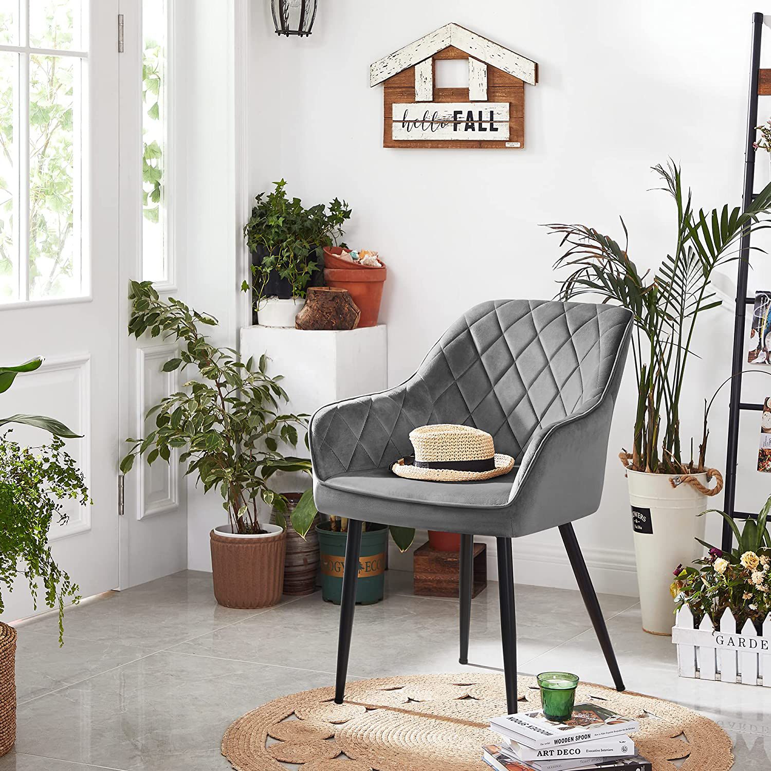Pr?v lidt hygge: Ergonomisk design, 7 cm tyk skumpolstring, h?jkvalitets velourbetr?k og holdbare metalben med en belastning p? op til 110 kg ? disse elementer skaber de solide og komfortable stole. Endnu bedre: Stolene har ogs? et flot udseende, der skaber en behagelig atmosf?re i ethvert rum.Altid ved din side: Uanset hvor du vil sidde og slappe af, st?r disse polstrede stole klar til dig. Uanset om det er i spisestuen, stuen, sovev?relset, arbejdsv?relset eller til solbadning p? altanen, er disse stole altid velegnede til afslappende stunder. Produktdetaljer: Farve: Lysegr? Materiale: Pulverlakerede metalben, tr?plade, velour, skumpolstring St?rrelse pr. stol: 62,5 x 60 x 85 cm (L x B x H)S?deh?jde: 50 cmS?debredde: 49 cmS?dedybde: 44,5 cmH?jde p? rygl?n: 39,5 cmH?jde p? arml?n (fra gulvet): 64 cm Tykkelsen af s?depolstringen: 7 cm V?gt: 6,5 kg Maks. statisk belastning pr. stol: 110 kg Leveringsomfang: 2 x stol 2 x tilbeh?rspakke 2 x vejledning SONGICs bem?rkninger: Uds?t ikke produktet for direkte sollys. Hold produktet v?k fra spidse eller skarpe genstande for at undg? skader.Stolene m? ikke bruges som trin eller stige. T?r stolene af med en t?r klud, hvis de bliver v?de. Stolene skal placeres p? et plant underlag. En gulvm?tte under stolene kan beskytte dit parketgulv.