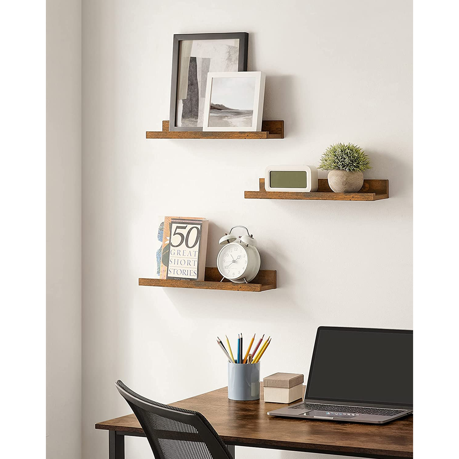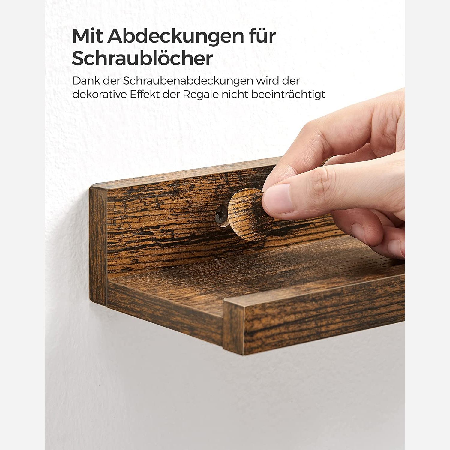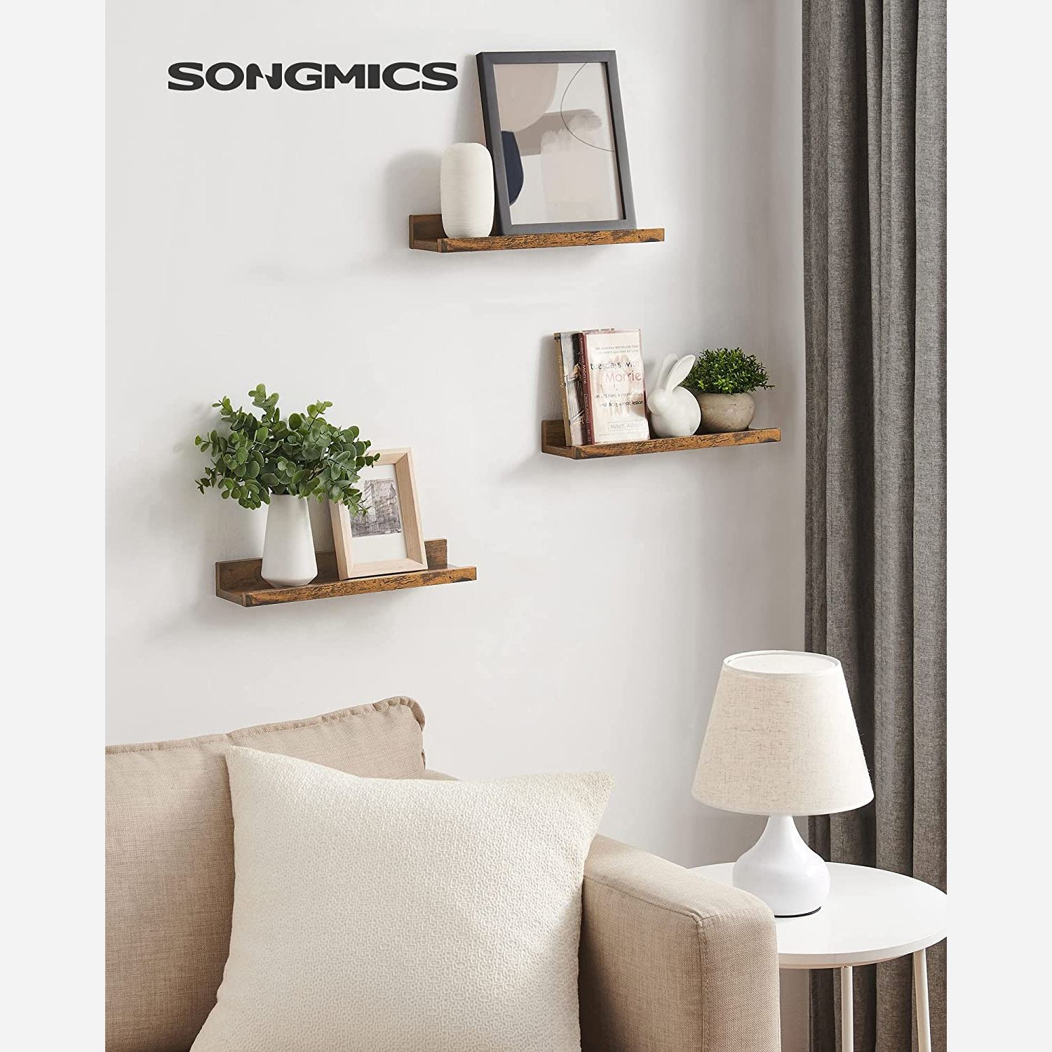 Produktdetaljer: – Farve: Vintagebrun – Materiale: Sp?nplade – St?rrelse pr. hylde: 10 x 38 x 5/2 cm (D x B x H) – Samlet v?gt: 1,6 kg – Maks. statisk b?reevne pr. hylde: 5 kg Leveringsomfang: – 3 x v?ghylde – 1 x tilbeh?rspakke – 1 x vejledning SONGMICS Bem?rkninger:- Hav en elektrisk boremaskine, et vaterpas og en hammer klar for at lette monteringen. – Monter den sv?vende hylde p? massive beton- eller murstensv?gge. Hvis du ?nsker at montere produktet p? gipsv?gge, skal du k?be passende skruer i en specialforretning. Ved montering p? en gipsv?g er produktets b?reevne kun halvt s? stor som p? andre v?gtyper.