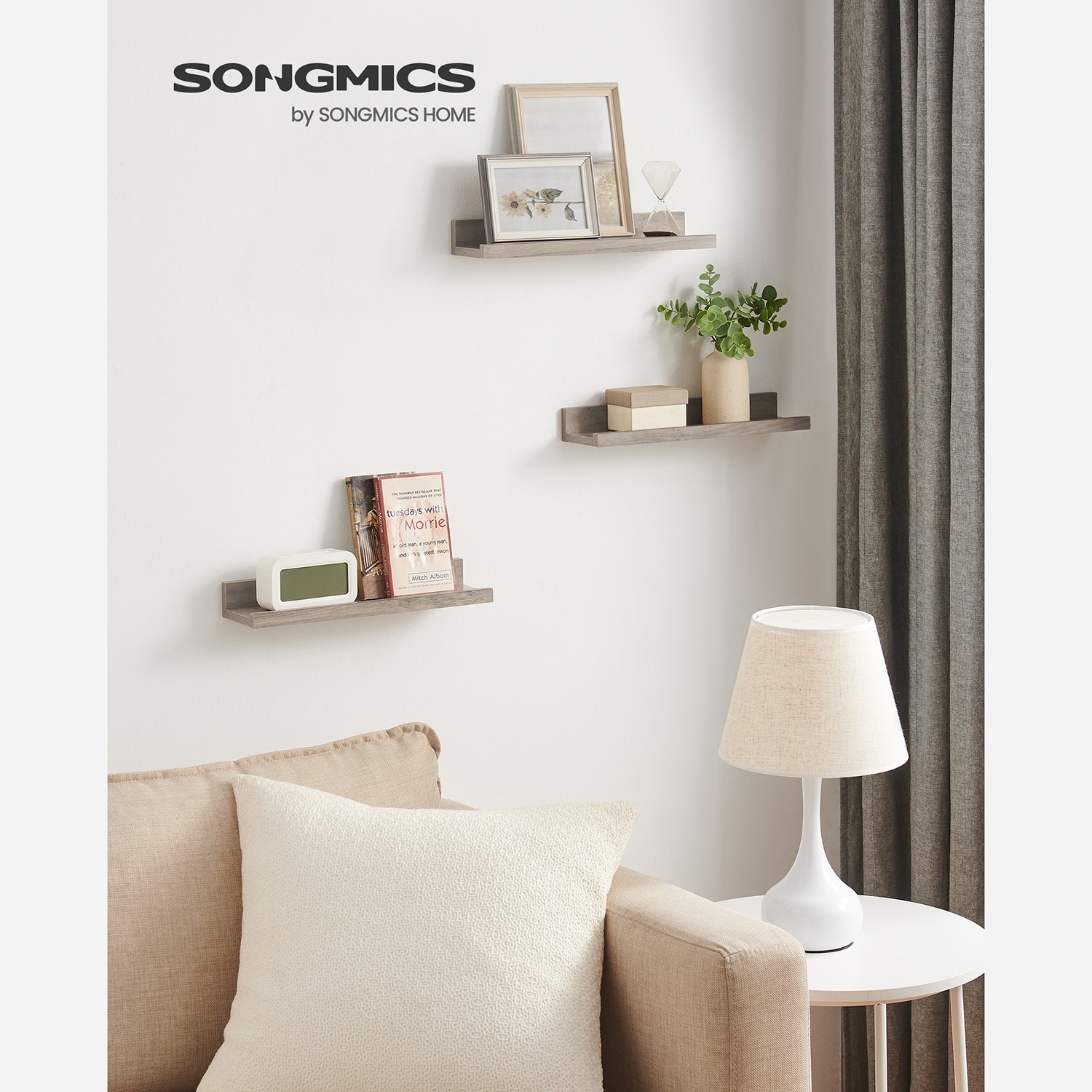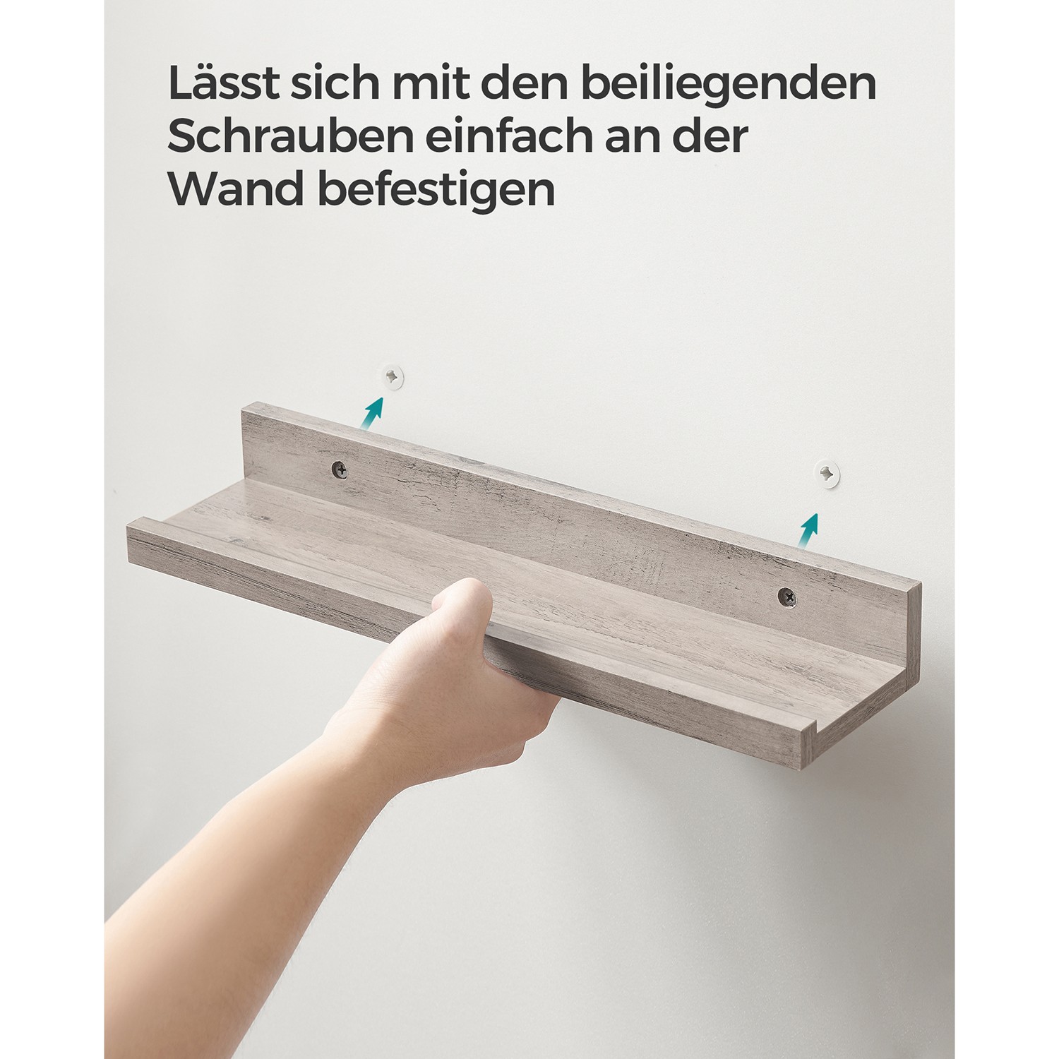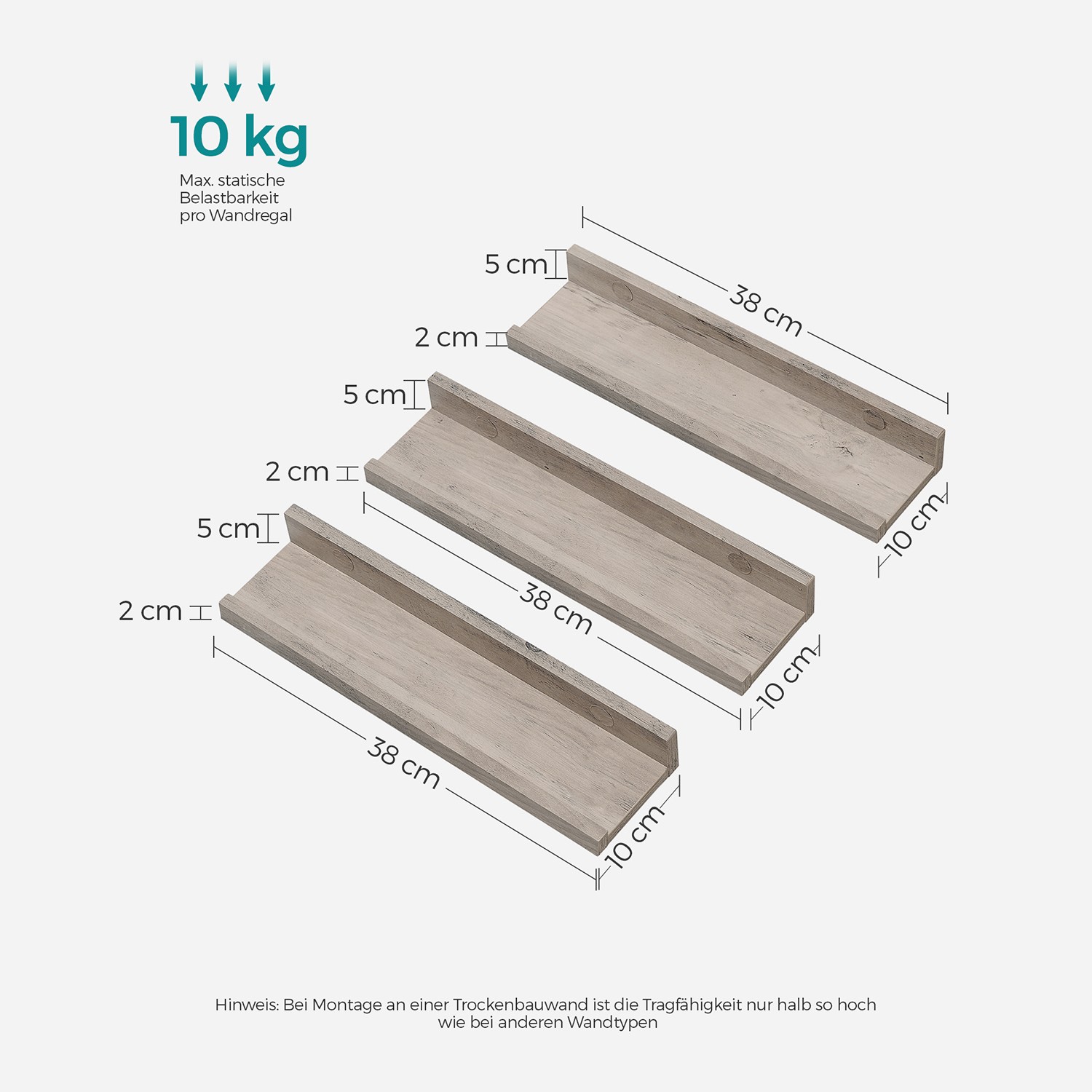 H?jdepunkterne ved disse 3 v?ghylder i oversigt: – Dekorativ: Den gr?brune overflade giver et dekorativt touch. – Fleksibel kombination: Hylderne kan kombineres frit for at give dine tomme v?gge karakter. – Robust og belastbar: K?kkenhylderne er lavet af h?jkvalitets sp?nplader og kan hver b?re en v?gt p? op til 5 kg. – Beskyttelse mod at glide ned: Den forh?jede forkant beskytter dine billedrammer mod at glide ned. – Med skrued?ksler: Takket v?re d?kslerne til skruehullerne forringes hyldernes dekorative effekt ikke. – Pladsbesparende: De sv?vende hylder optager ingen gulvplads og udnytter v?gpladsen optimalt for at skabe ekstra opbevaringsplads. – Nem at montere: Badev?relseshylderne kan nemt monteres p? v?ggen takket v?re de medf?lgende skruer. – Alsidig anvendelse: Hylderne passer perfekt i stuen, hjemmekontoret, badev?relset eller k?kkenet. Produktdetaljer: – Farve: Greige – Materiale: Sp?nplade – St?rrelse pr. hylde: 10 x 38 x 5/2 cm (D x B x H) – Samlet v?gt: 1,6 kg – Maks. statisk belastning pr. hylde: 5 kg Leveringsomfang: – 3 x v?ghylde – 1 x tilbeh?rspakke – 1 x vejledning SONGICs bem?rkninger:- Hav en elektrisk boremaskine, et vaterpas og en hammer klar for at lette monteringen. – Monter den sv?vende hylde p? massive beton- eller murstensv?gge. Hvis du ?nsker at montere produktet p? gipsv?gge, skal du k?be passende skruer i en specialforretning. Ved montering p? en gipsv?g er produktets b?reevne kun halvt s? stor som p? andre v?gtyper.