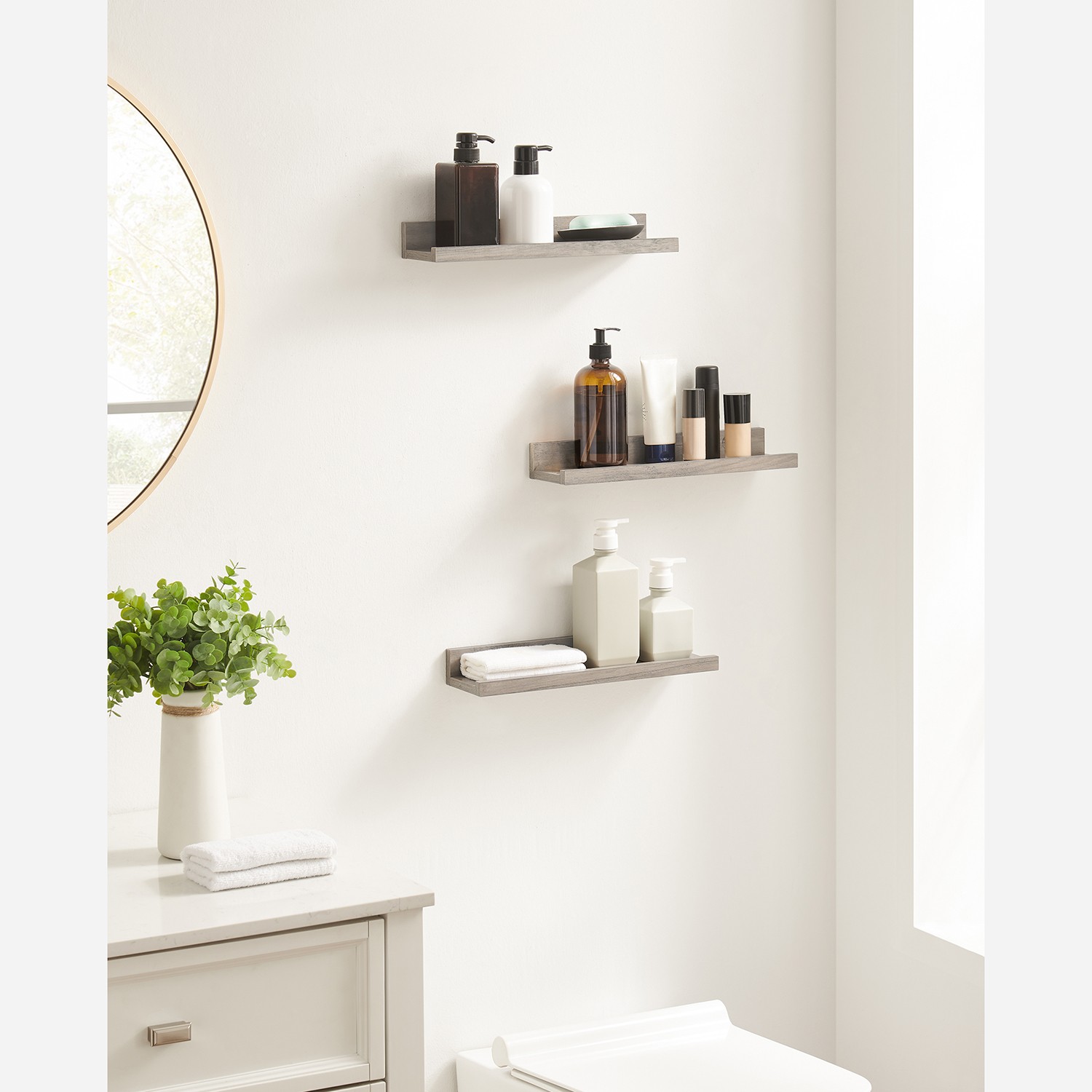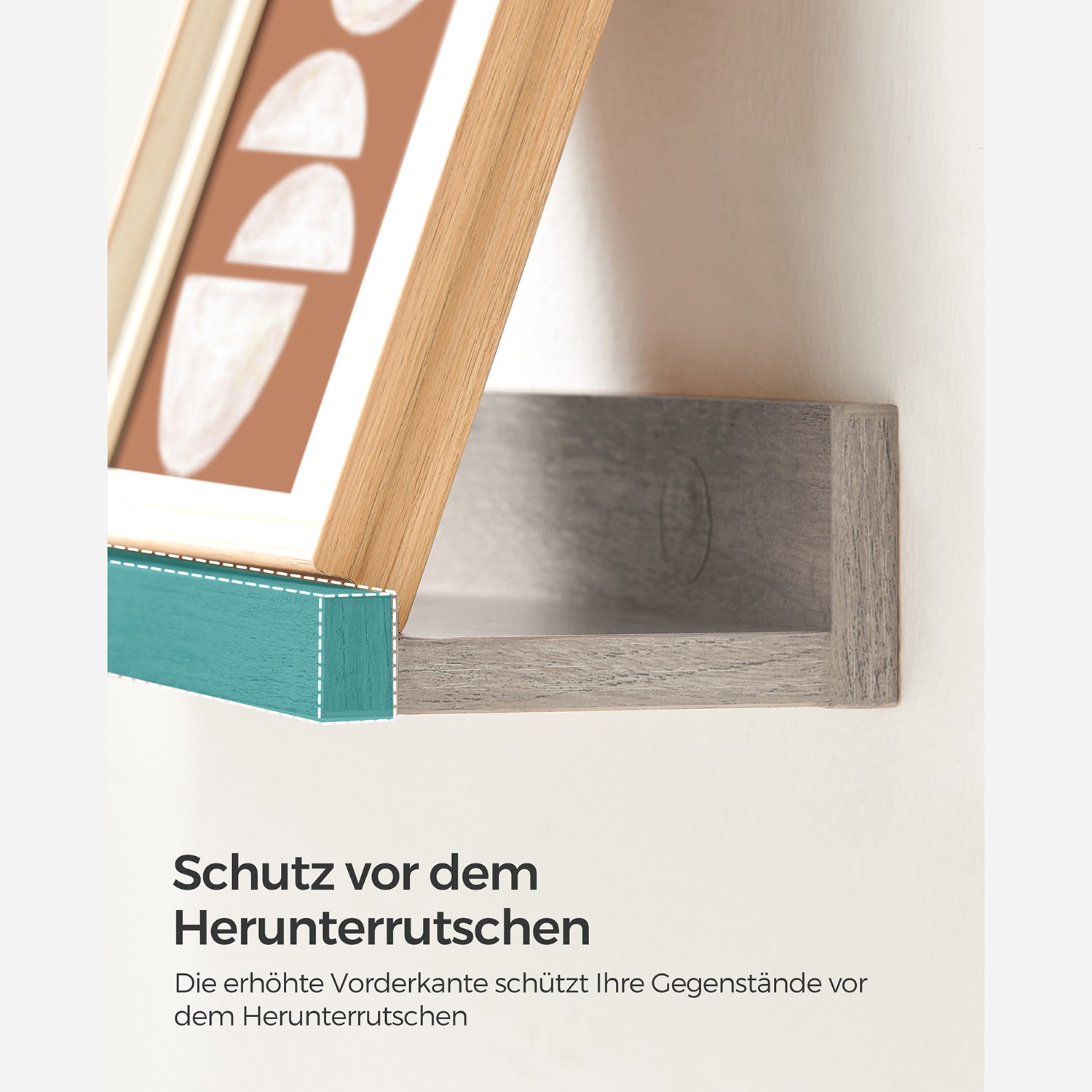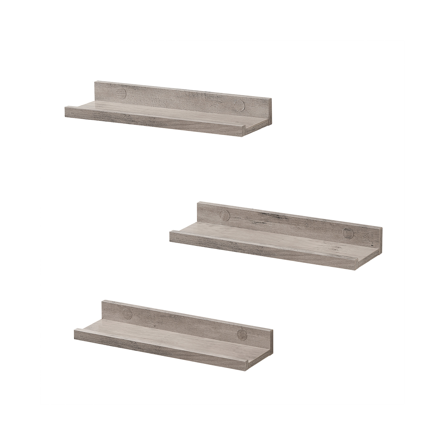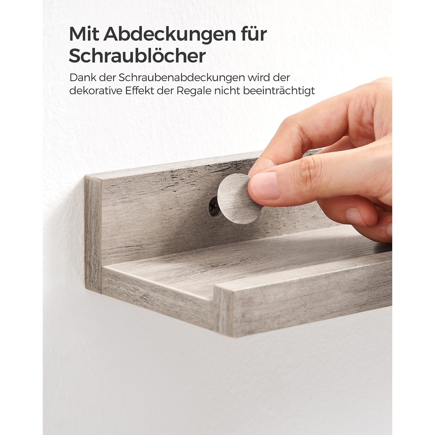H?jdepunkterne ved disse 3 v?ghylder i oversigt: – Dekorativ: Den gr?brune overflade giver et dekorativt touch. – Fleksibel kombination: Hylderne kan kombineres frit for at give dine tomme v?gge karakter. – Robust og belastbar: K?kkenhylderne er lavet af h?jkvalitets sp?nplader og kan hver b?re en v?gt p? op til 5 kg. – Beskyttelse mod at glide ned: Den forh?jede forkant beskytter dine billedrammer mod at glide ned. – Med skrued?ksler: Takket v?re d?kslerne til skruehullerne forringes hyldernes dekorative effekt ikke. – Pladsbesparende: De sv?vende hylder optager ingen gulvplads og udnytter v?gpladsen optimalt for at skabe ekstra opbevaringsplads. – Nem at montere: Badev?relseshylderne kan nemt monteres p? v?ggen takket v?re de medf?lgende skruer. – Alsidig anvendelse: Hylderne passer perfekt i stuen, hjemmekontoret, badev?relset eller k?kkenet. Produktdetaljer: – Farve: Greige – Materiale: Sp?nplade – St?rrelse pr. hylde: 10 x 38 x 5/2 cm (D x B x H) – Samlet v?gt: 1,6 kg – Maks. statisk belastning pr. hylde: 5 kg Leveringsomfang: – 3 x v?ghylde – 1 x tilbeh?rspakke – 1 x vejledning SONGICs bem?rkninger:- Hav en elektrisk boremaskine, et vaterpas og en hammer klar for at lette monteringen. – Monter den sv?vende hylde p? massive beton- eller murstensv?gge. Hvis du ?nsker at montere produktet p? gipsv?gge, skal du k?be passende skruer i en specialforretning. Ved montering p? en gipsv?g er produktets b?reevne kun halvt s? stor som p? andre v?gtyper.