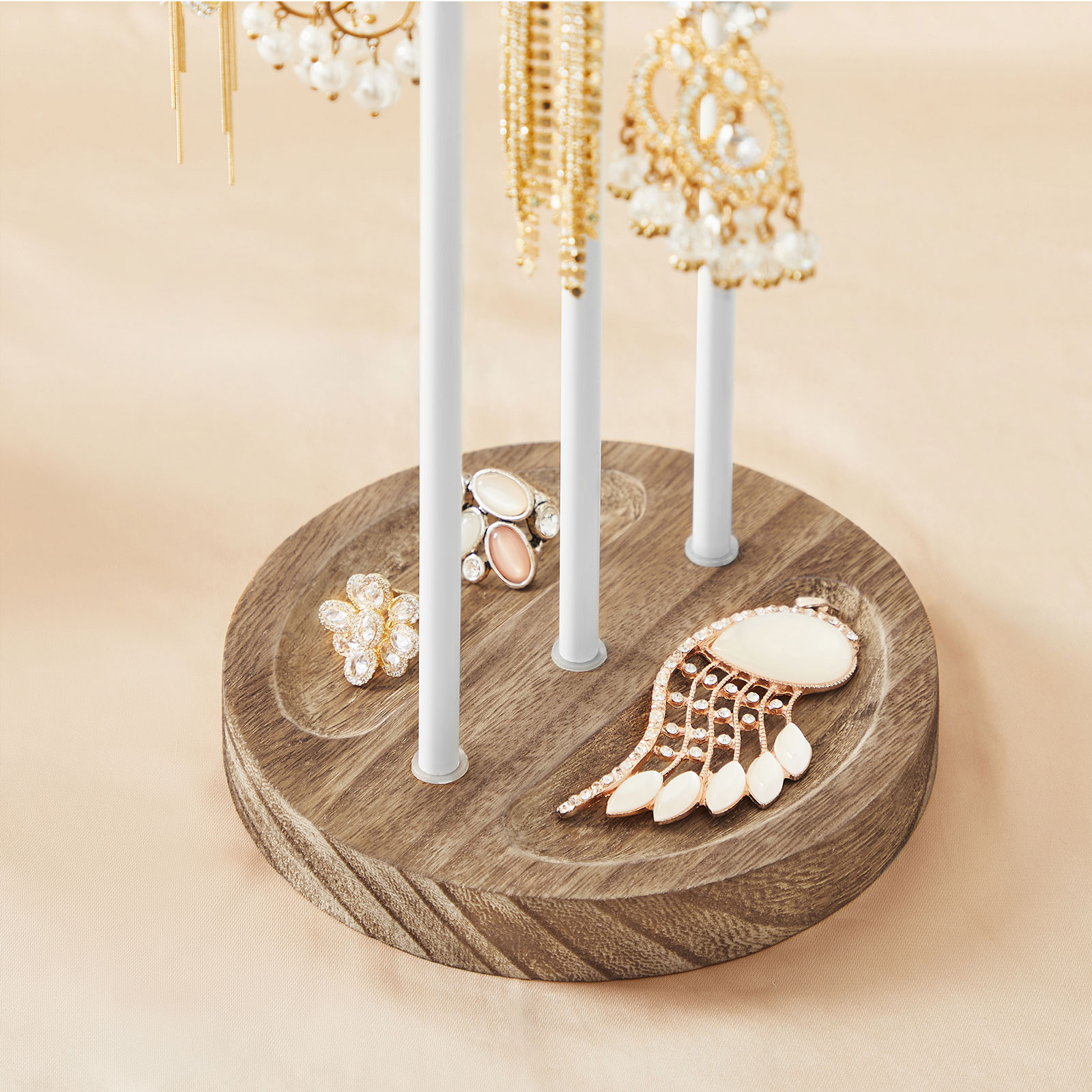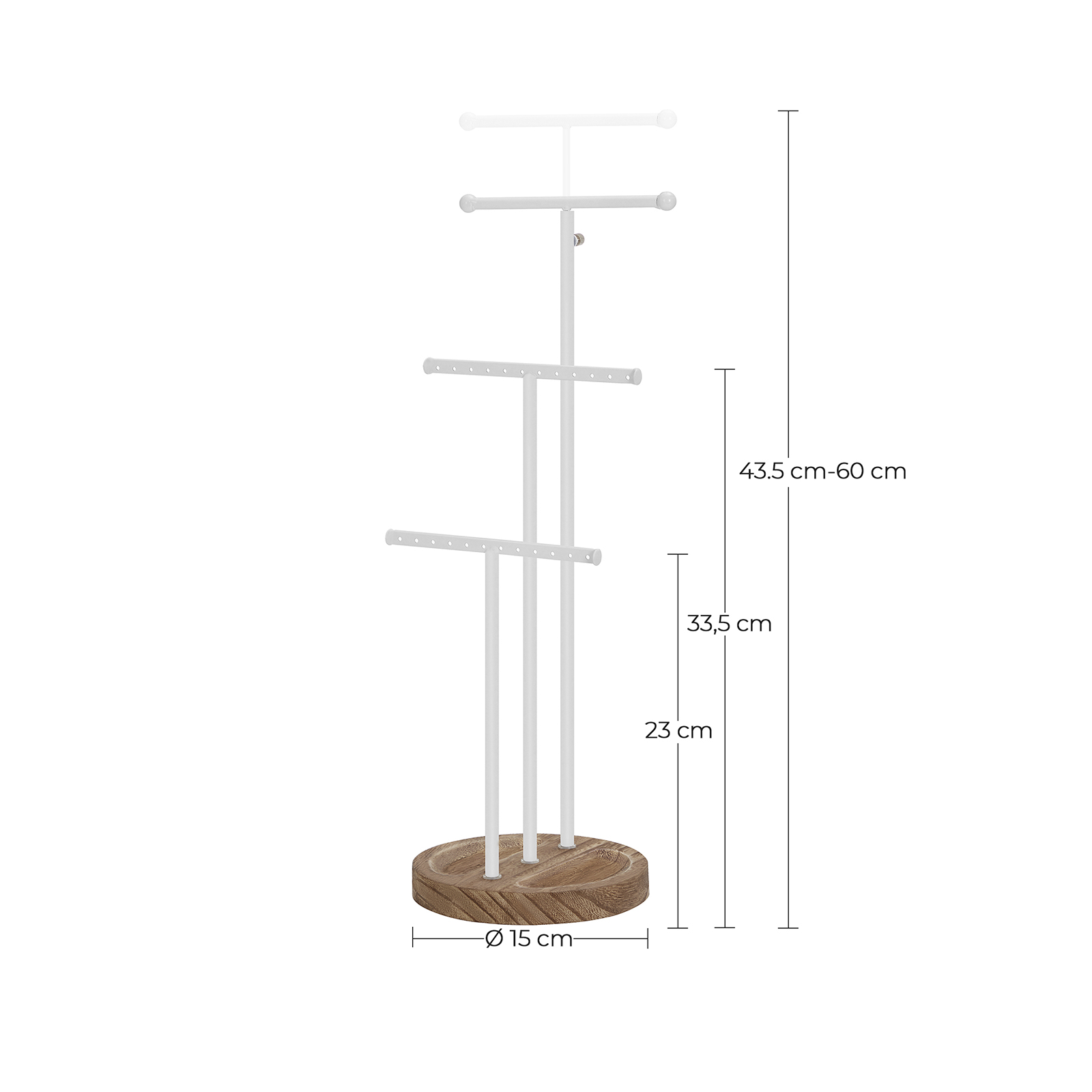 En smykkestativ, tre fordele: 3 robuste st?lst?nger, hvoraf den ene er h?jdejusterbar til l?ngere halsk?der og halsk?der. 24 huller p? de to andre st?nger til ?reringe. 1 fod af massivt tr? fungerer som bakke til opbevaring af sm? skatte som brocher og vedh?ng.Tre trin til et glitrende liv: S?t de 3 st?nger i foden og stil denne smykkestativ p? dit toiletbord eller en kommode i dit sovev?relse. H?ng dine yndlingshalsk?der, armb?nd, ure, ?reringe og ringe, som du v?rds?tter, p? den.Beundre de funklende juveler og diamanter p? denne smykkestativ. Produktdetaljer: Farve: Tr?farvet-hvid Materiale: Tr?, st?l St?rrelse: 15 x 15 x (43,5-60) cm (L x B x H) V?gt: 0,4 kg Leveringsomfang: 1 x smykkestativ 1 x tilbeh?rspakke 1 x vejledning SONGMICS Bem?rkninger:Hvis du vil justere stangens h?jde, skal du f?rst l?sne skruen p? den lodrette stang.