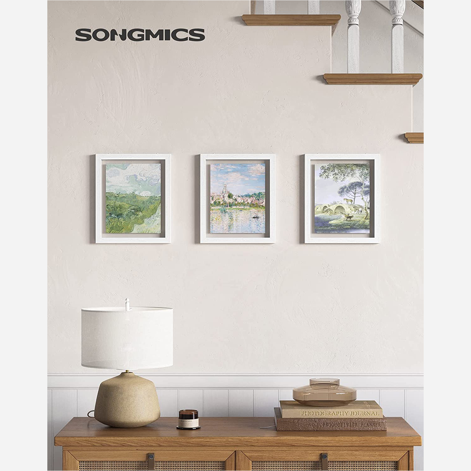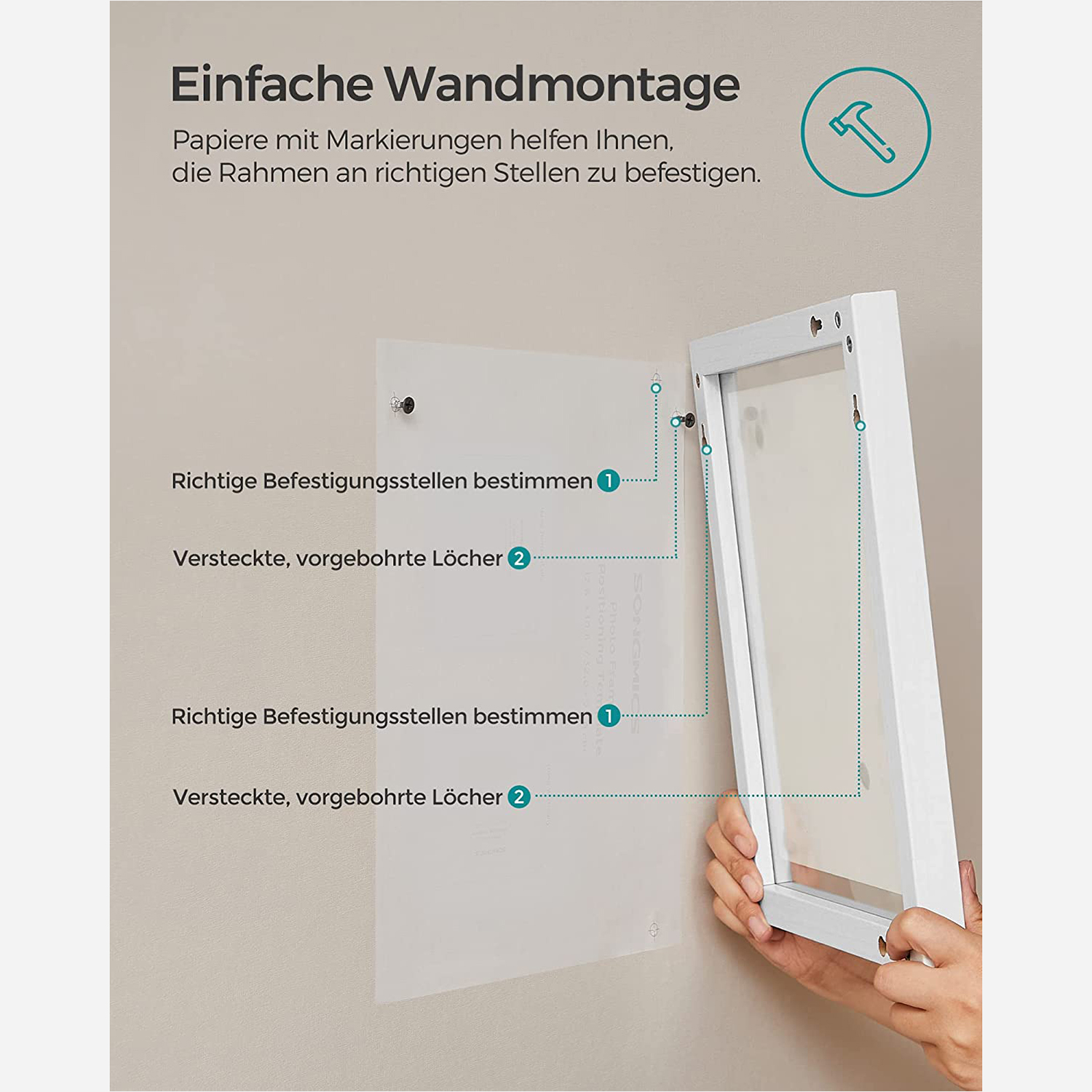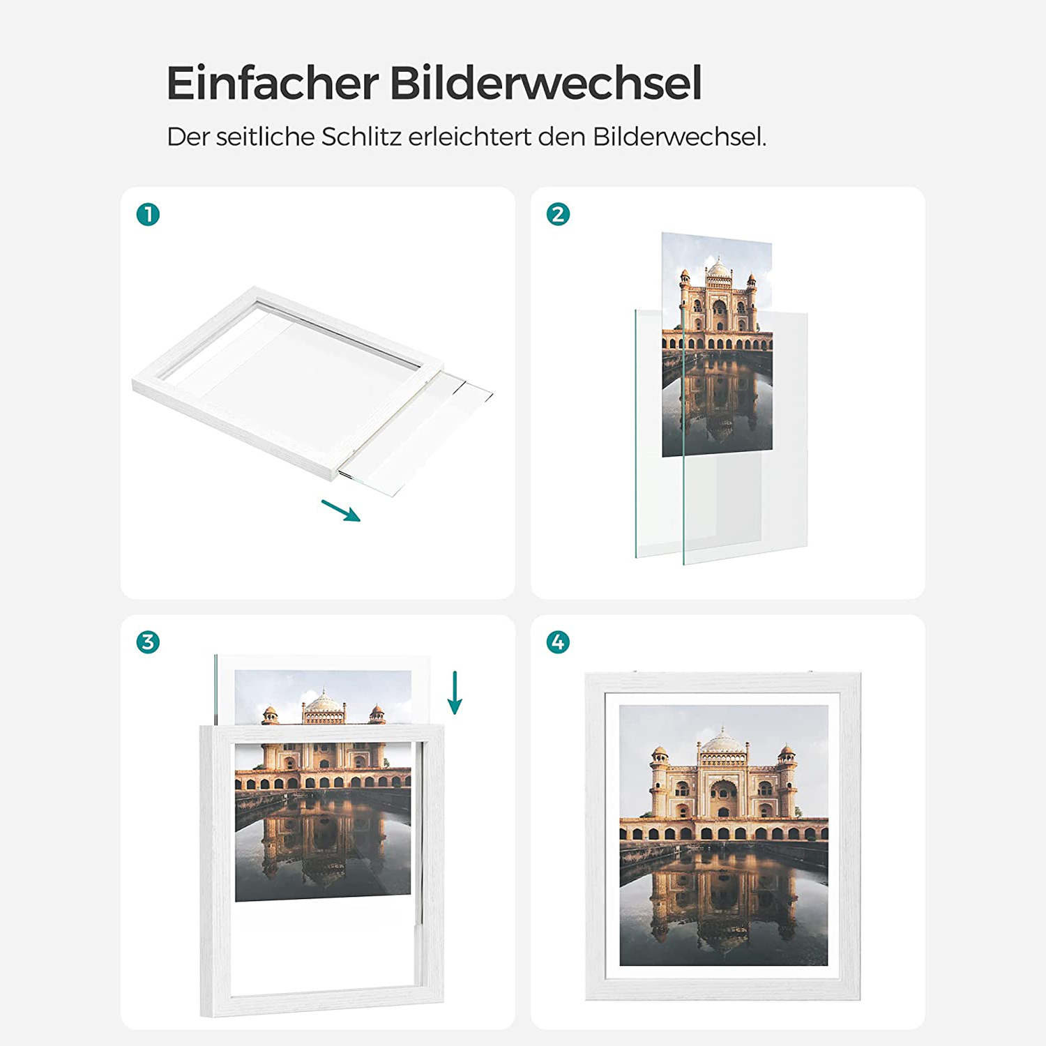 Lad billeder sv?ve: N?r du maler et smukt billede eller tager et fantastisk landskabsfoto, kan du forvandle det til et kunstv?rk med disse billedrammer. Rammerne holder billedet mellem to glasplader, s? det ser ud som om billedet sv?ver i luften. Moderne look, hvid overflade med ?rer ? disse fotorammer passer til forskellige indretningsstilarter. H?jdepunkterne ved disse 3 billedrammer: Billeder i 10,2 x 15,2 cm, 12,7 x 17,8 cm, 15,2 x 20,3 cm og 20,3 x 25,4 cm passer i fotorammerne. 4 anvendelsesmuligheder: Stil dem p? bordet eller h?ng dem op p? v?ggen ? b?de vandret og lodret. De skjulte huller p? bagsiden g?r det muligt at fastg?re rammerne t?t p? v?ggen. 3 medf?lgende papirer med markeringer hj?lper dig med at bestemme, hvor rammerne skal fastg?res p? v?ggen. De medf?lgende metalstativer st?tter fotorammerne, s? de kan st? stabilt p? bordet. Den laterale slids med klemme g?r det muligt at skifte og fastg?re billederne nemt. Rammerne er lavet af h?jkvalitetsglas og MDF, s? du kan se skarpe billeder og bruge rammerne i lang tid. Produktdetaljer: Farve: Hvid Materiale: MDF (medium densitets fiberplade), glas St?rrelse: 32 x 27 cm (L x B) Samlet v?gt: 2,9 kg Leveringsomfang: 3 x billedrammer 6 x metalst?tter 3 x papir med markeringer 4 x kl?bepunkter SONGICs bem?rkninger: Tilbeh?r til fastg?relse af rammerne p? v?ggen er IKKE inkluderet i leveringen. P? grund af de mange forskellige v?gmaterialer, der findes, b?r du bruge monteringsudstyr, der passer til din v?g. Alle kanter p? glasset er slebet for at sikre din sikkerhed, n?r du udskifter billederne. Alligevel b?r du holde b?rn v?k fra dette produkt. Placer produktet p? en plan overflade, eller fastg?r det stabilt til v?ggen.