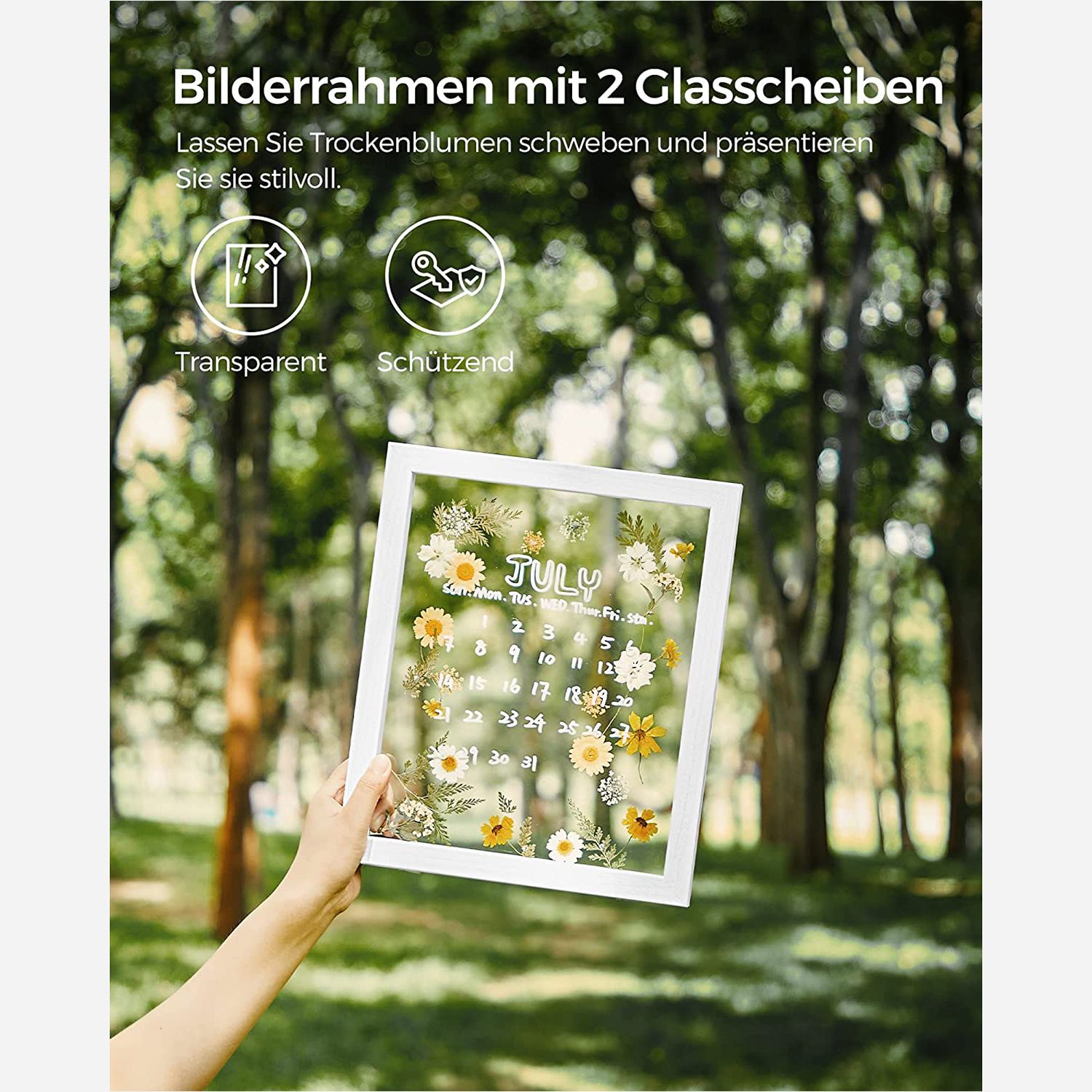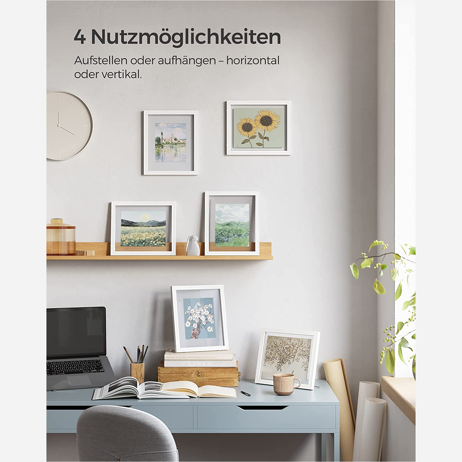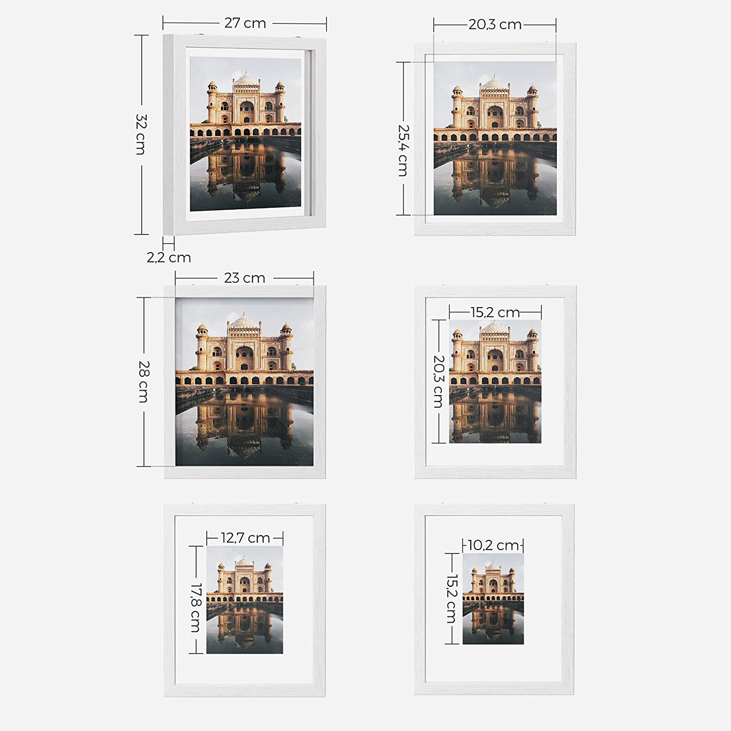 Lad billeder sv?ve: N?r du maler et smukt billede eller tager et fantastisk landskabsfoto, kan du forvandle det til et kunstv?rk med disse billedrammer. Rammerne holder billedet mellem to glasplader, s? det ser ud som om billedet sv?ver i luften. Moderne look, hvid overflade med ?rer ? disse fotorammer passer til forskellige indretningsstilarter. H?jdepunkterne ved disse 3 billedrammer: Billeder i 10,2 x 15,2 cm, 12,7 x 17,8 cm, 15,2 x 20,3 cm og 20,3 x 25,4 cm passer i fotorammerne. 4 anvendelsesmuligheder: Stil dem p? bordet eller h?ng dem op p? v?ggen ? b?de vandret og lodret. De skjulte huller p? bagsiden g?r det muligt at fastg?re rammerne t?t p? v?ggen. 3 medf?lgende papirer med markeringer hj?lper dig med at bestemme, hvor rammerne skal fastg?res p? v?ggen. De medf?lgende metalstativer st?tter fotorammerne, s? de kan st? stabilt p? bordet. Den laterale slids med klemme g?r det muligt at skifte og fastg?re billederne nemt. Rammerne er lavet af h?jkvalitetsglas og MDF, s? du kan se skarpe billeder og bruge rammerne i lang tid. Produktdetaljer: Farve: Hvid Materiale: MDF (medium densitets fiberplade), glas St?rrelse: 32 x 27 cm (L x B) Samlet v?gt: 2,9 kg Leveringsomfang: 3 x billedrammer 6 x metalst?tter 3 x papir med markeringer 4 x kl?bepunkter SONGICs bem?rkninger: Tilbeh?r til fastg?relse af rammerne p? v?ggen er IKKE inkluderet i leveringen. P? grund af de mange forskellige v?gmaterialer, der findes, b?r du bruge monteringsudstyr, der passer til din v?g. Alle kanter p? glasset er slebet for at sikre din sikkerhed, n?r du udskifter billederne. Alligevel b?r du holde b?rn v?k fra dette produkt. Placer produktet p? en plan overflade, eller fastg?r det stabilt til v?ggen.